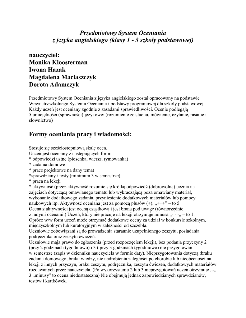 Przedmiotowy System Oceniania z języka angielskiego (klasy 1