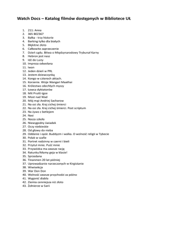 Watch Docs – Katalog filmów dostępnych w Bibliotece UŁ 1. 2. 3. 4. 5. 6. 7. 8. 9. 10. 11. 12. 13. 14. 15. 16. 17. 18. 19. 20. 21. 22. 23. 24. 25. 26. 27. 28. 29. 30. 31. 32. 33. 34. 35. 36. 37. 38. 39. 40. 41. 42. 43. 211: Anna 365 BEZ367 Bałka - trzy historie Barking tylko dla białych Błękitne złoto Całkowite zaprzeczenie Dzień sądu. Bitwa o Międzynarodowy Trybunał Karny Hebron jest nasz Idź do Luizy Impreza odwołana Iwan Jeden dzień w PRL Jestem dziewczynką Kongo w czterech aktach. Korzenie. Wizje Wangari Maathai Królestwo zdechłych myszy Łowca dyktatorów Mit Pruitt-Igoe Most nad Wad Mój mąż Andriej Sacharow Na osi zła. Kraj cichej śmierci Na osi zła. Kraj cichej śmierci. Post scriptum Na żywo z betlejem Nasi Nasza szkoła Niewygodny świadek Oczy niebieskie Od głowy do nieba Oddanie i opór. Buddyzm i walka. O wolność religii w Tybecie Polak w szafie Portret rodzinny w czerni i bieli Przytul mnie. Puść mnie Przywódca ma zawsze rację Ratunku!Mamy geja w klasie! Sprzedana Tinanmen 20 lat później Uprowadzanie narzeczonych w Kirgistanie Wiwisekcja War Don Don Wolność zawsze przychodzi za późno Wygonić diabła Ziemia cenniejsza niż złoto Żołnierze w Sarii