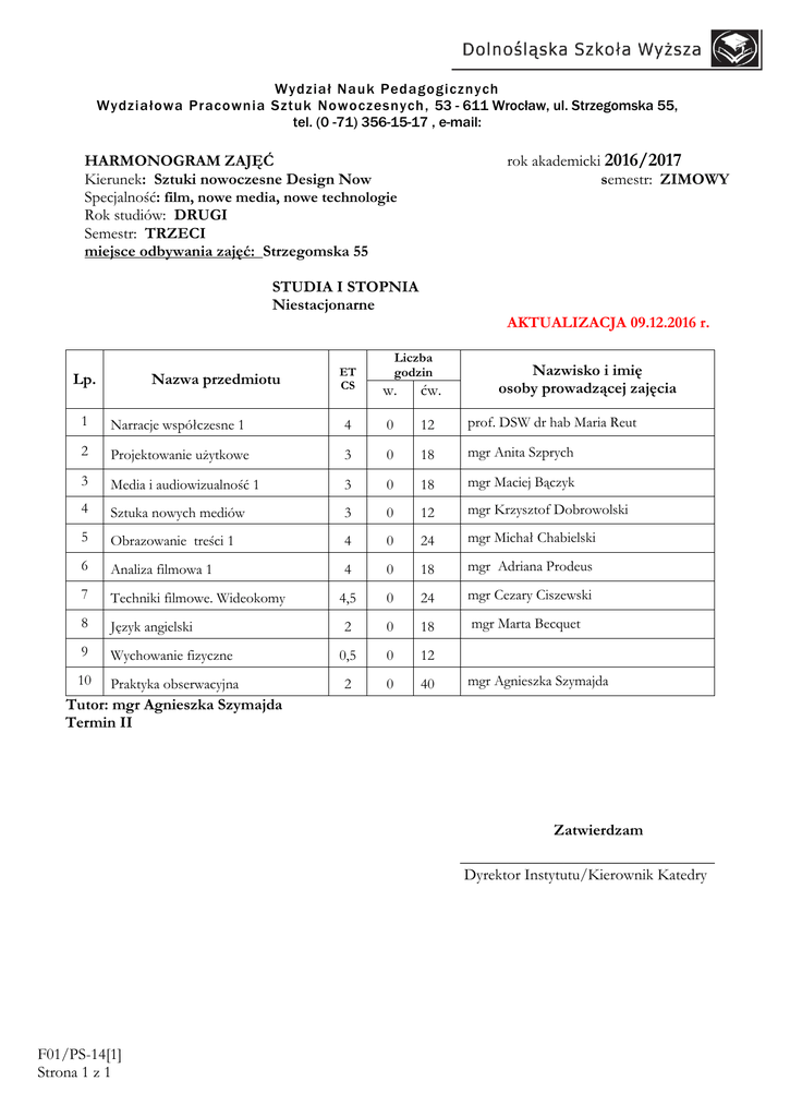 Wydział Nauk Pedagogicznych Wydziałowa Pracownia Sztuk Nowoczesnych, 53 - 611 Wrocław, ul. Strzegomska 55, tel. (0 -71) 356-15-17 , e-mail: rok akademicki 2016/2017 semestr: ZIMOWY HARMONOGRAM ZAJĘĆ Kierunek: Sztuki nowoczesne Design Now Specjalność: film, nowe media, nowe technologie Rok studiów: DRUGI Semestr: TRZECI miejsce odbywania zajęć: Strzegomska 55 STUDIA I STOPNIA Niestacjonarne Lp. Nazwa przedmiotu ET CS AKTUALIZACJA 09.12.2016 r. Liczba godzin w. ćw. Nazwisko i imię osoby prowadzącej zajęcia 1 Narracje współczesne 1 4 0 12 prof. DSW dr hab Maria Reut 2 Projektowanie użytkowe 3 0 18 mgr Anita Szprych 3 Media i audiowizualność 1 3 0 18 mgr Maciej Bączyk 4 Sztuka nowych mediów 3 0 12 mgr Krzysztof Dobrowolski 5 Obrazowanie treści 1 4 0 24 mgr Michał Chabielski 6 Analiza filmowa 1 4 0 18 mgr Adriana Prodeus 7 Techniki filmowe. Wideokomy 4,5 0 24 mgr Cezary Ciszewski 8 Język angielski 2 0 18 mgr Marta Becquet 9 Wychowanie fizyczne 0,5 0 12 10 Praktyka obserwacyjna 2 0 40 mgr Agnieszka Szymajda Tutor: mgr Agnieszka Szymajda Termin II Zatwierdzam ________________________________ Dyrektor Instytutu/Kierownik Katedry F01/PS-14[1] Strona 1 z 1 Sztuki Nowoczesne Design Now film, nowe media, nowe technologie 2 rok 3 semestr Zjazd nr 1 (24, 25 września 2016 r.) 9.00 – 11.15 11.30 – 13.45 14.00 - 16.15 16.30 - 18.45 sobota 24.09.16 r. Tutorial mgr A. Szymajda s. 26 ul. Wagonowa 9 Sztuka nowych mediów (1) mgr K. Dobrowolski s. 205 ul. Strzegomska 55 Sztuka nowych mediów (2) mgr K. Dobrowolski s. 205 ul. Strzegomska 55 niedziela 25.09.16 r. Obrazowanie treści (1) mgr M. Chabielski s. 08 ul. Wagonowa 9 Narracje współczesne1 (1) prof. DSW dr hab. M. Reut s. 26 ul. Wagonowa 9 Obrazowanie treści (2) mgr M. Chabielski s. 08 ul. Wagonowa 9 X X Zjazd nr 2 (8, 9 października 2016 r.) sobota 8.10.16 r. niedziela 9.10.16 r. 9.00 – 11.15 11.30 – 13.45 14.00 - 16.15 16.30 - 18.45 Techniki filmowe. Wideokomy (1) mgr C. Ciszewski s. 113 ul. Strzegomska 55 Analiza filmowa1 (1) mgr A. Prodeus s. 111 ul. Strzegomska 55 Techniki filmowe. Wideokomy (2) mgr C. Ciszewski s. 113 ul. Strzegomska 55 Analiza filmowa1 (2) mgr A. Prodeus s. 111 ul. Strzegomska 55 Techniki filmowe. Wideokomy (3) mgr C. Ciszewski s. 113 ul. Strzegomska 55 Analiza filmowa1 (3) mgr A. Prodeus s. 111 ul. Strzegomska 55 Techniki filmowe. Wideokomy (4) mgr C. Ciszewski s. 113 ul. Strzegomska 55 Zjazd nr 3 (22, 23 października 2016 r.) 9.00 – 11.15 11.30 – 13.45 14.00 - 16.15 16.30 - 18.45 sobota 22.10.16 r. Sztuka nowych mediów (3) mgr K. Dobrowolski s. 304 ul. Strzegomska 47 Obrazowanie treści (3) mgr M. Chabielski s. 08 ul. Wagonowa 9 Obrazowanie treści (4) mgr M. Chabielski s. 08 ul. Wagonowa 9 niedziela 23.10.16 r. Projektowanie użytkowe (1) mgr A. Szprych s. 107 ul. Strzegomska 55 Narracje współczesne1 (2) prof. DSW dr hab. M. Reut s. 304 ul. Strzegomska 47 Projektowanie użytkowe (2) mgr A. Szprych s. 107 ul. Strzegomska 55 Sztuki Nowoczesne Design Now film, nowe media, nowe technologie 2 rok 3 semestr Zjazd nr 4 (5, 6 listopada 2016 r.) sobota 5.11.16 r. niedziela 6.11.16 r. 9.00 – 11.15 11.30 – 13.45 14.00 - 16.15 16.30 - 18.45 Media i audiowizualność1 (1) mgr M. Bączyk s. 309 ul. Strzegomska 47 Analiza filmowa1 (1) mgr A. Prodeus s. 111 ul. Strzegomska 55 Media i audiowizualność1 (2) mgr M. Bączyk s. 309 ul. Strzegomska 47 Analiza filmowa1 (2) mgr A. Prodeus s. 111 ul. Strzegomska 55 Język angielski (1) mgr M. Becquet s. 205 ul. Strzegomska 55 Język angielski (2) mgr M. Becquet s. 205 ul. Strzegomska 55 Komentarz [B1]: Zajęcia przeniesione z Sali 205 Strzegomska 55 Komentarz [B2]: Zajęcia przeniesione z Sali 205 Strzegomska 55 Analiza filmowa1 (3) mgr A. Prodeus s. 111 ul. Strzegomska 55 Zjazd nr 5 (26, 27 listopada 2016 r.) 9.00 – 11.15 11.30 – 13.45 14.00 - 16.15 16.30 - 18.45 sobota 26.11.16 r. Sztuka nowych mediów (3) mgr K. Dobrowolski s. 205 ul. Strzegomska 55 Media i audiowizualność1 (3) mgr M. Bączyk s. 205 ul. Strzegomska 55 Media i audiowizualność1 (4) mgr M. Bączyk s. 205 ul. Strzegomska 55 niedziela 27.11.16 r. Projektowanie użytkowe (3) mgr A. Szprych s. 108 ul. Strzegomska 55 Narracje współczesne1 (3) prof. DSW dr hab. M. Reut s. 205 ul. Strzegomska 55 Projektowanie użytkowe (4) mgr A. Szprych s. 108 ul. Strzegomska 55 X X Zjazd nr 6 (10, 11 grudnia 2016 r.) sobota 10.12.16 r. niedziela 11.12.16 r. 9.00 – 11.15 11.30 – 13.45 14.00 - 16.15 16.30 - 18.45 Język angielski (3) mgr M. Becquet s. 308 ul. Strzegomska 55 Projektowanie użytkowe (5) mgr A. Szprych s. 107 ul. Strzegomska 55 Język angielski (4) mgr M. Becquet s. 308 ul. Strzegomska 55 Projektowanie użytkowe (6) mgr A. Szprych s. 107 ul. Strzegomska 55 Obrazowanie treści (5) mgr M. Chabielski s. 08 ul. Wagonowa 9 WF Sala gimnastyczna ul. Szkocka 64 Obrazowanie treści (6) mgr M. Chabielski s. 08 ul. Wagonowa 9 WF Sala gimnastyczna ul. Szkocka 64 Komentarz [BL3]: zmiana sal (poprzednio s. 205) Sztuki Nowoczesne Design Now film, nowe media, nowe technologie 2 rok 3 semestr Zjazd nr 7 (7, 8 stycznia 2017 r.) sobota 7.01.17 r. niedziela 8.01.17 r. 9.00 – 11.15 11.30 – 13.45 Narracje współczesne1 (4) prof. DSW dr hab. M. Reut s. 205 ul. Strzegomska 55 Techniki filmowe. Wideokomy (5) mgr C. Ciszewski s. 113 ul. Strzegomska 55 Sztuka nowych mediów (4) mgr K. Dobrowolski s. 205 ul. Strzegomska 55 Techniki filmowe. Wideokomy (6) mgr C. Ciszewski s. 113 ul. Strzegomska 55 14.00 - 16.15 16.30 - 18.45 X X Techniki filmowe. Wideokomy (7) mgr C. Ciszewski s. 113 ul. Strzegomska 55 Techniki filmowe. Wideokomy (8) mgr C. Ciszewski s. 113 ul. Strzegomska 55 Zjazd 8 (21, 22 stycznia 2017 r.) sobota 21.01.17 r. niedziela 22.01.17 r. 9.00 – 11.15 11.30 – 13.45 Media i audiowizualność1 (5) mgr M. Bączyk s. 205 ul. Strzegomska 55 X Media i audiowizualność1 (6) mgr M. Bączyk s. 205 ul. Strzegomska 55 X 14.00 - 16.15 16.30 - 18.45 WF Sala gimnastyczna ul. Szkocka 64 WF Sala gimnastycz