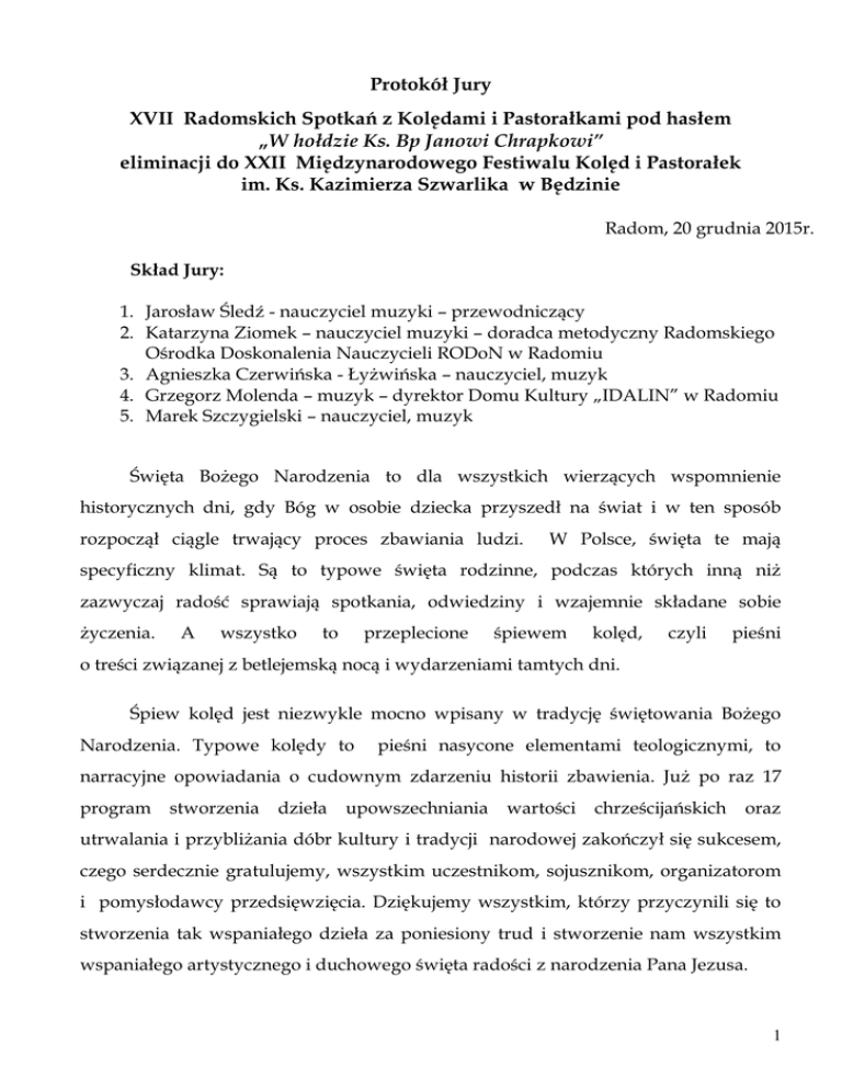 Protokół Jury XVII Radomskich Spotkań z Kolędami i Pastorałkami pod hasłem „W hołdzie Ks. Bp Janowi Chrapkowi” eliminacji do XXII Międzynarodowego Festiwalu Kolęd i Pastorałek im. Ks. Kazimierza Szwarlika w Będzinie Radom, 20 grudnia 2015r. Skład Jury: 1. Jarosław Śledź - nauczyciel muzyki – przewodniczący 2. Katarzyna Ziomek – nauczyciel muzyki – doradca metodyczny Radomskiego Ośrodka Doskonalenia Nauczycieli RODoN w Radomiu 3. Agnieszka Czerwińska - Łyżwińska – nauczyciel, muzyk 4. Grzegorz Molenda – muzyk – dyrektor Domu Kultury „IDALIN” w Radomiu 5. Marek Szczygielski – nauczyciel, muzyk Święta Bożego Narodzenia to dla wszystkich wierzących wspomnienie historycznych dni, gdy Bóg w osobie dziecka przyszedł na świat i w ten sposób rozpoczął ciągle trwający proces zbawiania ludzi. W Polsce, święta te mają specyficzny klimat. Są to typowe święta rodzinne, podczas których inną niż zazwyczaj radość sprawiają spotkania, odwiedziny i wzajemnie składane sobie życzenia. A wszystko to przeplecione śpiewem kolęd, czyli pieśni o treści związanej z betlejemską nocą i wydarzeniami tamtych dni. Śpiew kolęd jest niezwykle mocno wpisany w tradycję świętowania Bożego Narodzenia. Typowe kolędy to pieśni nasycone elementami teologicznymi, to narracyjne opowiadania o cudownym zdarzeniu historii zbawienia. Już po raz 17 program stworzenia dzieła upowszechniania wartości chrześcijańskich oraz utrwalania i przybliżania dóbr kultury i tradycji narodowej zakończył się sukcesem, czego serdecznie gratulujemy, wszystkim uczestnikom, sojusznikom, organizatorom i pomysłodawcy przedsięwzięcia. Dziękujemy wszystkim, którzy przyczynili się to stworzenia tak wspaniałego dzieła za poniesiony trud i stworzenie nam wszystkim wspaniałego artystycznego i duchowego święta radości z narodzenia Pana Jezusa. 1 Po trzydniowych przesłuchaniach w dniach 15 – 17 grudnia 2015r. w Domu Kultury „IDALIN” w Radomiu i wysłuchaniu 96 podmiotów wykonawczych jury postanowiło przyznać następujące nagrody: w kategorii DZIECI 1. Solistka Zuzanna Król z Gminnego Centrum Kultury i Kultury Fizycznej w Jedlińsku - Album, płyta CD, Odtwarzacz DVD – nagroda Właścicieli Firmy MIDAS MEBLE w Radomiu 2. Solistka Natalia Napiórkowska z Parafii Rzymsko – Kat. pw. Św. Prokopa w Błędowie Album, płyta CD, Aparat fotograficzny – nagroda Prezydenta Miasta Radomia Radosława Witkowskiego 3. Solistka Małgorzata Noga z Zespołu Szkół Ogólnokształcących w Rzucowie Album, płyta CD, Powerbank – nagroda Prezydenta Miasta Radomia Radosława Witkowskiego 4. Chór dziecięcy jednorodny „CANTUS ANGELUS” z Zespołu Szkół Muzycznych w Radomiu - aparat fotograficzny – nagroda Marszałka Sejmu RP Marka Kuchcińskiego 5. Zespół folklorystyczny „MAŁE FOUR M” z Publicznej Szkoły Podstawowej im. Polskich Olimpijczyków w Drzewicy Wieżą Hyundai – nagroda Prezesa Banku Spółdzielczego Rzemiosła w Radomiu Bożeny Sokalskiej Kaca 6. Zespół wokalny z Miejsko – Gminnego Ośrodka w Skaryszewie Radiomagnetofon – nagroda Prezesa Spółki B&M Clothing Company w Radomiu w kategorii MŁODZIEŻ 1. Duet Aleksandra Rydzewska i Agata Szendzielorz z Młodzieżowego Ośrodka Socjoterapii „PAŁACYK” w Radomiu Album, zestaw nagrodowy – nagroda Marszałka Województwa Mazowieckiego Adama Struzika 2. Solistka Katarzyna Syta z Miejsko – Gminnego Ośrodka Kultury w Białobrzegach Album, płyta CD, tablet – nagroda Mazowieckiego Kuratora Oświaty Doroty Sokołowskiej 2 3. Solistka Małgorzata Haruba z Zespołu Szkół Integracyjnych im. Jana Pawła II w Radomiu Album, płyta CD, pióro z dedykacją – nagroda Prezydenta Miasta Radomia Radosława Witkowskiego w kategorii DOROŚLI 1. Chór Nauczycielski „GAUDIUM” z Zespołu Szkół Integracyjnych im. Jana Pawła II w Radomiu - odtwarzacz DVD – nagroda Wojciecha Bernata – długoletniego nauczyciela radomskiej oświaty 2. Solistka Agnieszka Gola z Miejsko – Gminnego Ośrodka w Skaryszewie Album, płyta CD, tablet – nagroda Mazowieckiego Kuratora Doroty Sokołowskiej Oświaty w kategorii MIESZANA 1. Zespół folklorystyczny „KIELECCZYZNA” ze Stąporkowa Wieża hyundai – nagroda Prezesa Zarządu Spółki RADKOM Mariana Kozery w Radomiu 2. Zespół wokalno – instrumentalny „ZST – BAND” z Zespołu Szkół Technicznych w Radomiu -Odtwarzacz DVD – nagroda Pana Stanisława Urbańczyka Właściciela Agencji Reklamowej MULTIART w Radomiu 3. Zespół Ludowy Pieśni i Tańca „WOLANIANKI” z Zespołu Szkół Ogólnokształcących w Wolanowie - Wieża Philips – nagroda Ks. Kazimierza Radzika Przełożonego Generalnego Zgromadzenia Świętego Michała Archanioła Specjalna Nagroda Jurorska dla Zespołu Szkół Ogólnokształcących i Policealnych w Siennie za ogrom pracy włożony w przygotowanie opracowania instrumentalnego wykonawców biorących udział w przesłuchaniach konkursowych. Odtwarzacz DVD i pióro – nagroda Posła Na Sejm RP Ewy Kopacz Jury dziękuję wszystkim wykonawcom i opiekunom za trud włożony w przygotowanie wykonawców oraz zachęcamy już dziś do propagowania naszych spotkań w środowisku lokalnym i spotkania z nami za rok na XVIII Radomskich Spotkaniach z Kolędami i Pastorałkami. 3 Nominacje do udziału w finale XXII Międzynarodowego Festiwalu Kolęd i Pastorałek im. Ks. Kazimierza Szwarlika w Będzinie otrzymują: 1. Zespół folklorystyczny "Małe Four M" z Publicznej Szkoły Podstawowej im. Polskich Olimpijczyków w Drzewicy - kategoria DZIECI 2. Chór jednorodny dziecięcy "CANTUS ANGELUS" w Zespołu Szkół Muzycznych im. Oskara Kolberga w Radomiu - kategoria DZIECI 3. Solistka Katarzyna Syta z Miejsko - Gminnego Ośrodka Kultury w Białobrzegach - kategoria MŁODZIEŻ 4. Solistka Małgorzata Haruba z Zespołu Szkół Integracyjnych im. Jana Pawła II w Radomiu - kategoria MŁODZIEŻ 5. Chór Nauczycielski "GAUDIUM"z Zes
