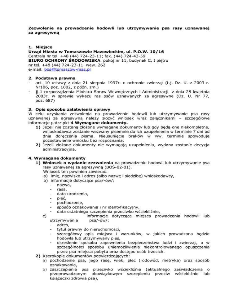 Zezwolenie na prowadzenie hodowli lub utrzymywanie psa rasy uznawanej za agresywną 1. Miejsce Urząd Miasta w Tomaszowie Mazowieckim, ul. P.O.W. 10/16 Centrala nr tel. +48 (44) 724-23-11; fax. (44) 724-43-59 BIURO OCHRONY ŚRODOWISKA pokój nr 11, budynek C, I piętro nr tel. +48 (44) 724-23-11 wew. 262 e-mail: [email protected] 2. Podstawa prawna - art. 10 ustawy z dnia 21 sierpnia 1997r. o ochronie zwierząt (t.j. Dz. U. z 2003 r. Nr106, poz. 1002, z późn. zm.) - § 1 rozporządzenia Ministra Spraw Wewnętrznych i Administracji z dnia 28 kwietnia 2003r. w sprawie wykazu ras psów uznawanych za agresywne (Dz. U. Nr 77, poz. 687) 3. Opis sposobu załatwienia sprawy W celu uzyskania zezwolenia na prowadzenie hodowli lub utrzymywanie psa rasy uznawanej za agresywną należy złożyć wniosek wraz załącznikami – szczegółowe informacje patrz pkt 4 Wymagane dokumenty. 1) Jeżeli nie zostaną złożone wymagane dokumenty lub gdy będą one niekompletne, wnioskodawca zostanie wezwany pisemnie do ich uzupełnienia w terminie 7 dni od dnia doręczenia pisma. Nieusunięcie braków w ww. terminie spowoduje pozostawienie wniosku bez rozpoznania. 2) Jeżeli złożone dokumenty nie wymagają uzupełnienia, wydana zostanie decyzja administracyjna. 4. Wymagane dokumenty 1) Wniosek o wydanie zezwolenia na prowadzenie hodowli lub utrzymywanie psa rasy uznawanej za agresywną (BOŚ-02-01). Wniosek ten powinien zawierać: a) imię, nazwisko i adres (albo nazwę i siedzibę) wnioskodawcy, b) informacje dotyczące psa/-ów/: - nazwa, - rasa, - data urodzenia, - płeć, - pochodzenie, - sposób oznakowania i nr identyfikacyjny, - data ostatniego szczepienia przeciwko wściekliźnie, c) informacje dotyczące miejsca prowadzenia hodowli lub utrzymywania psa/-ów/: - adres, - tytuł prawny do nieruchomości, - szczegółowy opis miejsca i warunków, w jakich prowadzona będzie hodowla lub utrzymywany pies, - określenie sposobu zapewnienia bezpieczeństwa ludzi i zwierząt, a w szczególności sposobu uniemożliwienia niekontrolowanego opuszczenia przez psa miejsca pobytu oraz dostępu osób trzecich. 2) Kserokopie dokumentów potwierdzających: a) pochodzenie psa, jego rasę, wiek, płeć (rodowód, metryka) oraz sposób oznakowania, b) zaszczepienie psa przeciwko wściekliźnie (aktualnego zaświadczenia o przeprowadzonym obowiązkowym szczepieniu przeciw wściekliźnie lub książeczki zdrowia psa), c) tytuł prawny do nieruchomości, d) tożsamość wnioskodawcy (dowód osobisty, paszport). 3) Dowód zapłaty opłaty skarbowej (w wysokości 82 zł). 4) Pełnomocnictwo wraz z dowodem zapłaty opłaty skarbowej od pełnomocnictwa w wysokości 17 zł - jeżeli wnioskodawca występuje przez pełnomocnika. 5. Opłaty Opłata skarbowa: w wysokości 82 zł - na podstawie załącznika do ustawy z dnia 16 listopada 2006 r. o opłacie skarbowej (Dz. U. Nr 225, poz. 1635, z późn. zm.) - część III poz. 44 pkt 2. Opłata administracyjna: brak. 6. Termin udzielenia odpowiedzi Wydanie zezwolenia w drodze decyzji administracyjnej następuje nie później niż w ciągu miesiąca, a w sprawie szczególnie skomplikowanej - nie później niż w ciągu dwóch miesięcy od dnia złożenia wniosku. Do ww. terminów nie wlicza się terminów przewidzianych w przepisach prawa dla dokonania określonych czynności, okresów zawieszenia postępowania oraz okresów opóźnień spowodowanych z winy strony albo z przyczyn niezależnych od organu. 7. Jednostka odpowiedzialna Biuro Ochrony Środowiska - pokój nr 11, budynek C, I piętro. 8. Tryb odwoławczy Od decyzji przysługuje stronie odwołanie do Samorządowego Kolegium Odwoławczego w Piotrkowie Trybunalskim za pośrednictwem Prezydenta Miasta Tomaszowa Mazowieckiego w terminie 14 dni od dnia doręczenia decyzji stronie 9. Inne informacje 1) Wykaz ras psów uznawanych za agresywne: a) amerykański pit bull terrier, b) pies z Majorki (Perro de Presa Mallorquin), c) buldog amerykański, d) dog argentyński; e) pies kanaryjski (Perro de Presa Canario), f) tosa inu, g) rottweiler, h) akbash dog, i) anatolian karabash, j) moskiewski stróżujący, k) owczarek kaukaski. 2) Zezwolenia nie wydaje się, a wydane wycofuje się, jeżeli pies będzie lub jest utrzymywany w warunkach i w sposób, które stanowią zagrożenie dla ludzi lub zwierząt. 3) Kto prowadzi hodowlę lub utrzymuje psa rasy uznawanej za agresywną bez wymaganego zezwolenia, podlega karze aresztu lub grzywny, przy czym w razie ukarania za ww. wykroczenie można orzec przepadek zwierzęcia. 10. Formularze BOŚ-02-01 - wniosek o wydanie zezwolenia na prowadzenie hodowli lub utrzymywanie psa rasy uznawanej za agresywną