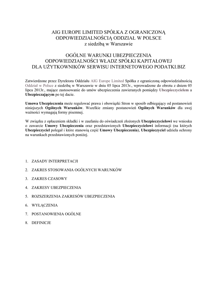 AIG EUROPE LIMITED SPÓŁKA Z OGRANICZONĄ ODPOWIEDZIALNOŚCIĄ ODDZIAŁ W POLSCE z siedzibą w Warszawie OGÓLNE WARUNKI UBEZPIECZENIA ODPOWIEDZIALNOŚCI WŁADZ SPÓŁKI KAPITAŁOWEJ DLA UŻYTKOWNIKÓW SERWISU INTERNETOWEGO PODATKI.BIZ Zatwierdzone przez Dyrektora Oddziału AIG Europe Limited Spółka z ograniczoną odpowiedzialnością Oddział w Polsce z siedzibą w Warszawie w dniu 05 lipca 2013r., wprowadzone do obrotu z dniem 05 lipca 2013r., mające zastosowanie do umów ubezpieczenia zawieranych pomiędzy Ubezpieczycielem a Ubezpieczającym po tej dacie. Umowa Ubezpieczenia może regulować prawa i obowiązki Stron w sposób odbiegający od postanowień niniejszych Ogólnych Warunków. Wszelkie zmiany postanowień Ogólnych Warunków dla swej ważności wymagają formy pisemnej. W związku z opłaceniem składki i w zaufaniu do oświadczeń złożonych Ubezpieczycielowi we wniosku o zawarcie Umowy Ubezpieczenia oraz przedstawionych Ubezpieczycielowi informacji (na których Ubezpieczyciel polegał i które stanowią część Umowy Ubezpieczenia), Ubezpieczyciel udziela ochrony na warunkach przedstawionych poniżej. 1. ZASADY INTERPRETACJI 2. ZAKRES STOSOWANIA OGÓLNYCH WARUNKÓW 3. ZAKRES CZASOWY 4. ZAKRESY UBEZPIECZENIA 5. ROZSZERZENIA ZAKRESÓW UBEZPIECZENIA 6. WYŁĄCZENIA 7. POSTANOWIENIA OGÓLNE 8. DEFINICJE 1. ZASADY INTERPRETACJI Tytuły poszczególnych postanowień niniejszych Ogólnych Warunków mają na celu wyłącznie ułatwienie korzystania z treści niniejszych Ogólnych Warunków i nie uzupełniają znaczenia poszczególnych ich postanowień ani też nie służą ich interpretacji. Słowa oraz sformułowania użyte w liczbie pojedynczej obejmują także liczbę mnogą i odwrotnie. Słowa pogrubione zostały zdefiniowane w niniejszych Ogólnych Warunkach i mogą być rozumiane jedynie zgodnie z ich zdefiniowanym znaczeniem. Słowa, które nie zostały zdefiniowane, posiadają zwykłe znaczenie. 2. ZAKRES STOSOWANIA OGÓLNYCH WARUNKÓW Ubezpieczeniu na podstawie niniejszych Ogólnych Warunków mogą podlegać wyłącznie spółki kapitałowe, które na dzień składania wniosku o zawarcie Umowy Ubezpieczenia spełniają łącznie następujące warunki: (a) Przychód roczny za ostatni zamknięty rok obrotowy nie przekracza 50 milionów zł (w przypadku objęcia ochroną Podmiotów Zależnych warunek ten dotyczy skonsolidowanych przychodów rocznych); (b) Suma aktywów na koniec ostatniego zamkniętego roku obrotowego nie przekracza 50 milionów zł (w przypadku objęcia ochroną Podmiotów Zależnych warunek ten dotyczy skonsolidowanej sumy aktywów); (c) Spółka na koniec ostatniego zamkniętego roku obrotowego miała dodatnie kapitały własne i osiągnęła zysk (w przypadku objęcia ochroną Podmiotów Zależnych warunek ten dotyczy skonsolidowanych kapitałów własnych oraz zysku Spółki i każdego Podmiotu Zależnego); (d) Spółka jest zarejestrowana w Polsce w formie spółki z ograniczoną odpowiedzialnością lub spółki akcyjnej, a od daty jej rejestracji minęły co najmniej 2 lata; (e) w publicznym obrocie nie znajdują się papiery wartościowe wyemitowane przez Spółkę (w przypadku objęcia ochroną Podmiotów Zależnych warunek ten dotyczy Spółki i każdego Podmiotu Zależnego); (f) Spółka nie jest Instytucją Finansową (w przypadku objęcia ochroną Podmiotów Zależnych warunek ten dotyczy Spółki i każdego Podmiotu Zależnego); (g) Spółka nie prowadzi działalności w branżach farmaceutycznej lub biotechnologicznej (w przypadku objęcia ochroną Podmiotów Zależnych warunek ten dotyczy Spółki i każdego Podmiotu Zależnego); (h) Spółka nie posiada aktywów na terenie USA lub Kanady, ani nie prowadzi działalności na terenie tych państw (w przypadku objęcia ochroną Podmiotów Zależnych warunek ten dotyczy Spółki i każdego Podmiotu Zależnego); (i) Spółka nie zawierała i nie planuje zawierać kontraktów dotyczących instrumentów pochodnych, w tym opcji walutowych (w przypadku objęcia ochroną Podmiotów Zależnych warunek ten dotyczy Spółki i każdego Podmiotu Zależnego); (j) Spółka nie będzie objęta we wnioskowanym Okresie Ubezpieczenia innym ubezpieczeniem odpowiedzialności władz spółek, w tym również z racji przynależności do grupy kapitałowej (w przypadku objęcia ochroną Podmiotów Zależnych warunek ten dotyczy Spółki i każdego Podmiotu Zależnego); (k) Jak dotąd nie wnoszono żadnych Roszczeń przeciwko byłym lub obecnym członkom zarządu, rady nadzorczej, komitetu audytu lub prokurentom Spółki (ani nie wnoszono żadnych Roszczeń przeciwko byłym lub obecnym członkom zarządu, rady nadzorczej, komitetu audytu lub prokurentom Podmiotów Zależnych, w przypadku objęcia ochroną Podmiotów Zależnych); (l) Przedstawiciele Spółki po dokonanym sprawdzeniu nie są świadomi jakiejkolwiek okoliczności ani zdarzenia, które może być podstawą Roszczenia przeciwko byłym lub obecnym Ubezpieczonym (w tym Ubezpieczonym z Podmiotów Zależnych w przypadku objęcia ochroną Podmiotów Zależnych). 2 3. ZAKRES CZASOWY Ubezpieczyciel w ramach poniższych zakresów ubezpieczenia oraz rozszerzeń zakresów ubezpieczenia wskazanych odpowiednio w pkt 4 i 5 Ogólnych Warunków ponosi odpowiedzialność za Roszczenia podniesione przeciwko Ubezpieczonemu po raz pierwszy w Okresie Ubezpieczenia lub w Okresie Dodatkowym i zgłoszone Ubezpieczycielowi zgodnie z wymogami niniejszej Umowy Ubezpieczenia. 4. ZAKRESY UBEZPIECZENIA 4.1 Odpowiedzialność Ubezpieczonego (a) Ochrona indywidualna Ubezpieczyciel zapłaci Szkodę każdego Ubezpieczonego, chyba że Szkoda takiego Ubezpieczonego została pokryta przez Spółkę. (b) Zwrot kosztów na rzecz Spółki Ubezpieczyciel zwróci Spółce lub zapłaci w jej imieniu wszelkie kwoty, które Spółka wypłaciła lub jest zobowiązana do wypłaty w celu pokrycia Szkody Ubezpieczonego. 4.2 Limit Dodatkowy dla członków rady nadzorczej Ubezpieczyciel w ramach Limi