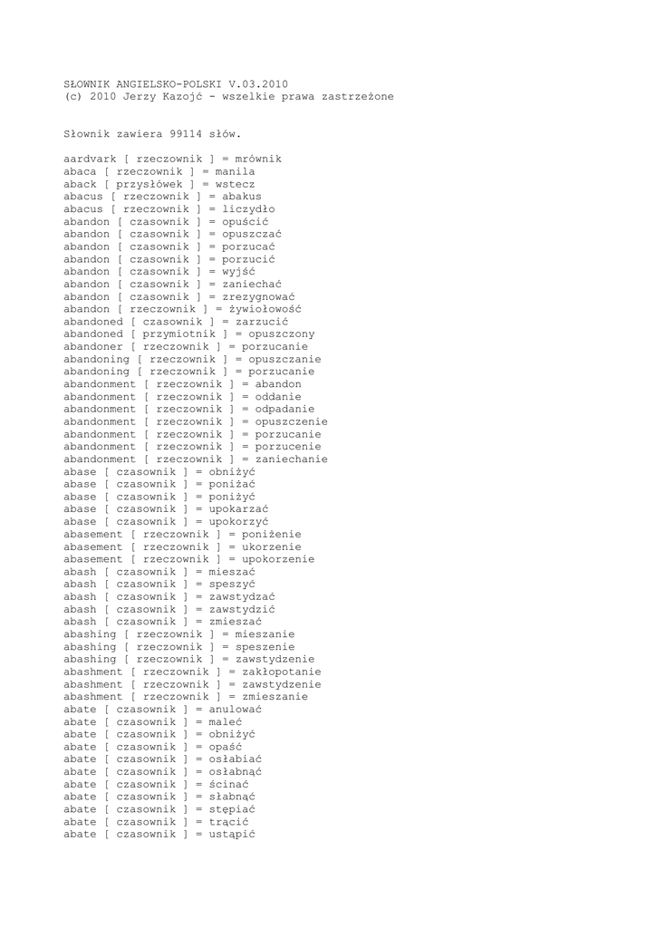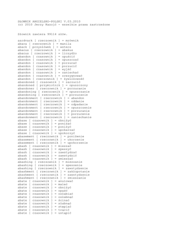 SŁOWNIK ANGIELSKO-POLSKI V.03.2010 (c) 2010 Jerzy Kazojć - wszelkie prawa zastrzeżone Słownik zawiera 99114 słów. aardvark [ rzeczownik ] = mrównik abaca [ rzeczownik ] = manila aback [ przysłówek ] = wstecz abacus [ rzeczownik ] = abakus abacus [ rzeczownik ] = liczydło abandon [ czasownik ] = opuścić abandon [ czasownik ] = opuszczać abandon [ czasownik ] = porzucać abandon [ czasownik ] = porzucić abandon [ czasownik ] = wyjść abandon [ czasownik ] = zaniechać abandon [ czasownik ] = zrezygnować abandon [ rzeczownik ] = żywiołowość abandoned [ czasownik ] = zarzucić abandoned [ przymiotnik ] = opuszczony abandoner [ rzeczownik ] = porzucanie abandoning [ rzeczownik ] = opuszczanie abandoning [ rzeczownik ] = porzucanie abandonment [ rzeczownik ] = abandon abandonment [ rzeczownik ] = oddanie abandonment [ rzeczownik ] = odpadanie abandonment [ rzeczownik ] = opuszczenie abandonment [ rzeczownik ] = porzucanie abandonment [ rzeczownik ] = porzucenie abandonment [ rzeczownik ] = zaniechanie abase [ czasownik ] = obniżyć abase [ czasownik ] = poniżać abase [ czasownik ] = poniżyć abase [ czasownik ] = upokarzać abase [ czasownik ] = upokorzyć abasement [ rzeczownik ] = poniżenie abasement [ rzeczownik ] = ukorzenie abasement [ rzeczownik ] = upokorzenie abash [ czasownik ] = mieszać abash [ czasownik ] = speszyć abash [ czasownik ] = zawstydzać abash [ czasownik ] = zawstydzić abash [ czasownik ] = zmieszać abashing [ rzeczownik ] = mieszanie abashing [ rzeczownik ] = speszenie abashing [ rzeczownik ] = zawstydzenie abashment [ rzeczownik ] = zakłopotanie abashment [ rzeczownik ] = zawstydzenie abashment [ rzeczownik ] = zmieszanie abate [ czasownik ] = anulować abate [ czasownik ] = maleć abate [ czasownik ] = obniżyć abate [ czasownik ] = opaść abate [ czasownik ] = osłabiać abate [ czasownik ] = osłabnąć abate [ czasownik ] = ścinać abate [ czasownik ] = słabnąć abate [ czasownik ] = stępiać abate [ czasownik ] = trącić abate [ czasownik ] = ustąpić abate [ czasownik ] = ustępować abate [ czasownik ] = utrącić abate [ czasownik ] = zelżeć abate [ czasownik ] = zmniejszać abate [ czasownik ] = zmniejszyć abatement [ rzeczownik ] = depresja abatement [ rzeczownik ] = obalenie abatement [ rzeczownik ] = obniżenie abatement [ rzeczownik ] = obniżka abatement [ rzeczownik ] = spadek abatement [ rzeczownik ] = ulga abatement [ rzeczownik ] = zniżka abating [ rzeczownik ] = obniżanie abating [ rzeczownik ] = ustępowanie abating [ rzeczownik ] = zniżanie abattoir [ rzeczownik ] = rzeźnia abbey [ rzeczownik ] = opactwo abbot [ rzeczownik ] = opat abbrev [ rzeczownik ] = skrót abbreviate [ czasownik ] = skracać abbreviate [ czasownik ] = skrócić abbreviate [ czasownik ] = upraszczać abbreviation [ rzeczownik ] = abrewiacja abbreviation [ rzeczownik ] = skrócenie abbreviation [ rzeczownik ] = skrót abdicate [ czasownik ] = abdykować abdicate [ czasownik ] = rezygnować abdicate [ czasownik ] = zrzekać abdication [ rzeczownik ] = abdykacja abdication [ rzeczownik ] = ustąpienie abdication [ rzeczownik ] = zrzeczenie abdomen [ rzeczownik ] = brzuch abdomen [ rzeczownik ] = odwłok abdomen [ rzeczownik ] = podbrzusze abdominal [ przymiotnik ] = brzuszny abduct [ czasownik ] = porwać abduct [ czasownik ] = porywać abduct [ czasownik ] = uprowadzać abduct [ czasownik ] = uprowadzić abduct [ czasownik ] = uwodzić abduction [ rzeczownik ] = porwanie abduction [ rzeczownik ] = uprowadzenie abductor [ rzeczownik ] = odwodziciel abductor [ rzeczownik ] = porywacz abecedarian [ przymiotnik ] = alfabetyczny abele [ rzeczownik ] = białodrzew aberrant [ przymiotnik ] = anormalny aberrant [ przymiotnik ] = dziwny aberrant [ przymiotnik ] = nienormalny aberration [ rzeczownik ] = aberracja aberration [ rzeczownik ] = dewiacja aberration [ rzeczownik ] = odchylenie aberration [ rzeczownik ] = zboczenie abet [ czasownik ] = nakłaniać abet [ czasownik ] = nakłonić abet [ czasownik ] = podżegać abet [ czasownik ] = pomagać abetment [ rzeczownik ] = nakłonienie abetment [ rzeczownik ] = podżeganie abetting [ rzeczownik ] = nakłanianie abetting [ rzeczownik ] = podżeganie abettor [ rzeczownik ] = podżegacz abettor [ rzeczownik ] = współsprawca abeyance [ rzeczownik ] = zagrożenie abeyance [ rzeczownik ] = zawieszenie abhor [ czasownik ] = brzydzić abhor [ czasownik ] = czuć abhor [ czasownik ] = nienawidzić abhorrence [ rzeczownik ] = odraza abhorrence [ rzeczownik ] = wstręt abhorrent [ przymiotnik ] = odrażający abhorrent [ przymiotnik ] = wstrętny abhorrently [ przysłówek ] = wstrętnie abhorrer [ rzeczownik ] = wstręciuch abhorring [ rzeczownik ] = brzydzenie abidance [ rzeczownik ] = przestrzeganie abidance [ rzeczownik ] = stosowanie abidance [ rzeczownik ] = trwanie abidance [ rzeczownik ] = wytrzymywanie abide [ czasownik ] = cierpieć abide [ czasownik ] = czekać abide [ czasownik ] = doczekać abide [ czasownik ] = mieszkać abide [ czasownik ] = obstawać abide [ czasownik ] = oczekiwać abide [ czasownik ] = pozostawać abide [ czasownik ] = przebywać abide [ czasownik ] = przestrzegać abide [ czasownik ] = tolerować abide [ czasownik ] = trwać abide [ czasownik ] = wytrzymywać abide [ czasownik ] = znosić abiding [ przymiotnik ] = stały abiding [ przymiotnik ] = trwały abilities [ rzeczownik ] = talent abilities [ rzeczownik ] = uzdolnienie ability [ rzeczownik ] = kompetencja ability [ rzeczownik ] = możliwość ability [ rzeczownik ] = umiejętność ability [ rzeczownik ] = zdolność ability [ rzeczownik ] = zręczność abject [ przymiotnik ] = nędzny abject [ przymiotnik ] = nieszczęśliwy abject [ przymiotnik ] = nieszczęsny abject [ przymiotnik ] = nikczemny abject [ przymiotnik ] = podły abjection [ rzeczownik ] = nędza abjection [ rzeczownik ] = nieszczęście abjection [ rzeczownik ] = upodlenie abjection [ rzeczownik ] = znikczemnienie abjectly [ przysłówek ] =