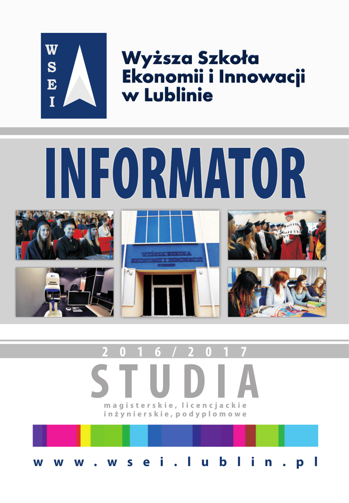 Wy¿sza Szko³a Ekonomii i Innowacji w Lublinie INFORMATOR 2 0 1 6 / 2 0 1 7 STUDIA magisterskie, licencjackie in¿ynierskie, podyplomowe w w w . w s e i . l u b l i n . p l W Y K £ A D Y O T WA R T E W S E I Panel dyskusyjny z cyklu „M³odzi na rynku pracy” na temat „Zawody przysz³oœci z perspektywy pracodawców i uczelni” z udzia³em W³adys³awa Kosiniaka-Kamysza, Ministra Pracy i Polityki Spo³ecznej oraz Joanny Muchy, Pose³ na Sejm RP prof. Rafa³ Ohme – wyk³ad „Wprowadzenie do neuronauki konsumenckiej” prof. Piotr Oleœ – wyk³ad „JA Dialogowe” prof. Iwona Niewiadomska – wyk³ad „Skazani na wykluczenie!? Zasoby adaptacyjne osób zagro¿onych marginalizacj¹ spo³eczn¹" prof. Henryk Gasiul – wyk³ad „Personalistyczna koncepcja osobowoœci” prof. Stanis³awa Steuden – wyk³ad „Czy wiedza i m¹droœæ znacz¹ to samo?” prof. Andrzej Falkowski – wyk³ad „Praktyczne implikacje teorii psychologicznych: percepcja, wyobraŸnia, pamiêæ” prof. Jan Terelak – wyk³ad „Cz³owiek w kosmosie z perspektywy psychologii kosmicznej” prof. Jan Tylka – wyk³ad „Psychosomatyczne podejœcie do problemów zdrowia i choroby” prof. Krystyna Skar¿yñska – wyk³ad „Agresja w ¿yciu publicznym” 1 Spotkanie studentów i pracowników WSEI z Borysem Budką, Ministrem Sprawiedliwości oraz Joanną Muchą, Poseł na Sejm RP Wykład otwarty Andrzeja Halickiego, Ministra Administracji i Cyfryzacji dr hab. Eugeniusz Wilkowski – wykład „Stan wojenny postrzegany przez działacza i historyka Solidarności” prof. Marta Bogdanowicz – wykład „Dysleksja – Paradosky i mity” płk. Edmund Klich – wykład „Wykorzystanie teorii systemowych do badania wypadków lotniczych na przykładzie katastrofy smoleńskiej” Spotkanie studentów i pracowników WSEI z Jerzym Szmajdzińskim, Ministrem Obrony Narodowej prof. Jacek Dworzecki – wykład „Świadek koronny jako instrument zwalczania przestępczości zorganizowanej w Polsce” Spotkanie z Januszem Palikotem, politykiem, Posłem na Sejm RP dr Michał Chlebiej – wykład „Eksploracja medycznej informacji obrazowej” Spotkanie z Craigiem Conwayem, amerykańskim dyplomatą w w w.wsei.lublin.pl 2 UCZELNIA PRZYSZŁOŚCI Jednym z najważniejszych rysów charakterystycznych Wyższej Szkoły Ekonomii i Innowacji w Lublinie, konstytuujących tożsamość uczelni i tworzących jej indywidualną markę, jest praktyczna orientacja kształcenia w w w.wsei.lublin.pl Wyższa Szkoła Ekonomii i Innowacji w Lublinie należy do grona uczelni elitarnych, cieszących się znaczącym prestiżem i stale umacniających swoją pozycję na akademickiej mapie Polski. Wskazane w misji i strategii rozwoju cele Szkoła realizuje w sposób konsekwentny, profesjonalny i wysoce efektywny, o czym świadczą nie tylko liczne nagrody, wyróżnienia i akredytacje przyznane Uczelni przez niezależne instytucje regionalne i krajowe, ale także wysoka liczba studentów (mimo niekorzystnych tendencji demograficznych), pozytywne opinie interesariuszy lokalnych oraz wypracowane w ostatnich latach liczne osiągnięcia organizacyjne, naukowe i dydaktyczne, będące wizytówką WSEI i wyróżniające ją na tle wielu innych polskich uczelni, nie wyłączając dużych uniwersytetów. Dzięki nowoczesnemu podejściu do zarządzania (w tym zwłaszcza zarządzania jakością kształcenia) Uczelnia stała się jednym z niekwestionowanych liderów sektora szkolnictwa wyższego w województwie lubelskim. Uczelnia wykreowała spójną koncepcję studiowania na wszystkich rodzajach i poziomach akademickiej edukacji, w pełni zgodną z uwarunkowaniami społeczno-gospodarczymi oraz przyjętą strategią rozwoju. Jednym z najważniejszych rysów charakterystycznych Wyższej Szkoły Ekonomii i Innowacji w Lublinie, konstytuujących tożsamość uczelni i tworzących jej indywidualną markę, jest praktyczna orientacja kształcenia. Należy podkreślić, iż Wyższa Szkoła Ekonomii i Innowacji w Lublinie jest uczelnią potrafiącą w sposób wzorcowy wykorzystywać rozwiązania innowacyjne wypracowane w toku realizacji projektów badawczych i rozwojowych dla podnoszenia jakości kształcenia i wzmacniania edukacji praktycznej. Uczelnia jest aktywnym aktorem lokalnych i regionalnych sieci społecznych, promotorem przedsięwzięć zorientowanych na pomnażanie kapitału społecznego i innowatorem pobudzającym rozwój gospodarczy miasta i regionu. Podejmuje również szereg wartościowych inicjatyw w obszarze CSR, które – adresowane do różnych środowisk, branż i grup wiekowych – stanowią świadectwo społecznej „użyteczności” Uczelni i występującej po stronie jej władz świadomości wagi pozadydaktycznych i pozanaukowych funkcji zewnętrznych instytucji akademickiej. Kanclerz WSEI mgr Teresa Bogacka Uczelnia przyszłości WSEI w liczbach 14 KIERUNKÓW STUDIÓW 3 025 700 zł I, II stopnia i jednolitych magisterskich wartość stypendiów przyznanych 1 498 studentom w roku akademickim 2015/2016 65 SPECJALNOŚCI 81 KIERUNKÓW STUDIÓW PODYPLOMOWYCH 1 765 081 zł na studiach magisterskich, licencjackich, inżynierskich wartość bonifikat i ulg w opłatach czesnego w roku akademickim 2013/2014 przyznanych 1 630 studentom 33 388 ponad 7 500 ABSOLWENTÓW STUDENTÓW I SŁUCHACZY W ROKU 2015/2016 w tym: 1 500 słuchaczy studiów podyplomowych ponad 1 900 na pierwszym roku studiów 190 mln zł 95%ABSOLWENTÓW WSEI pozyskanych z EFS przez Uczelnię oraz Fundację „OIC Poland” w okresie 2007-2013 MA PRACĘ Najważniejsze kroki w rozwoju WSEI 2001 2003 2009 2006 2010 2011 2015 2013 2014 Założenie Uczelni Własna baza dydaktyczna o powierzchni 7 000 m2 WSEI jedną z największych uczelni niepublicznych w Polsce Początek tworzenia sieci partnerskich z przedsiębiorcami Pierwsze studia magisterskie Lider wśród uczelni niepublicznych w regionie Rozbudowa bazy dydaktycznej do 12 000 m2 Założenie Akademickiego Liceum Mistrzostwa Sportow