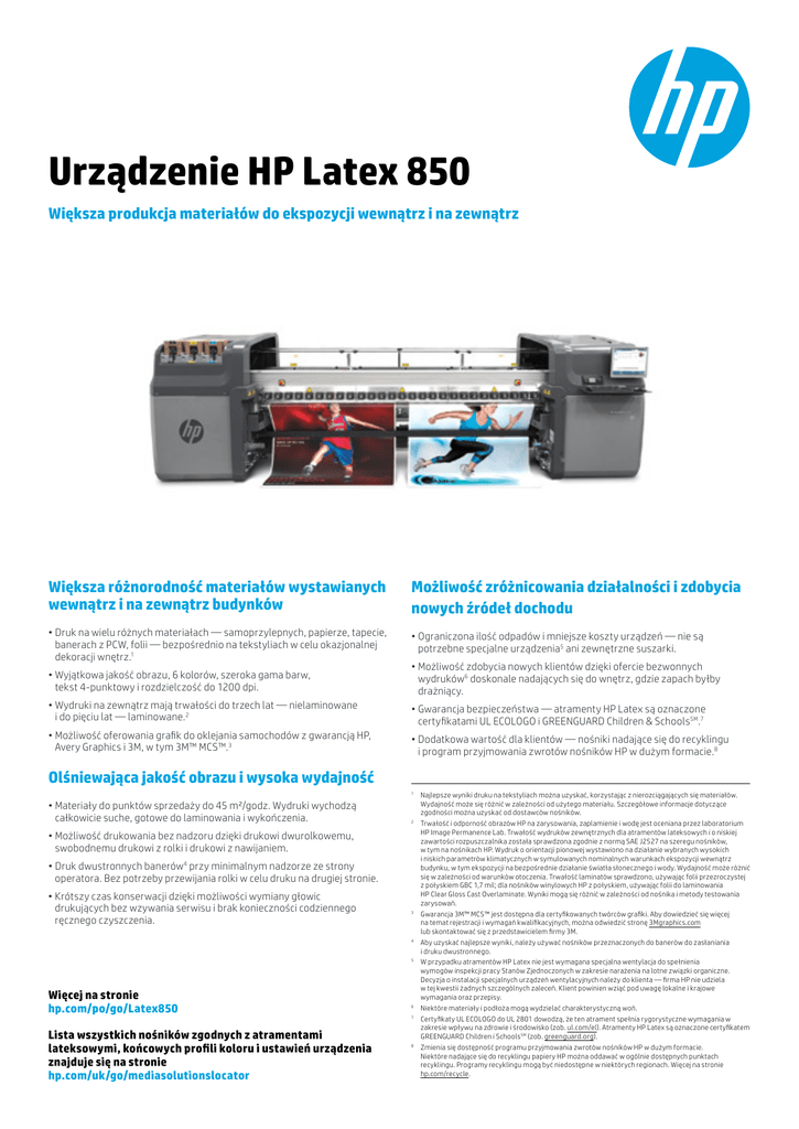 Urządzenie HP Latex 850 Większa produkcja materiałów do ekspozycji wewnątrz i na zewnątrz Większa różnorodność materiałów wystawianych wewnątrz i na zewnątrz budynków Możliwość zróżnicowania działalności i zdobycia nowych źródeł dochodu •Druk na wielu różnych materiałach — samoprzylepnych, papierze, tapecie, banerach z PCW, folii — bezpośrednio na tekstyliach w celu okazjonalnej dekoracji wnętrz.1 •Ograniczona ilość odpadów i mniejsze koszty urządzeń — nie są potrzebne specjalne urządzenia5 ani zewnętrzne suszarki. •Wyjątkowa jakość obrazu, 6 kolorów, szeroka gama barw, tekst 4-punktowy i rozdzielczość do 1200 dpi. •Możliwość zdobycia nowych klientów dzięki ofercie bezwonnych wydruków6 doskonale nadających się do wnętrz, gdzie zapach byłby drażniący. •Wydruki na zewnątrz mają trwałości do trzech lat — nielaminowane i do pięciu lat — laminowane.2 •Gwarancja bezpieczeństwa — atramenty HP Latex są oznaczone certyfikatami UL ECOLOGO i GREENGUARD Children & SchoolsSM.7 •Możliwość oferowania grafik do oklejania samochodów z gwarancją HP, Avery Graphics i 3M, w tym 3M™ MCS™.3 •Dodatkowa wartość dla klientów — nośniki nadające się do recyklingu i program przyjmowania zwrotów nośników HP w dużym formacie.8 Olśniewająca jakość obrazu i wysoka wydajność Najlepsze wyniki druku na tekstyliach można uzyskać, korzystając z nierozciągających się materiałów. Wydajność może się różnić w zależności od użytego materiału. Szczegółowe informacje dotyczące zgodności można uzyskać od dostawców nośników. 2 Trwałość i odporność obrazów HP na zarysowania, zaplamienie i wodę jest oceniana przez laboratorium HP Image Permanence Lab. Trwałość wydruków zewnętrznych dla atramentów lateksowych i o niskiej zawartości rozpuszczalnika została sprawdzona zgodnie z normą SAE J2527 na szeregu nośników, w tym na nośnikach HP. Wydruk o orientacji pionowej wystawiono na działanie wybranych wysokich i niskich parametrów klimatycznych w symulowanych nominalnych warunkach ekspozycji wewnątrz budynku, w tym ekspozycji na bezpośrednie działanie światła słonecznego i wody. Wydajność może różnić się w zależności od warunków otoczenia. Trwałość laminatów sprawdzono, używając folii przezroczystej z połyskiem GBC 1,7 mil; dla nośników winylowych HP z połyskiem, używając folii do laminowania HP Clear Gloss Cast Overlaminate. Wyniki mogą się różnić w zależności od nośnika i metody testowania zarysowań. 3 Gwarancja 3M™ MCS™ jest dostępna dla certyfikowanych twórców grafiki. Aby dowiedzieć się więcej na temat rejestracji i wymagań kwalifikacyjnych, można odwiedzić stronę 3Mgraphics.com lub skontaktować się z przedstawicielem firmy 3M. 4 Aby uzyskać najlepsze wyniki, należy używać nośników przeznaczonych do banerów do zasłaniania i druku dwustronnego. 5 W przypadku atramentów HP Latex nie jest wymagana specjalna wentylacja do spełnienia wymogów inspekcji pracy Stanów Zjednoczonych w zakresie narażenia na lotne związki organiczne. Decyzja o instalacji specjalnych urządzeń wentylacyjnych należy do klienta — firma HP nie udziela w tej kwestii żadnych szczególnych zaleceń. Klient powinien wziąć pod uwagę lokalne i krajowe wymagania oraz przepisy. 6 Niektóre materiały i podłoża mogą wydzielać charakterystyczną woń. 7 Certyfikaty UL ECOLOGO do UL 2801 dowodzą, że ten atrament spełnia rygorystyczne wymagania w zakresie wpływu na zdrowie i środowisko (zob. ul.com/el). Atramenty HP Latex są oznaczone certyfikatem GREENGUARD Children i Schools SM (zob. greenguard.org). 8 Zmienia się dostępność programu przyjmowania zwrotów nośników HP w dużym formacie. Niektóre nadające się do recyklingu papiery HP można oddawać w ogólnie dostępnych punktach recyklingu. Programy recyklingu mogą być niedostępne w niektórych regionach. Więcej na stronie hp.com/recycle. 1 •Materiały do punktów sprzedaży do 45 m²/godz. Wydruki wychodzą całkowicie suche, gotowe do laminowania i wykończenia. •Możliwość drukowania bez nadzoru dzięki drukowi dwurolkowemu, swobodnemu drukowi z rolki i drukowi z nawijaniem. •Druk dwustronnych banerów4 przy minimalnym nadzorze ze strony operatora. Bez potrzeby przewijania rolki w celu druku na drugiej stronie. •Krótszy czas konserwacji dzięki możliwości wymiany głowic drukujących bez wzywania serwisu i brak konieczności codziennego ręcznego czyszczenia. Więcej na stronie hp.com/po/go/Latex850 Lista wszystkich nośników zgodnych z atramentami lateksowymi, końcowych profili koloru i ustawień urządzenia znajduje się na stronie hp.com/uk/go/mediasolutionslocator Urządzenie HP Latex 850 Technologie druku lateksowego HP Atramenty HP Latex są tworzone na bazie wody i łączą w sobie najlepsze cechy atramentów na bazie rozpuszczalników (solwentów) i wody. Zapewniają one trwałość i różnorodność wydruków umieszczanych na zewnątrz, w przypadku całej gamy popularnych nośników stosowanych do druku oznakowań, a jednocześnie wysoką jakość, drukowanie bez uciążliwego zapachu9, niskie wymagania konserwacyjne i niewielki wpływ na środowisko charakterystyczny dla atramentów na bazie wody. Wydruki wykonywane za pomocą atramentu HP Latex wysychają całkowicie wewnątrz drukarki i stanowią trwały obraz, który można od razu laminować, wykańczać, wysyłać lub pokazywać. Plakaty do punktów sprzedaży Niższe koszty przy zachowaniu wysokiej jakości Gabloty reklamowe Wysokiej jakości elementy podświetlane •Znakomite wyniki na papierach każdego typu, w tym tanich papierach niepowlekanych i offsetowych •Wydruki o wysokiej rozdzielczości do 1200 dpi •Żywe, nasycone kolory •Szeroka gama materiałów do podświetlanych wydruków: papier, folia, polipropylen i tekstylia10 Banery zewnętrzne i okazjonalne Obrazy zasłu