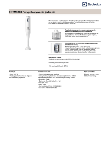 ESTM3300 Przygotowywanie jedzenia Blender ręczny z kolekcji Love Your Day oferuje wszystkie funkcje potrzebne na co dzień w kuchni. Jest wyposażony w końcówkę do rozdrabniania, końcówkę do ubijania oraz duży dzbanek. Rozdrabniacz ze zintegrowaną pokrywą dla zapewnienia łatwego przechowywania. Końcówka do rozdrabniania świetnie nadaje się do przyrządzania doskonałych sosów, past i dipów, takich jak salsa, pesto, majonez itp. Funkcja Turbo umożliwiająca natychmiastowe zwiększenie mocy Naciśnięcie przycisku Turbo powoduje natychmiastowe wykorzystanie całej dostępnej mocy 600 W, zapewniając szybko doskonałe efekty miksowania. Z funkcji tej należy korzystać, aby zaoszczędzić czas lub pod koniec miksowania. Dodatkowe zalety: • Duży dzbanek o pojemności 600 ml do koktajli • Wydajny silnik o mocy 600 W • Nie zawiera bisfenolu (BPA) Funkcje: Dane techniczne: Opis produktu: • Moc: 600 W •Tradycyjna końcówka do ubijania •2 ustawienia prędkości • Akcent kolorystyczny : srebrny •Maksymalna prędkość bez obciążenia [obr./min] : 16500 • Minimalna prędkość bez obciążenia [obr./min.] : 15000 •Szpatułka : brak •Całkowita długość kabla [m] : 1,2 •Moc [W] : 600 •Kolor : biel •Kod produktu (PNC) : 910 280 241 •Kod EAN : 7332543475353 Blender ręczny o mocy 600 W, kolor biały.