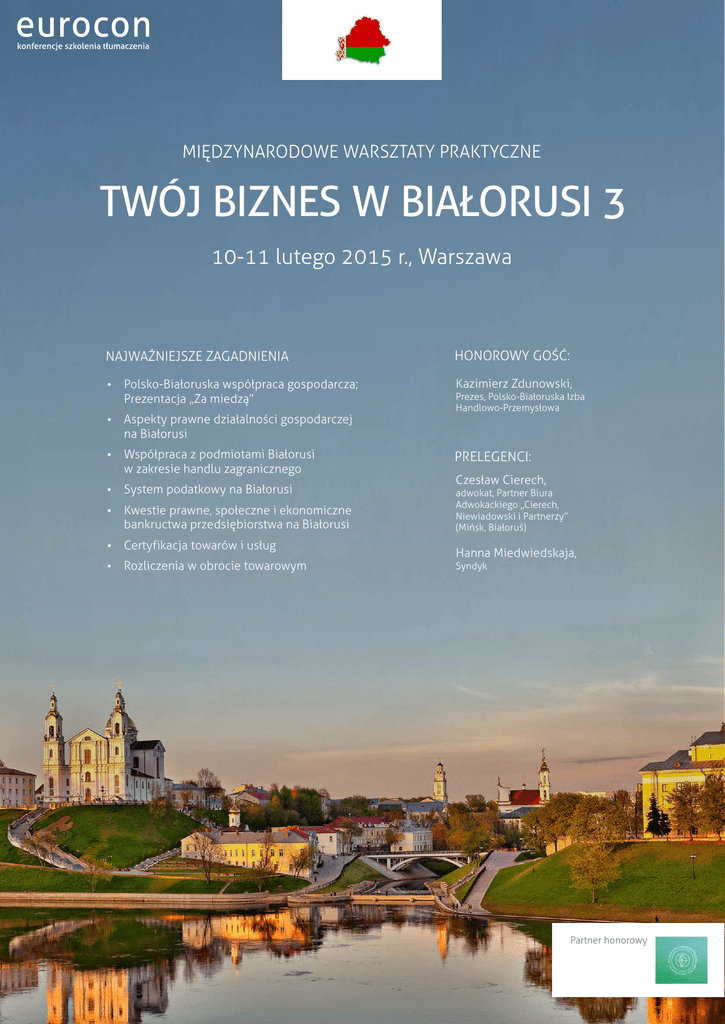 MIĘDZYNARODOWE WARSZTATY PRAKTYCZNE TWÓJ BIZNES W BIAŁORUSI 3 10-11 lutego 2015 r., Warszawa NAJWAŻNIEJSZE ZAGADNIENIA Polsko-Białoruska współpraca gospodarcza; Prezentacja „Za miedzą” HONOROWY GOŚĆ: Kazimierz Zdunowski, Prezes, Polsko-Białoruska Izba Handlowo-Przemysłowa Aspekty prawne działalności gospodarczej na Białorusi Współpraca z podmiotami Białorusi w zakresie handlu zagranicznego PRELEGENCI: System podatkowy na Białorusi Kwestie prawne, społeczne i ekonomiczne bankructwa przedsiębiorstwa na Białorusi adwokat, Partner Biura Adwokackiego „Cierech, Niewiadowski i Partnerzy” (Mińsk, Białoruś) Certyfikacja towarów i usług Rozliczenia w obrocie towarowym Czesław Cierech, Hanna Miedwiedskaja, Syndyk Partner honorowy MIĘDZYNARODOWE WARSZTATY PRAKTYCZNE TWÓJ BIZNES W BIAŁORUSI 10-11 lutego 2015 r., Warszawa Aspekty prawne działalności gospodarczej na Białorusi. Współpraca z podmiotami Białorusi w zakresie handlu zagranicznego. Dzień pierwszy, 10 lutego 2015 r., Warszawa 8.00-8.30 REJESTRACJA. KAWA POWITALNA 8.30-8.45 Wprowadzenie 8.45-9.15 Polsko-Białoruska współpraca gospodarcza; Prezentacja „Za miedzą” Prelegent: Kazimierz Zdunowski, Prezes, Polsko-Białoruska Izba Handlowo-Przemysłowa 9.15-11.15 Aspekty prawne działalności gospodarczej na Białorusi cz. 1 Inwestor zagraniczny. Spółka z udziałem zagranicznym Kto jest uznawany za inwestora zagranicznego? Warunek uzyskania statusu podmiotu z udziałem zagranicznym. Gwarancje dla inwestorów zagranicznych Zapewnienie korzystnych warunków dla inwestycji w ramach obowiązującego prawa; Gwarancja przekazania praw i obowiązków inwestora zagranicznego osobie trzeciej; Transfer płatności związanych z inwestycją zagraniczną, w tym dywidend, zysków itp. Udział inwestora zagranicznego w prywatyzacji Jakie są możliwości udziału inwestora zagranicznego w prywatyzacji. Zasady nabywania nieruchomości przez cudzoziemców oraz przez spółki z udziałem zagranicznym W jaki sposób inwestor zagraniczny może nabyć na własność nieruchomości na Białorusi (omówienie w szczegółach procedury, ewentualnych problemów, ryzyka); Inne tytuły posiadania nieruchomości (dzierżawa); Koncesjonowanie (licencjonowanie) działalności gospodarczej Zakres i warunki wykonywania działalności gospodarczej, która wymaga uzyskania zezwolenia; Procedura uzyskania koncesji (licencji). Wolne strefy Ekonomiczne (WSE) Wykaz WSE; Podatkowo-celny klimat inwestowania w WSE. Prelegent: Czesław Cierech, adwokat, Partner Biura Adwokackiego „Cierech, Niewiadowski i Partnerzy” (Mińsk, Białoruś) 11.15-11.30 PRZERWA NA KAWĘ 11.30-13.30 Aspekty prawne działalności gospodarczej na Białorusi Cz. 2 Ewentualne formy organizacyjno-prawne inwestycji zagranicznych. Jaką spółkę może założyć podmiot zagraniczny, w tym polski? Omówienie poszczególnych form spółek Ewentualne problemy i zagrożenia dla polskich inwestorów. Utworzenie spółki z ograniczoną odpowiedzialnością Podstawowe cechy spółki z ograniczoną odpowiedzialnością; Obowiązujące prawo a statut spółki w kontekście interesów inwestora zagranicznego; Podstawowe postanowienia statutu spółki; Szczegółowy zakres kompetencji władz spółki; Sposoby dokonania kontroli przez inwestora zagranicznego bieżącej działalności spółki. Typowe ryzyka wspólników zagranicznych Pokrycie udziałów w spółce z udziałem zagranicznym Pokrycie udziałów w spółce; Ocena wartości inwestycji zagranicznych; Możliwości uzyskania zwolnienia z opłat granicznych w przypadku aportu. Państwowa rejestracja osoby prawnej Procedura rejestracji spółki; Wykaz dokumentów, opłaty rejestracyjne. Likwidacja inwestycji zagranicznej Sprzedaż udziałów w spółce z ograniczoną odpowiedzialnością; Wystąpienie ze spółki z ograniczoną odpowiedzialnością; Likwidacja spółki. Utworzenie oddziału (przedstawicielstwa) zagranicznej osoby prawnej Wykaz dokumentów niezbędnych do utworzenia przedstawicielstwa (oddziału) podmiotu polskiego; Procedura rejestracyjna; Przedstawicielstwo (oddział) a obowiązki podatkowe; Prowadzenie rachunkowości przez przedstawicielstwo (oddział); Kto może być kierownikiem przedstawicielstwa (oddziału), zasady zatrudnienia. MIĘDZYNARODOWE WARSZTATY PRAKTYCZNE TWÓJ BIZNES W BIAŁORUSI 10-11 lutego 2015 r., Warszawa Aspekty prawne działalności gospodarczej na Białorusi. Współpraca z podmiotami Białorusi w zakresie handlu zagranicznego. System podatkowy Opodatkowanie na zasadach ogólnych. Podatki podstawowe, składki na fundusz pracy oraz ZUS; Podstawowe zagadnienia umów w sprawie unikania podwójnego opodatkowania w zakresie podatków od dochodu i majątku; Kontekst podatkowy w umowach handlowych zawartych pomiędzy polskimi a białoruskimi podmiotami; Jak uniknąć podwójnego opodatkowania; Opodatkowanie dochodów zagranicznych osób prawnych, nie prowadzących działalności gospodarczej na Białorusi; Podatkowe oraz inne ulgi strony dla strony umowy inwestycyjnej; Opodatkowanie podmiotów Wolnej Strefy Ekonomicznej (WSE); Opodatkowanie podmiotów zarejestrowanych i prowadzących działalność gospodarczą na terenie średnich miast, małych miasteczek, oraz na terenach wiejskich; Opodatkowanie w wolnych strefach ekonomicznych (WSE); Opodatkowanie podmiotów (rezydentów) Parku Wysokich Technologii; Opodatkowanie podmiotów zarejestrowanych w Chińsko-Białoruskim Parku przemysłowym; Opodatkowanie podmiotów zarejestrowanych i wykonujących działalność gospodarczą w Parku Turystyczno-Rekreacyjnym „Kanał Augustowski”. Zasady zatrudnienia obywateli polskich na Białorusi Regulacje prawne zatrudnienia; Ewentualne podstawy rozwiązania umowy o pracę; Zatrudnienie obcokrajowców; Zatrudnienie członków zarządu. Prelegent: Czesław Cierech, adwokat, Partner Biura Adwokackiego „Cierech, Niewiadowski i Partnerzy” (Mińsk, Białoruś) 13.30-14.30 LUNCH 14.30-16.30 Wspó