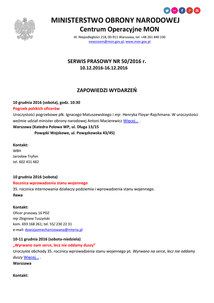 MINISTERSTWO OBRONY NARODOWEJ Centrum Operacyjne MON Al. Niepodległości 218, 00-911 Warszawa, tel. +48 261 840 230 [email protected], www.mon.gov.pl SERWIS PRASOWY NR 50/2016 r. 10.12.2016-16.12.2016 ZAPOWIEDZI WYDARZEŃ 10 grudnia 2016 (sobota), godz. 10:30 Pogrzeb polskich oficerów Uroczystości pogrzebowe płk. Ignacego Matuszewskiego i mjr. Henryka Floyar-Rajchmana. W uroczystości weźmie udział minister obrony narodowej Antoni Macierewicz Więcej... . Warszawa (Katedra Polowa WP, ul. Długa 13/15 Powązki Wojskowe, ul. Powązkowska 43/45) Kontakt: WBH Jarosław Tryfon tel. 602 431 482 10 grudnia 2016 (sobota) Rocznica wprowadzenia stanu wojennego 35. rocznica internowania działaczy podziemia i wprowadzenia stanu wojennego. Iława Kontakt: Oficer prasowy 16 PDZ mjr Zbigniew Tuszyński kom. 693 168 261; tel. 55/ 230 22 31 e-mail: [email protected] 10-11 grudnia 2016 (sobota-niedziela) „Wyrwano nam serce, lecz nie oddamy duszy” Uroczyste obchody 35. rocznicy wprowadzenia stanu wojennego pt. Wyrwano na serce, lecz nie oddamy duszy Więcej... . Warszawa Kontakt: Stowarzyszenie 13 Grudnia Sławomir Karpiński kom. 603 559 998 e-mail: [email protected] 11-16 grudnia 2016 (niedziela-piątek) Szkolenie certyfikujące Common Challenge 16 Szkolenie certyfikujące wielonarodową brygadę LITPOLUKRBRIG. W trakcie ćwiczenia będzie doskonalona zdolność brygady do prowadzenia operacji wsparcia pokoju w wielonarodowym środowisku operacyjnym Więcej... . Nowa Dęba, Lublin Kontakt: Oficer prasowy LITPOLUKRBRIG kpt. Oleksandr Gain tel. 261 183 027 e-mail: [email protected] 12-13 grudnia 2016 (poniedziałek) Mistrzostwa Garnizonu Warszawa w badmintonie Reprezentacje instytucji i jednostek wojskowych zmierzą się w zawodach badmintonowych. Warszawa (ul. 29 Listopada 1) Kontakt: Rzecznik prasowy DGW. ppłk Joanna Klejszmit-Bodziuch kom. 721 810 749; tel. 261 879 603 e-mail: [email protected] 12-16 grudnia 2016 (poniedziałek-piątek) Badania modułu ogniowego KRAB Badania eksploatacyjno-wojskowe modułu ogniowego KRAB ze strzelaniem amunicją bojową. Toruń Kontakt: Oficer prasowy 11 Pa kpt. Rafał Ługiewicz kom. 723 663 321 13 grudnia 2016 (wtorek) Koncert świąteczny Koncert świąteczny muzyków Szkoły Podoficerskiej Wojsk Lądowych Warszawa (Centrum Onkologii, ul. Roentgena 5) Kontakt: Rzecznik prasowy SPWL st. chor. Marcin Szubert tel. 261 575 349, kom. 663 663 083 e-mail: [email protected] 13 grudnia 2016 (wtorek) Trening SI Spectrum XXI Żołnierze wezmą udział w treningu zgrywającym SI Spectrum XXI. Złocieniec Kontakt: Oficer prasowy 2 BZ por. Paulina Popiel kom. 602 449 713 e-mail: [email protected] 14 grudnia 2016 (środa) Akcja Honorowych Dawców Krwi Krew będzie można oddać w specjalnie przystosowanym autobusie Wojskowego Centrum Krwiodawstwa i Krwiolecznictwa. Zegrze (CSŁiI) Kontakt: CSŁiI Tadeusz Kowalewski tel. 261 883 336; kom. 606 717 996 14 grudnia 2016 (środa) Ćwiczenia taktyczne Ćwiczenia taktyczne batalionu. Lębork Kontakt: Oficer prasowy 7 BOW kpt. Karolina Krzewina-Hyc kom. 721 890 408 e-mail: [email protected] KRONIKA 2 grudnia 2016 (piątek) Zacieśnienie współpracy obronnej z Ukrainą Minister obrony narodowej Antoni Macierewicz oraz minister obrony Ukrainy gen. armii Stepan Połtorak podpisali Umowę ogólną między Rzeczpospolitą Polską a Ukrainą w sprawie wzajemnej współpracy w dziedzinie obronności. Więcej... 2 grudnia 2016 (piątek) Tysiące dronów bojowych dla wojska − Twierdzenie, że Ministerstwo Obrony Narodowej wycofuje się z zakupu dronów, albo że zostaną one kupione w innym terminie nie jest prawdą – powiedział w piątek podczas spotkania z mediami Bartłomiej Misiewicz. Więcej... 2 grudnia 2016 (piątek) 69. rocznica śmierci „Bartka” W piątek 2 grudnia br. w Czechowicach-Dziedzicach odbyły się uroczystości 69. rocznicy śmierci legendarnego dowódcy Zgrupowania Partyzanckiego NSZ kpt. Henryka Flame ps. „Bartek” (1918-1947) zorganizowane przez Związek Żołnierzy NSZ. Więcej... 3 grudnia 2016 (sobota) Patenty oficerskie dla księży W sobotę, w katedrze polowej Wojska Polskiego, minister obrony narodowej Antoni Macierewicz mianował na pierwszy stopień oficerski księży alumnów, wcielonych przymusowo do służby w tzw. kleryckich jednostkach Ludowego Wojska Polskiego. Więcej... 4 grudnia 2016 (niedziela) 100. rocznica wkroczenia Legionów Polskich – 100 lat temu legioniści udowodnili wkraczając do Warszawy, że Polska wraca na mapy świata− mówił w niedzielę podczas uroczystości 100-lecia wkroczenia Legionów Polskich do Warszawy wiceminister obrony narodowej prof. dr hab. Wojciech Fałkowski. Więcej... 5 grudnia 2016 (poniedziałek) Minister obrony narodowej na Barbórce Minister obrony narodowej Antoni Macierewicz wziął udział w akademii z okazji Dnia Górnika. Tegoroczna Barbórka odbyła się w Hali Widowiskowo-Sportowej w Bełchatowie. Więcej... 5 grudnia 2016 (poniedziałek) Wiceminister obrony Kataru W poniedziałek, 5 grudnia br. podsekretarz stanu Tomasz Szatkowski spotkał się z wiceministrem stanu ds. obrony, współpracy wojskowej i koordynacji w Ministerstwie Obrony Państwa Katar gen. dyw. pilotem Abdullahem Juma’anem Al-Hamadem. Więcej... 6 grudnia 2016 (wtorek) Mikołajki u pancerniaków We wtorek, 6 grudnia, minister obrony narodowej Antoni Macierewicz był w 1 Warszawskiej Brygadzie Pancernej w Wesołej, gdzie spotkał się z dziećmi i uczniami klas mundurowych. Więcej... 7 grudnia 2016 (środa) Akt nominacji legendarnego kuriera − Jan Karski był wielkim żołnierzem Rzeczpospolitej, który nigdy nie zaprzestał walki o wolność Polski, a także o ludzką godność − powiedział prezydent Andrzej Duda. W środę w Warszawie prezydent przekazał bliskim legendarnego kuriera akt nominacji na stopień generała brygady. Więcej... 7 grudnia 2016 (środa) Polsko-amerykańskie rozmowy W dniach 5−6 grudnia br. z wizytą w Polsce przebywała delegacja De