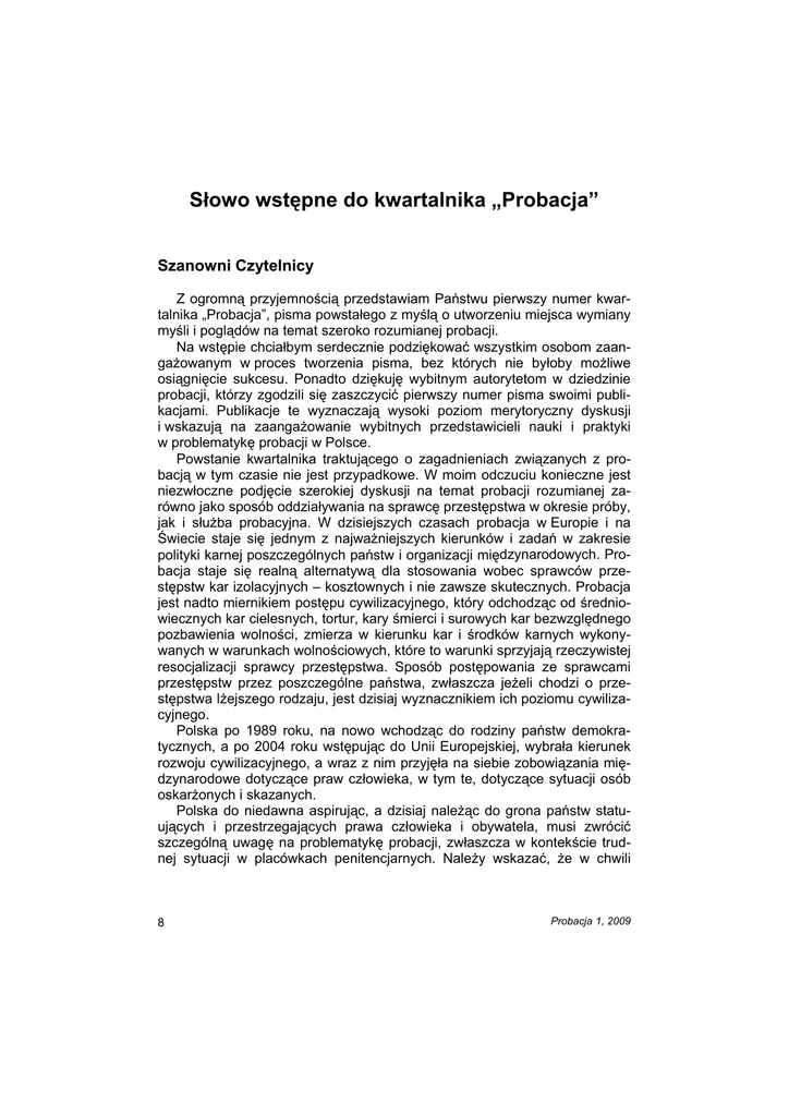 Słowo wstępne do kwartalnika „Probacja” Słowo wstępne do kwartalnika „Probacja” Szanowni Czytelnicy Z ogromną przyjemnością przedstawiam Państwu pierwszy numer kwartalnika „Probacja”, pisma powstałego z myślą o utworzeniu miejsca wymiany myśli i poglądów na temat szeroko rozumianej probacji. Na wstępie chciałbym serdecznie podziękować wszystkim osobom zaangażowanym w proces tworzenia pisma, bez których nie byłoby możliwe osiągnięcie sukcesu. Ponadto dziękuję wybitnym autorytetom w dziedzinie probacji, którzy zgodzili się zaszczycić pierwszy numer pisma swoimi publikacjami. Publikacje te wyznaczają wysoki poziom merytoryczny dyskusji i wskazują na zaangażowanie wybitnych przedstawicieli nauki i praktyki w problematykę probacji w Polsce. Powstanie kwartalnika traktującego o zagadnieniach związanych z probacją w tym czasie nie jest przypadkowe. W moim odczuciu konieczne jest niezwłoczne podjęcie szerokiej dyskusji na temat probacji rozumianej zarówno jako sposób oddziaływania na sprawcę przestępstwa w okresie próby, jak i służba probacyjna. W dzisiejszych czasach probacja w Europie i na Świecie staje się jednym z najważniejszych kierunków i zadań w zakresie polityki karnej poszczególnych państw i organizacji międzynarodowych. Probacja staje się realną alternatywą dla stosowania wobec sprawców przestępstw kar izolacyjnych – kosztownych i nie zawsze skutecznych. Probacja jest nadto miernikiem postępu cywilizacyjnego, który odchodząc od średniowiecznych kar cielesnych, tortur, kary śmierci i surowych kar bezwzględnego pozbawienia wolności, zmierza w kierunku kar i środków karnych wykonywanych w warunkach wolnościowych, które to warunki sprzyjają rzeczywistej resocjalizacji sprawcy przestępstwa. Sposób postępowania ze sprawcami przestępstw przez poszczególne państwa, zwłaszcza jeżeli chodzi o przestępstwa lżejszego rodzaju, jest dzisiaj wyznacznikiem ich poziomu cywilizacyjnego. Polska po 1989 roku, na nowo wchodząc do rodziny państw demokratycznych, a po 2004 roku wstępując do Unii Europejskiej, wybrała kierunek rozwoju cywilizacyjnego, a wraz z nim przyjęła na siebie zobowiązania międzynarodowe dotyczące praw człowieka, w tym te, dotyczące sytuacji osób oskarżonych i skazanych. Polska do niedawna aspirując, a dzisiaj należąc do grona państw statuujących i przestrzegających prawa człowieka i obywatela, musi zwrócić szczególną uwagę na problematykę probacji, zwłaszcza w kontekście trudnej sytuacji w placówkach penitencjarnych. Należy wskazać, że w chwili 8 Probacja 1, 2009 Słowo wstępne do kwartalnika „Probacja” obecnej – tj. na miesiąc listopad 2008 roku, zaludnienie w aresztach śledczych i zakładach karnych wynosi 106%. Na 79.442 miejsca w ww. placówkach osadzonych jest 84.225 skazanych. Dodać w tym miejscu trzeba, że zaludnienie to znacznie się obniżyło, od ponad 124% w listopadzie 2006 roku do nieco ponad 106% we wrześniu ubiegłego roku. Te niewątpliwie korzystne dane statystyczne nie powinny jednakże pozostawiać nas w dobrym samopoczuciu, z uwagi na co najmniej dwie zasadnicze kwestie. Po pierwsze należy wskazać, że warunki, w jakich przebywają skazani, często odbiegają od norm europejskich, co nie pozostaje bez wpływu na skuteczność działań resocjalizacyjnych, podejmowanych w warunkach izolacji. Po drugie zaś, na osadzenie w placówkach penitencjarnych oczekuje w chwili obecnej blisko 39.000 skazanych. W moim głębokim odczuciu, aby podjąć dyskusję o probacji w Polsce, należy w pierwszej kolejności zwrócić uwagę na strukturę orzekanych kar przez sądy powszechne. Jeżeli podsumujemy wszystkie rodzaje kar, to okaże się, że ponad 61% wszystkich rodzajów kar orzekanych jest na okres próby, a zatem skazani w takich sprawach podlegają probacji. Dodać także trzeba, że probacji w Polsce podlega w chwili obecnej ponad 800.000 osób, co nie znajduje precedensu w żadnym z krajów Europy Zachodniej. Osobami tymi zajmuje się jedynie 3.118 kuratorów dla dorosłych, którzy często pracują w trudnych warunkach, bez należytego oprzyrządowania normatywnego i technicznego. Wskazane powyżej problemy wymagają potrzeby pogłębionej refleksji na temat probacji w Polsce. Należy zastanowić się zatem nad problematyką istniejących i potencjalnie potrzebnych oddziaływań probacyjnych w Polsce, ich stosowaniem i wykonaniem. Ponadto należy skupić się nad problemem określenia podstawowych celów probacji, a zarazem wskaźników oceny jej skuteczności i efektywności. Konieczne także jest przyjrzenie się zasadom oddziaływań probacyjnych na sprawcę i organizacji służby probacyjnej w kontekście rozwiązań przyjętych przez organizacje międzynarodowe, których Polska jest członkiem. Przykładem mogą tu być: Zalecenie nr R (92) 16 Komitetu Ministrów Rady Europy skierowane do państw członkowskich w sprawie europejskich reguł dotyczących sankcji i środków alternatywnych, Zalecenie Komitetu Ministrów nr R (97) 12 w sprawie personelu wykonującego kary i środki alternatywne, a także Rekomendacja nr R (2000) 22 Komitetu Ministrów w sprawie poprawy realizacji europejskich zasad wykonywania sankcji i środków [karnych] o charakterze wolnościowym. Wprowadzane tam rozwiązania są wynikiem głębokiej analizy i postępu w myśleniu na temat działań probacyjnych. Konieczne jest dostosowanie naszych uregulowań do standardów europejskich, a w dalszej kolejności branie czynnego udziału w badaniach i poszukiwaniach wraz z naszymi przyjaciółmi z Unii Europejskiej czy też Rady Probacja 1, 2009 9 Słowo wstępne do kwartalnika „Probacja” Europy najdoskonalszych metod i sposobów postępowania z osobami poddanymi probacji. Wyrażam nadzieję, że kwartalnik „Probacja” będzie odpowiednim miejscem do wymiany poglądów i doświadczeń, a także rozważań dotyczących m.in. powyższych problemów. Odd