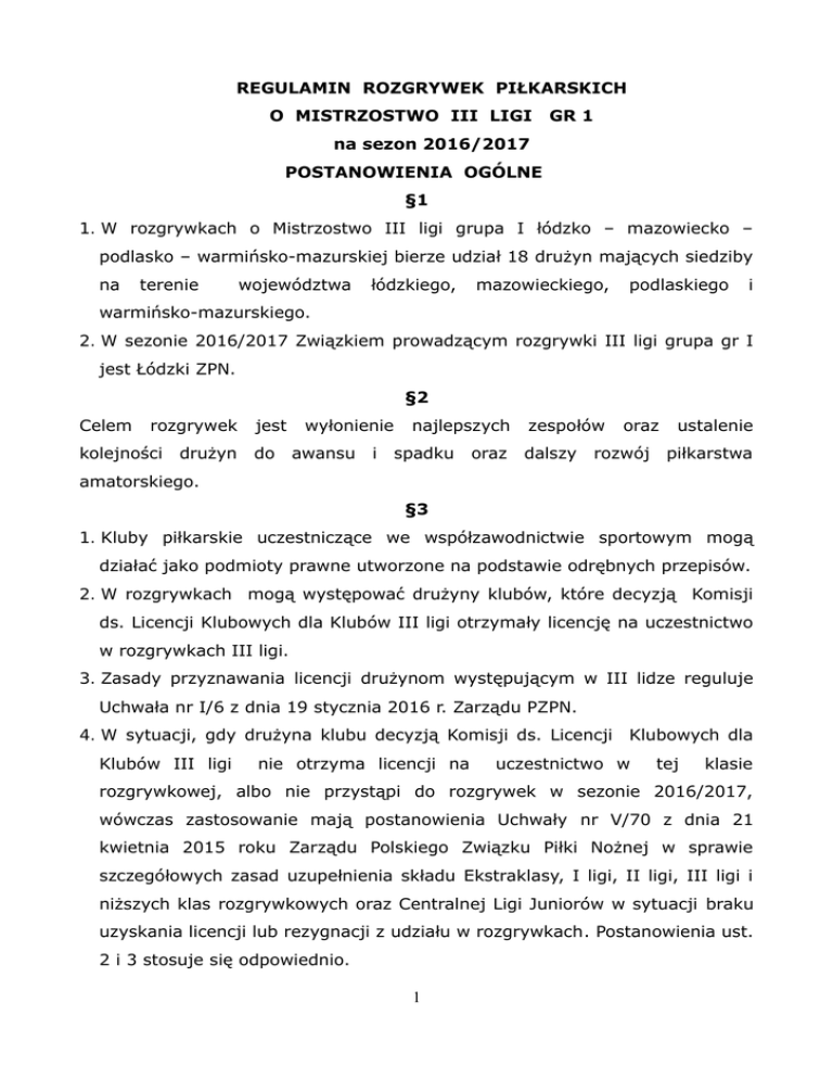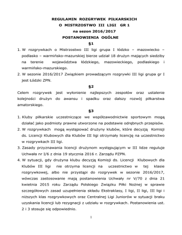 REGULAMIN ROZGRYWEK PIŁKARSKICH O MISTRZOSTWO III LIGI GR 1 na sezon 2016/2017 POSTANOWIENIA OGÓLNE §1 1. W rozgrywkach o Mistrzostwo III ligi grupa I łódzko – mazowiecko – podlasko – warmińsko-mazurskiej bierze udział 18 drużyn mających siedziby na terenie województwa łódzkiego, mazowieckiego, podlaskiego i warmińsko-mazurskiego. 2. W sezonie 2016/2017 Związkiem prowadzącym rozgrywki III ligi grupa gr I jest Łódzki ZPN. §2 Celem rozgrywek kolejności drużyn jest do wyłonienie awansu i najlepszych spadku oraz zespołów dalszy oraz rozwój ustalenie piłkarstwa amatorskiego. §3 1. Kluby piłkarskie uczestniczące we współzawodnictwie sportowym mogą działać jako podmioty prawne utworzone na podstawie odrębnych przepisów. 2. W rozgrywkach mogą występować drużyny klubów, które decyzją Komisji ds. Licencji Klubowych dla Klubów III ligi otrzymały licencję na uczestnictwo w rozgrywkach III ligi. 3. Zasady przyznawania licencji drużynom występującym w III lidze reguluje Uchwała nr I/6 z dnia 19 stycznia 2016 r. Zarządu PZPN. 4. W sytuacji, gdy drużyna klubu decyzją Komisji ds. Licencji Klubowych dla Klubów III ligi nie otrzyma licencji na uczestnictwo w tej klasie rozgrywkowej, albo nie przystąpi do rozgrywek w sezonie 2016/2017, wówczas zastosowanie mają postanowienia Uchwały nr V/70 z dnia 21 kwietnia 2015 roku Zarządu Polskiego Związku Piłki Nożnej w sprawie szczegółowych zasad uzupełnienia składu Ekstraklasy, I ligi, II ligi, III ligi i niższych klas rozgrywkowych oraz Centralnej Ligi Juniorów w sytuacji braku uzyskania licencji lub rezygnacji z udziału w rozgrywkach. Postanowienia ust. 2 i 3 stosuje się odpowiednio. 1 §4 Rozgrywki prowadzone będą na podstawie niniejszego regulaminu i terminarza rozgrywek w oparciu o: 1. Przepisy Gry w Piłkę Nożną. 2. Uchwałę nr IX/140 z dnia 3 i 7 lipca 2008 r. Zarządu PZPN w sprawie organizacji rozgrywek w piłkę nożną / z późniejszymi zmianami /. 3. Uchwałę nr VIII/124 Zarządu PZPN z dnia 15 lipca 2015 r. w sprawie statusu zawodników oraz zasad zmian przynależności klubowej / z późniejszymi zmianami / 4. Regulamin Dyscyplinarny PZPN po 23 lutym 2016 r. 5. Ustawę o bezpieczeństwie imprez masowych z dnia 20.03.2009 r. /Dz.U. z 2015 poz. 2139/z późniejszymi zmianami/. 6. Uchwałę nr I/6 z dnia 19 stycznia 2016r. Zarządu PZPN ''Przepisy Licencyjne dla klubów III ligi na sezon 2016/2017 i następne''. §5 Rozgrywki prowadzone są systemem jesień - wiosna. BOISKA §6 1. Zawody o mistrzostwo III ligi seniorów muszą być rozgrywane tylko na boiskach zweryfikowanych dla rozgrywek III ligi, bądź wyższej klasy rozgrywkowej na dany sezon - położonych w miejscu, w którym klub w sposób prawny posiada zgodę na rozgrywanie zawodów. Boiska wraz z urządzeniami towarzyszącymi muszą być zatwierdzone pod względem bezpieczeństwa przez organy do tego powołane. 2. Ważność weryfikacji dla klubów uczestniczących w rozgrywkach III ligi określa się na jeden rok, przy czym okres jej ważności winien być zgodny z okresem ważności licencji, udzielonej klubowi na udział w rozgrywkach III ligi. Weryfikacja obiektu może być wcześniej unieważniona, po stwierdzeniu braków formalnych, merytorycznych lub nierealizowaniu przez klub zaleceń. Brak ważnej weryfikacji boiska jest podstawą do zawieszenia licencji klubu Weryfikacje boisk przeprowadza właściwy terytorialnie Związek Piłki Nożnej przed rozpoczęciem nowego sezonu rozgrywkowego. 2 3. Jeden egzemplarz protokołu weryfikacji boiska powinien znajdować się w dokumentacji klubowej, drugi egzemplarz protokołu winien zostać złożony w macierzystym Związku Piłki Nożnej, a trzeci egzemplarz klub składa wraz z wnioskiem licencyjnym do Komisji ds. Licencji Klubowych dla Klubów III ligi. 4. Za właściwe przygotowanie boiska do gry, odpowiedzialny jest klub, będący gospodarzem zawodów, wpisany w terminarzu rozgrywek na pierwszym miejscu. 5. Klub, który nie dopełnił tego obowiązku i z winy którego zawody nie odbyły się, ponosi konsekwencje regulaminowe oraz pokrywa przeciwnikowi wszystkie koszty związane z przyjazdem na zawody. 6. W przypadku nieprzewidzianej i niezależnej od gospodarza przeszkody uniemożliwiającej rozegranie spotkania na wyznaczonym boisku, ma on obowiązek przenieść zawody na inne boisko zweryfikowane dla danej lub wyższej klasy rozgrywkowej, uzyskując prawną zgodę na rozegranie zawodów. Klub nie ma obowiązku udostępniać innej płyty sytuacji, gdy w wyłącznie w danym dniu bądź w dniu następnym na tym boisku są wyznaczone zawody szczebla wyższego lub zawody międzynarodowe 7. Mecze piłkarskie nie mogą się odbywać w żadnym przypadku na boiskach zamkniętych na mocy decyzji związkowego organu dyscyplinarnego lub na podstawie decyzji administracyjnej. 8. Przed każdym meczem sędziowie, obserwatorzy oraz delegaci mają obowiązek sprawdzenia dokumentów zezwalających na przeprowadzenie zawodów piłkarskich na danym obiekcie. Przedstawiciele klubu mają obowiązek okazać stosowne dokumenty na żądanie osób uprawnionych. 9. Kluby posiadające sztuczne oświetlenie boiska muszą spełniać wymogi Uchwały ws. Podręcznika Licencyjnego dla Klubów III ligi tzn. posiadać oświetlenie o mocy minimum 500 LUX zgodnie z protokołem pomiaru natężenia światła. Bez udokumentowanego pomiaru natężenia światła klub gospodarz musi uzyskać pisemną zgodę przeciwnika na rozegranie meczu. Zgoda ta winna być przesłana do wiadomości rozgrywki przed meczem. POTWIERDZENIE I UPRAWNIENIE DO GRY 3 organu prowadzącego §7 1. W rozgrywkach o mistrzostwo III ligi seniorów mogą brać udział wyłącznie zawodnicy potwierdzeni do gry w systemie ewidencji Extranet przez Wydział Gier macierzystego Związku Piłki Nożnej oraz uprawnieni do gry w rozgrywkach III ligi na sezon 2016/2017 przez Łódzki Związek Piłki Nożnej, pod rygorem zweryfikowania wyniku 
