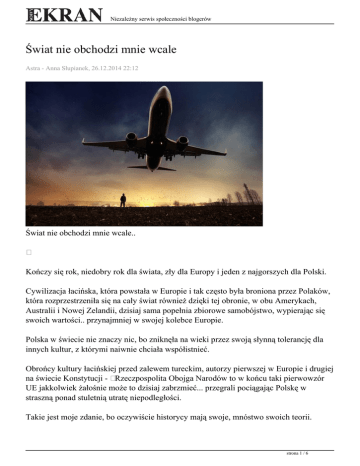 Niezależny serwis społeczności blogerów Świat nie obchodzi mnie wcale Astra - Anna Słupianek, 26.12.2014 22:12 Świat nie obchodzi mnie wcale.. Kończy się rok, niedobry rok dla świata, zły dla Europy i jeden z najgorszych dla Polski. Cywilizacja łacińska, która powstała w Europie i tak często była broniona przez Polaków, która rozprzestrzeniła się na cały świat również dzięki tej obronie, w obu Amerykach, Australii i Nowej Zelandii, dzisiaj sama popełnia zbiorowe samobójstwo, wypierając się swoich wartości.. przynajmniej w swojej kolebce Europie. Polska w świecie nie znaczy nic, bo zniknęła na wieki przez swoją słynną tolerancję dla innych kultur, z którymi naiwnie chciała współistnieć. Obrońcy kultury łacińskiej przed zalewem tureckim, autorzy pierwszej w Europie i drugiej na świecie Konstytucji - Rzeczpospolita Obojga Narodów to w końcu taki pierwowzór UE jakkolwiek żałośnie może to dzisiaj zabrzmieć... przegrali pociągając Polskę w straszną ponad stuletnią utratę niepodległości. Takie jest moje zdanie, bo oczywiście historycy mają swoje, mnóstwo swoich teorii. strona 1 / 6 Niezależny serwis społeczności blogerów Spośród dziesiątek tych teorii, często sobie zaprzeczających, ja przychylam się do tej: //Odmienne przyczyny upadku Polski widział dziewiętnastowieczny historyk z tzw. szkoły krakowskiej, M. Bobrzyński: ”Jedni kładli przemożny nacisk na upadek oświaty [...], drudzy wysuwali na pierwszy plan upadek moralności publicznej i przedajność i prywatę, inni zwrócili uwagę na poniżenie miast i ucisk wiejskiego ludu [...] żadnemu z nich nie mogliśmy przyznać rozstrzygającego znaczenia. Wszystko to były drugorzędne zjawiska, które gdzie indziej w gorszym nieraz występowały świetle, ale żadnego narodu nie przyprawiły o utratę politycznego bytu. Wszędzie bowiem istniał rząd, który dostrzegłszy zło prędzej lub później je naprawiał lub zmniejszał, który w chwilach niebezpieczeństwa siły narodu skupiał; u nas [...] brakło rządu, któryby w chwili stanowczej siły [...] około siebie skupił i jednolity kierunek im nadał, tu w braku rządu tkwiła [...] bezpośrednia przyczyna [...]. Nie granica i nie sąsiedzi, tylko nieład wewnętrzny przyprawił nas o utratę politycznego bytu”. W tym aspekcie stoi w sprzeczności do M. Kukiela i J. Lelewela, który pisał: ”[...] wszystkie te błędy [...], wszystkie te [...] wewnętrzne przyczyny mogły pociągnąć nędzę, rewolucję, wreszcie przewrócenie porządku w kraju, ale nie upadek, gdyby się do nich zewnętrzne nie mieszały [...]” http://historia.org.pl/2009/09/28/przyczyny-upadku-panstwowosci-polskiej-w-xviii-wieku/ Dlaczego właśnie jemu wierzę? Może dlatego, że urodził się w 1849roku, więc miał szansę poznać, może już starych, ale jednak Polaków pamiętających tamtą, wolną jeszcze Pierwszą Rzeczpospolitą, a poza tym zmarł w 1935 roku w wolnej II Rzeczpospolitej, dla mnie wystarczy... http://pl.wikipedia.org/wiki/Michał_Bobrzyński strona 2 / 6 Niezależny serwis społeczności blogerów ... brakło rządu,” który w chwilach niebezpieczeństwa siły narodu skupiał”... Tak jakoś Polacy mają „szczęście” do braku rządów polskich. Rządy nasze bowiem dosyć szybko zabierały du..ę w troki i wiały w czasie zagrożenia, pozostawiając Naród przeraźliwie samotny wobec zbliżających się dziejowych koszmarów. Zrobił tak w końcu król Staś, nasz światły król. 1 grudnia 1794 zlikwidował Szkołę Rycerską. Katarzyna II zażądała jego wyjazdu do Grodna. 7 stycznia 1795 roku władca opuścił Warszawę pod rosyjską eskortą wojskową. 12 stycznia przyjechał do Grodna, gdzie bezpośredni nadzór nad nim pełnił gen. Bezborodko. /za wikipedią/ Tak było we wrześniu „roku pamiętnego” ... tak też jest i dzisiaj, kiedy premier takiego kraju.. w podskokach rzuca wszystko i pędzi do Brukseli jako marionetka niemieckiego porządku europejskiego ! W Polsce działają tzw „lobbyści” czyli inaczej i zrozumiale mówiąc zdrajcy, 6 słownie – sześciu !! opcji : brukselskiej, niemieckiej, rosyjskiej, żydowskiej, amerykańskiej i masońskiej! Polska jest zadłużona w komercyjnych zagranicznych bankach a nasze elity skorumpowane grantami na uczelniach, najczęściej niemieckimi bądź żydowskimi. Wiem co piszę, mam przyjaciela, któremu pracę doktorską na siłę proponuje się zmienić z tematu o relatywizmie, na ten o mniejszościach (zgadnijcie jakich? – bingo!!) Taki jest efekt nędzy państwa polskiego, które nie posiada własnych, przyzwoitych środków na finansowanie uczelni. Gorzkie jest to co myślę, ale rozpoznaję tych „lobbystów” głównie po tym kiedy jedni drugich o to oskarżają (posiadają na pewno na ten temat wiedzę) a w gębie mają Polskę. strona 3 / 6 Niezależny serwis społeczności blogerów Zadaniem takich gości jest wmówić Polakom, że są podzieleni, no wiecie... ta słynna wojna polsko-polska. A my jak te durne kukiełki, wyłączamy myślenie i dajemy się na to nabierać. Proponuję zrobić eksperyment... wyłączyć telewizory i monitory komputerów, wyjść do rodziny, znajomych i zapytać ich dlaczego Ciebie lub mnie nienawidzą? Ja tak niedawno zrobiłam przerywając gorącą dyskusję polityczną wśród znajomych. I wiecie co usłyszałam? Najpierw ciszę, a dopiero potem przeszliśmy do stwierdzenia, że żadna taka wojna nie istnieje, że czujemy się bezradni i dlatego szukamy winy wśród nas samych zamiast wśród rządzących. Na pytanie, kto nas w takim razie rozgrywa? odpowiedź stała się boleśnie jasna.. Jesteśmy sterowani przez „lobbystów”. To oni po stwierdzeniu, że państwo polskie nie istnieje, dalej bezkarnie śmieją nam się w twarz... tylko jeden z nich, słynny radzio, prawdopodobnie zapłaci za swój dowcip, nooo ale ten dowcip dotyczył USA i „ laski”, popatrzcie jak szybko niknie j