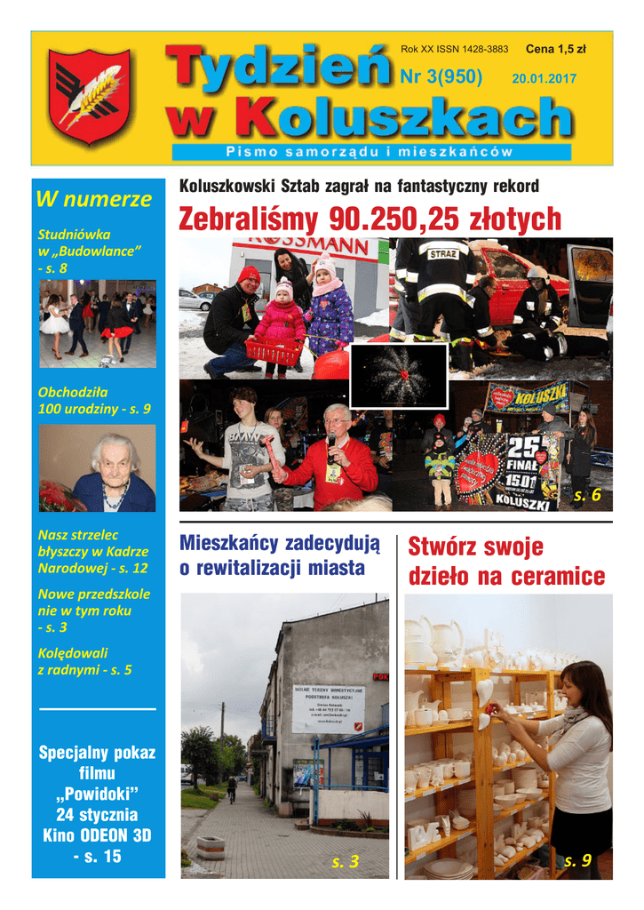 Rok XX ISSN 1428-3883 Nr 3(950) W numerze Studniówka w „Budowlance” - s. 8 Cena 1,5 zł 20.01.2017 Koluszkowski Sztab zagrał na fantastyczny rekord Zebraliśmy 90.250,25 złotych Obchodziła 100 urodziny - s. 9 s. 6 s. 6 Nasz strzelec błyszczy w Kadrze Narodowej - s. 12 Mieszkańcy zadecydują o rewitalizacji miasta Nowe przedszkole nie w tym roku - s. 3 Stwórz swoje dzieło na ceramice Kolędowali z radnymi - s. 5 Specjalny pokaz filmu „Powidoki” 24 stycznia Kino ODEON 3D - s. 15 s. 3 s. 9 2 Tydzień w Koluszkach nr 3 Policja – 997, 44 714 69 77 Straż Pożarna – 998, 44 714 08 90 OSP Koluszki – 44 714 58 27 Pogotowie Ratunkowe – 999 URZĄD MIEJSKI Sekretariat – 44 725 67 00 Redakcja TwK – 44 725 67 18 USC – 44 725 67 60 Biblioteka Miejska – 44 714 58 38 MOK, Kino Odeon – 44 714 58 80 Wykaz opłat w 2017 roku Infolinia ws. przyłączy Opłata za podatek od nieruchomości, rolny, leśny: - do 15 marca - I rata - do 15 maja - II rata - do 15 września - III rata - do 15 listopada - IV rata Tu uzyskasz informacje jak przyłączyć się do sieci kanalizacyjnej Opłata za podatek od środków transportowych: - do 15 lutego – I rata - do 15 września - II rata BIURO INŻYNIERA GMINY – 44 725 67 68 KPGK sp. z o.o. – 44 714 58 45 ZUK – 44 714 04 95 MGOPS – 44 714 58 25 Pogot. Energetyczne – 991 – 468-30-15-31 Pog. Kanalizacyjne – 44 714 58 79 507 078 873 Pogotowie Gazowe – 992 Ujęcie wody i pog. wod. – 44 714 58 24 605 370 020 Oczyszcz. ścieków – 44 714 58 79 507 078 873 Opłata za posiadanie zezwoleń na sprzedaż alkoholu: - do 31 stycznia – I rata - do 31 maja – II rata - do 30 września – III rata SŁUŻBA ZDROWIA NZOZ Zdrowie – 44 714 08 00 NZOZ Eskulap – 44 714 50 00 NZOZ Med-Kol (POZ) – 44 714 22 22 – 44 714 67 57 Med-Kol (poradnie specj.) – 44 714 55 00 Laboratorium Analityk – 44 714 57 57 Poradnia Stomatologiczno-Protetyczna ul. Staszica 34 – 44 714 44 98 Punkt Selektywnej Zbiórki Odpadów Komunalnych Apteki: ul. Żwirki 2 ul. Sikorskiego 6 ul. Głowackiego 20 ul. Korczaka 5 ul. 11 Listopada 33 ul. Przejazd 6 ul. 3 Maja 8 ul. 3 Maja 19G ul. Brzezińska 54 Gałków – 44 714 16 01 – 44 714 16 43 – 44 714 02 86 – 44 714 24 58 – 44 714 03 63 – 44 714 24 44 – 44 714 07 88 – 44 714 02 73 – 44 714 00 77 – 605 509 502 Taxi Biuro numerów Informacja PKP KSM Spółdz. Odlewnik Urząd Pracy – 44 714 58 42 – 118 913 – 19 757 – 44 714 10 41 – 44 714 19 98 – 44 714 13 54 Ośrodek Psychoedukacji i Psychoterapii ul. Staszica 34 – 44 714 67 67 wt. 13.00-20.00, czw. 15.00-19.30, pt. 14.00 – 20.00, sob. 8.30-11.00 Abstynenckie Stowarzyszenie Klub Wzajemnej Pomocy „Ostoja”, ul. Staszica 34 44 714-23-40 (pn-pt 17.00-20.00) Punkt Konsultacyjny Pomocy Rodzinie ul. Staszica 34 – 44 714-58-69 (pn.: 17.15-20.00 i śr. 17.15-20.30) Grupa AA „Iskierka”, Koluszki ul. Mickiewicza 40, 501 648 560 20.01.2017 r. Opłata za wywóz odpadów komunalnych: - do 10 marca – I rata - do 10 maja - II rata - do 10 lipca - III rata - do 10 września - IV rata - do 10 listopada - V rata przy ulicy Reymonta w Koluszkach jest czynny w dniach: • środa w godz. 10.00 – 17.00 • sobota w godz. 8.00 – 16.00 Biuro Inżyniera Gminy przyjmuje zgłoszenia dotyczące: awarii sieci infrastruktury miejskiej (wodociągi, kanalizacja, ciepłownictwo, energetyka, gazociągi); l zimowego odśnieżania dróg; l uszkodzeń dróg i infrastruktury drogowej (znaki, przepusty); l uszkodzonych studzienek kanalizacyjnych; l nielegalnie prowadzonych robót w pasie drogowym; l uszkodzonych latarni oświetlenia ulicznego; l czystości w mieście i gminie; l przepełnień pojemników na odpady; l przepełnionych ulicznych koszy na śmieci; l zniszczeń i nieporządku wokół pojemników do selektywnej zbiórki odpadów; l zaśmiecenia terenów; l dzikich wysypisk śmieci; l padłych zwierząt; l inne związane z bieżącą obsługą mieszkań-ców w zakresie gospodarki komunalnej. l 44 725 67 68 telefon czynny 24h KOLUSZKI ZAWSZE W CENTRUM Pon. - piąt. w godz. 7.00-15.00 tel. 44 714 58 79 Kasa Urzędu poniedziałek, środa, czwartek – 8.15-14.10 wtorek – 8.15-15.10 piątek – 8.15-13.10 przerwa w godzinach: 10.30-10.40 i 12.30-12.50 Burmistrz Koluszek informuje, że producent rolny chcący ubiegać się o zwrot podatku akcyzowego zawartego w cenie oleju napędowego powinien złożyć wniosek o zwrot podatku akcyzowego w terminie od 1 lutego do 28 lutego 2017 roku wraz z fakturami VAT (bądź kopiami), stanowiącymi dowód zakupu oleju napędowego w okresie 6 miesięcy, które poprzedzają miesiąc złożenia wniosku. Jednocześnie przypomina się, że drugi termin składania wniosków przypada na okres od 1 sierpnia do 31 sierpnia 2017 roku. 21.01. ul. 3 Maja 19 G 22.01. ul. Brzezińska 54 23.01. ul. Przejazd 6 24.01. ul. 11 Listopada 33 25.01. ul. Żwirki 2 26.01. ul. Głowackiego 20 27.01. ul. Korczaka 5 28.01. ul. Sikorskiego 6A 20.01.2017 r. Tydzień w Koluszkach nr 3 3 Mamy pieniądze na stworzenie Wytypowano działki do programu programu rewitalizacji miasta Mieszkanie Plus Gmina Koluszki otrzymała dofinansowanie w wysokości 146 tys. zł na stworzenie kompleksowego programu rewitalizacji miasta Koluszki. W ramach programu ma powstać szczegółowa diagnoza społeczno-przestrzenno-funkcjonalna oraz inwentaryzacja urbanistyczna, poruszająca się wokół następujących zadań: przebudowy placu targowego niedaleko ul. 11 Listopada czyli tzw. wtorkowego rynku, budynku mu- Wiemy już w którym miejscu na terenie Koluszek mogą powstać budynki wielorodzinne w ramach rządowego programu Mieszkanie Plus. Władze naszego miasta zaproponowały następujące gminne działki: za marketem Carrefour przy ul. Głowackiego, oraz na polach między os. An- wspólnej dyskusji zaproszeni zostaną radni, przedstawicielami instytucji publicznych oraz zaintere- dersa i tyłem cmentarza. Ostateczną decyzję co do lokalizacji podejmie sp