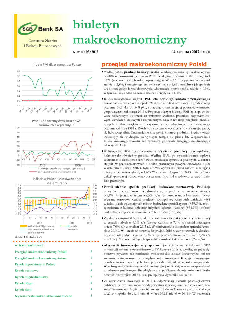 biuletyn makroekonomiczny Centrum Skarbu i Relacji Biznesowych NUMER 02/2017 14 LUTEGO 2017 ROKU przegląd makroekonomiczny Polski Indeks PMI dla przemysłu w Polsce 56 Według GUS, produkt krajowy brutto w ubiegłym roku był realnie wyższy 55 o 2,8% w porównaniu z rokiem 2015. Analogiczny wzrost w 2015 r. wyniósł 3,9% (w cenach stałych roku poprzedniego). W 2016 r. popyt krajowy wzrósł realnie o 2,8%. Spożycie ogółem zwiększyło się o 3,6%, podobnie jak spożycie w sektorze gospodarstw domowych. Akumulacja brutto spadła realnie o 0,3%, w tym nakłady brutto na środki trwałe obniżyły się o 5,5%. 54 53 52 51 Indeks menedżerów logistyki PMI dla polskiego sektora przemysłowego 50 20 rośnie nieprzerwanie od listopada. W styczniu indeks ten wzrósł z grudniowego poziomu 54,3 pkt. do 54,8 pkt., świadcząc o najsilniejszej poprawie warunków gospodarczych od marca 2015 r. Poprawa odczytu indeksu PMI była spowodowana najszybszym od trzech lat wzrostem wielkości produkcji, napływem nowych zamówień krajowych i zagranicznych wraz z redukcją zaległości produkcyjnych, a także zwiększeniem zapasów pozycji zakupionych do najwyższego poziomu od lipca 1998 r. Zwolniło za to tempo tworzenia nowych miejsc pracy, ale było wciąż silne. Utrzymała się silna presja kosztów produkcji. Średnie koszty zwiększyły się w drugim najszybszym tempie od pięciu lat. Doprowadziło to do znacznego wzrostu cen wyrobów gotowych (drugiego najsilniejszego od maja 2011 r.). 10 W listopadzie 2016 r. zaobserwowano ożywienie produkcji przemysłowej, 49 Produkcja przemysłowa oraz nowe za mówienia w przemyśle 60 50 40 30 0 -10 XII II IV VI VIII -20 X XII II IV VI VIII 2015 X XII 2016 Produkcja sprzedana przemysłu ogółem (r/r) Nowe zamówienia w przemyśle (r/r) Inflacja w Polsce i jej najważniejsze determinanty 10,0 8,0 6,0 4,0 2,0 0,0 -2,0 -4,0 -6,0 -8,0 -10,0 -12,0 I III V VII IX XI I III 2015 Wskaźniki CPI (prawa oś) użytkowanie mieszkania odzież i obuwie V VII IX 2016 żywność transport 2,0 1,6 1,2 0,8 0,4 0,0 -0,4 -0,8 -1,2 -1,6 -2,0 XI I 2017 Źródło: IHS Markit, GUS które trwało również w grudniu. Według GUS, po wyeliminowaniu wpływu czynników o charakterze sezonowym produkcja sprzedana przemysłu w cenach stałych (w przedsiębiorstwach o liczbie pracujących powyżej dziewięciu osób) w ostatnim miesiącu 2016 r. była o 3,9% wyższa niż przed rokiem, a w ujęciu miesięcznym zwiększyła się o 1,6%. W stosunku do grudnia 2015 r. wzrost produkcji sprzedanej odnotowano w szesnastu (spośród trzydziestu czterech) działach przemysłu. Powoli słabnie spadek produkcji budowlano-montażowej. Produkcja ta wyrównana sezonowo ukształtowała się w grudniu na poziomie niższym o 9,8% r/r, jednak wyższym o 2,5% m/m. W porównaniu z listopadem niewyrównany sezonowo wzrost produkcji wystąpił we wszystkich działach, czyli w jednostkach wykonujących roboty budowlane specjalistyczne (+39,9%), roboty związane z budową obiektów inżynierii lądowej i wodnej (+36,9%) i roboty budowlane związane ze wznoszeniem budynków (+28,3%). Zgodnie z danymi GUS, w grudniu odnotowano wzrost sprzedaży detalicznej w cenach stałych o 6,1% r/r (wobec wzrostu o 7,4% r/r przed miesiącem oraz o 7,0% r/r w grudniu 2015 r.). W porównaniu z listopadem sprzedaż wzrosła o 20,6%. W okresie od stycznia do grudnia 2016 r. wzrost sprzedaży detalicznej w cenach stałych wyniósł 5,7% r/r (w porównaniu ze wzrostem o 3,7% r/r w 2015 r.). W cenach bieżących sprzedaż wzrosła o 6,4% r/r i o 21,3% m/m. Aktywność inwestycyjna w gospodarce jest wciąż niska. Z informacji NBP w tym numerze: Przegląd makroekonomiczny Polski 1 Przegląd makroekonomiczny świata 2 Rynek depozytowy w Polsce 3 Rynek walutowy 4 Rynek międzybankowy 4 Rynek długu 4 Rynek akcji 4 Wybrane wskaźniki makroekonomiczne 5 o kondycji sektora przedsiębiorstw w IV kwartale 2016 r. wynika, że przedsiębiorstwa prywatne nie zamierzają zwiększać działalności inwestycyjnej ani też wznowić wstrzymanych w ubiegłym roku inwestycji. Decyzje inwestycyjne przedsiębiorstw prywatnych hamuje przede wszystkim wysoka niepewność. Wyraźnego ożywienia aktywności inwestycyjnej można się natomiast spodziewać w sektorze publicznym. Przedsiębiorstwa publiczne planują zwiększyć liczbę nowych inwestycji w 2017 r. oraz przyspieszyć dynamikę nakładów. Za ograniczenie inwestycji w 2016 r. odpowiadają głównie przedsiębiorstwa publiczne, w tym zwłaszcza przedsiębiorstwa samorządowe. Z danych Ministerstwa Finansów wynika, że wartość inwestycji jednostek samorządu terytorialnego w 2016 r. spadła do 24,16 mld zł wobec 37,22 mld zł w 2015 r. W budżetach STR. 2 BIULETYN MAKROEKONOMICZNY Centrum Skarbu i Relacji Biznesowych jednostek samorządu terytorialnego w 2016 r. odnotowano nadwyżkę wynoszącą 7,69 mld zł przy planowanym deficycie w wysokości 6,57 mld zł. W okresie do listopada nadwyżka ta wynosiła jednak jeszcze 19,11 mld zł. Jej spadek może świadczyć o przyspieszeniu absorpcji unijnych środków. W okresie od stycznia do listopada 2016 r. eksport w cenach bieżących wyniósł 730,01 mld zł, a import 711,11 mld zł. Dodatnie saldo osiągnęło 18,91 mld zł wobec 19,13 mld zł w okresie od stycznia do października 2016 r. oraz 9,6 mld zł w okresie od stycznia do listopada 2015 r. W porównaniu z analogicznym okresem minionego roku eksport zwiększył się o 5,7%, a import był wyższy o 4,4%. W samym listopadzie zaobserwowano nieznaczne ożywienie w wymianie handlowej z zagranicą. Zgodnie z miesięcznymi danymi NBP, saldo wymiany towarowej wyniosło 444 mln zł wobec -550 mln zł w październiku i 1,52 mld w listopadzie 2015 r. Eksport towarów wzrósł o 5,8% m/m i o 7,9% r/r, wynosząc 69,89 mld zł. Import osiągnął 69,45 mld zł, rosnąc o 4,3% m/m i o 9,8% r/r. Na kształtowanie się handlu zagranicznego w kolejnych miesiącach negatywny wpływ będzie wywierać niepe