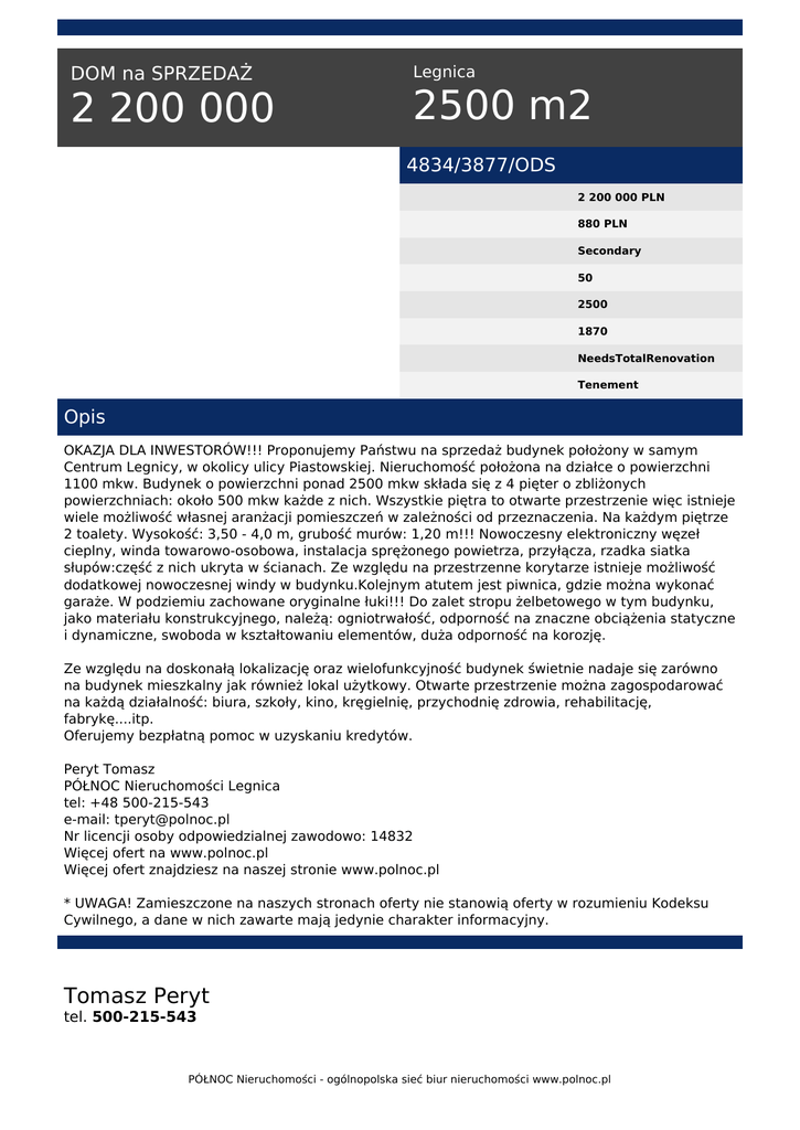 DOM na SPRZEDAŻ 2 200 000 Legnica 2500 m2 4834/3877/ODS 2 200 000 PLN 880 PLN Secondary 50 2500 1870 NeedsTotalRenovation Tenement Opis OKAZJA DLA INWESTORÓW!!! Proponujemy Państwu na sprzedaż budynek położony w samym Centrum Legnicy, w okolicy ulicy Piastowskiej. Nieruchomość położona na działce o powierzchni 1100 mkw. Budynek o powierzchni ponad 2500 mkw składa się z 4 pięter o zbliżonych powierzchniach: około 500 mkw każde z nich. Wszystkie piętra to otwarte przestrzenie więc istnieje wiele możliwość własnej aranżacji pomieszczeń w zależności od przeznaczenia. Na każdym piętrze 2 toalety. Wysokość: 3,50 - 4,0 m, grubość murów: 1,20 m!!! Nowoczesny elektroniczny węzeł cieplny, winda towarowo-osobowa, instalacja sprężonego powietrza, przyłącza, rzadka siatka słupów:część z nich ukryta w ścianach. Ze względu na przestrzenne korytarze istnieje możliwość dodatkowej nowoczesnej windy w budynku.Kolejnym atutem jest piwnica, gdzie można wykonać garaże. W podziemiu zachowane oryginalne łuki!!! Do zalet stropu żelbetowego w tym budynku, jako materiału konstrukcyjnego, należą: ogniotrwałość, odporność na znaczne obciążenia statyczne i dynamiczne, swoboda w kształtowaniu elementów, duża odporność na korozję. Ze względu na doskonałą lokalizację oraz wielofunkcyjność budynek świetnie nadaje się zarówno na budynek mieszkalny jak również lokal użytkowy. Otwarte przestrzenie można zagospodarować na każdą działalność: biura, szkoły, kino, kręgielnię, przychodnię zdrowia, rehabilitację, fabrykę....itp. Oferujemy bezpłatną pomoc w uzyskaniu kredytów. Peryt Tomasz PÓŁNOC Nieruchomości Legnica tel: +48 500-215-543 e-mail: [email protected] Nr licencji osoby odpowiedzialnej zawodowo: 14832 Więcej ofert na www.polnoc.pl Więcej ofert znajdziesz na naszej stronie www.polnoc.pl * UWAGA! Zamieszczone na naszych stronach oferty nie stanowią oferty w rozumieniu Kodeksu Cywilnego, a dane w nich zawarte mają jedynie charakter informacyjny. Tomasz Peryt tel. 500-215-543 PÓŁNOC Nieruchomości - ogólnopolska sieć biur nieruchomości www.polnoc.pl email: [email protected] PÓŁNOC Nieruchomości - ogólnopolska sieć biur nieruchomości www.polnoc.pl Powered by TCPDF (www.tcpdf.org)