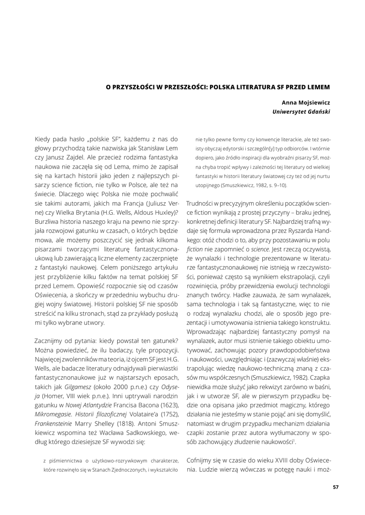 O PRZYSZŁOŚCI W PRZESZŁOŚCI: POLSKA LITERATURA SF PRZED LEMEM Anna Mojsiewicz Uniwersytet Gdański Kiedy pada hasło „polskie SF”, każdemu z nas do głowy przychodzą takie nazwiska jak Stanisław Lem czy Janusz Zajdel. Ale przecież rodzima fantastyka naukowa nie zaczęła się od Lema, mimo że zapisał się na kartach historii jako jeden z najlepszych pisarzy science fiction, nie tylko w Polsce, ale też na świecie. Dlaczego więc Polska nie może pochwalić sie takimi autorami, jakich ma Francja (Juliusz Verne) czy Wielka Brytania (H.G. Wells, Aldous Huxley)? Burzliwa historia naszego kraju na pewno nie sprzyjała rozwojowi gatunku w czasach, o których będzie mowa, ale możemy poszczycić się jednak kilkoma pisarzami tworzącymi literaturę fantastycznona ukową lub zawierającą liczne elementy zaczerpnięte z fantastyki naukowej. Celem poniższego artykułu jest przybliżenie kilku faktów na temat polskiej SF przed Lemem. Opowieść rozpocznie się od czasów Oświecenia, a skończy w przededniu wybuchu drugiej wojny światowej. Historii polskiej SF nie sposób streścić na kilku stronach, stąd za przykłady posłużą mi tylko wybrane utwory. Zacznijmy od pytania: kiedy powstał ten gatunek? Można powiedzieć, że ilu badaczy, tyle propozycji. Najwięcej zwolenników ma teoria, iż ojcem SF jest H.G. Wells, ale badacze literatury odnajdywali pierwiastki fantastycznonaukowe już w najstarszych eposach, takich jak Gilgamesz (około 2000 p.n.e.) czy Odyseja (Homer, VIII wiek p.n.e.). Inni uptrywali narodzin gatunku w Nowej Atlantydzie Francisa Bacona (1623), Mikromegasie. Historii filozoficznej Volataire’a (1752), Frankensteinie Marry Shelley (1818). Antoni Smuszkiewicz wspomina też Wacława Sadkowskiego, według którego dziesiejsze SF wywodzi się: z piśmiennictwa o użytkowo-rozrywkowym charakterze, które rozwinęło się w Stanach Zjednoczonych, i wykształciło nie tylko pewne formy czy konwencje literackie, ale też swoisty obyczaj edytorski i szczególn[y] typ odbiorców. I wtórnie dopiero, jako źródło inspiracji dla wyobraźni pisarzy SF, można chyba tropić wpływy i zależności tej literatury od wielkiej fantastyki w historii literatury światowej czy też od jej nurtu utopijnego (Smuszkiewicz, 1982, s. 9–10). Trudności w precyzyjnym określeniu początków science fiction wynikają z prostej przyczyny – braku jednej, konkretnej definicji literatury SF. Najbardziej trafną wydaje się formuła wprowadzona przez Ryszarda Handkego: otóż chodzi o to, aby przy pozostawaniu w polu fiction nie zapomnieć o science. Jest rzeczą oczywistą, że wynalazki i technologie prezentowane w literaturze fantastycznonaukowej nie istnieją w rzeczywistości, ponieważ często są wynikiem ekstrapolacji, czyli rozwinięcia, próby przewidzenia ewolucji technologii znanych twórcy. Hadke zauważa, że sam wynalazek, sama technologia i tak są fantastyczne, więc to nie o rodzaj wynalazku chodzi, ale o sposób jego prezentacji i umotywowania istnienia takiego konstruktu. Wprowadzając najbardziej fantastyczny pomysł na wynalazek, autor musi istnienie takiego obiektu umotywować, zachowując pozory prawdopodobieństwa i naukowości, uwzględniając i (zazwyczaj właśnie) ekstrapolując wiedzę naukowo-techniczną znaną z czasów mu współczesnych (Smuszkiewicz, 1982). Czapka niewidka może służyć jako rekwizyt zarówno w baśni, jak i w utworze SF, ale w pierwszym przypadku będzie ona opisana jako przedmiot magiczny, którego działania nie jesteśmy w stanie pojąć ani się domyślić, natomiast w drugim przypadku mechanizm działania czapki zostanie przez autora wytłumaczony w sposób zachowujący złudzenie naukowości1. Cofnijmy się w czasie do wieku XVIII doby Oświecenia. Ludzie wierzą wówczas w potęgę nauki i moż57 LITERATURA, KOMIKS, TEATR | ANNA MOJSIEWICZ liwości, jakie ona daje. Z drugiej strony Oświecenie wpływa też na rozwój moralny; coraz częściej słychać głosy krytyki dotyczące ustroju społecznego, nierówności społeczenych oraz przywar, które zdają się być przekleństwem ludzkości: pychy, zawiści, chciwości czy żądzy władzy. Z owej mieszanki zachwytu nad potencjałem człowieka oraz uczucia wstydu wywołanego ułomnością istoty ludzkiej wyrastają najsłynniejsze powieści utopijne oraz powiastki filiozoficzne: Podróże Guliwera (1726) Jonatanna Swifta czy Mikromegas (1752) Voltaire’a. W Polsce Ignacy Krasicki pisze i wydaje w 1776 roku Mikołaja Doświadczyńskiego przypaki, utwór, który zawiera pierwiastki obu wspomnianych gatunków. Jak to się ma do SF? W niespełna dziesięć lat po publikacji Mikołaja Doświadczyńskiego, w 1785 roku, wydano powieść Wojciech Zdarzyński, życie i przypadki swe opisujący, autorstwa ks. Michała Dymitra Krajewskiego, dla której inspiracją była powieść Krasickiego. Podobnie jak w Mikołaju..., również tego bohatera powieści poznajemy w trakcie edukacji, a epizod ten jest właściwie satyrą na ówczes ny poziom oświaty. Następnie Wojciech udaje się do Warszawy, by przepuścić cały majątek i w konsekwencji jest zmuszony do ucieczki z kraju przed wierzycielami. W tym celu wykorzystuje balon, za pomocą którego dostaje się na Księżyc! W naszych czasach, z naszą wiedzą, taka podróż oczywiście będzie uważana za całkowicie fantastyczną. Jednak jeśli spojrzymy na czasy współczes ne Krajewskiemu, widzimy wyraźnie, że mamy do czynienia właśnie ze wspomnianą przed chwilą ekstrapolacją, odnoszącą się nie tyle do postępu czasowego, co możliwości technicznych (warto wspomnieć, że pierwszy załogowy lot balonem odbył się w Polsce cztery lata po ukazaniu się książki w 1789 roku). Towarzysz Wojciecha, jego kolega z lat szkolnych, tłumaczy to dość, jak się wydaje na tamte czasy, logicznie: utracił własność dążącą do centrum Ziemi i nabył własności uciekającej od centrum, a tak spadliśmy właśnie na Księżyc 