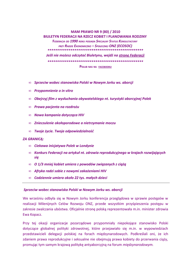 MAM PRAWO NR 9 (80) / 2010 BIULETYN FEDERACJI NA RZECZ KOBIET I PLANOWANIA RODZINY FEDERACJA OD 1990 ROKU POSIADA SPECJALNY STATUS KONSULTACYJNY PRZY RADZIE EKONOMICZNO – SPOŁECZNEJ ONZ (ECOSOC) ************************************************** Jeśli nie możesz odczytać Biuletynu, wejdź na stronę Federacji ************************************************** POLUB NAS NA FACEBOOKU • Sprzeciw wobec stanowiska Polski w Nowym Jorku ws. aborcji • Przypomnienie o in vitro • Obejrzyj film z wysłuchania obywatelskiego nt. turystyki aborcyjnej Polek • Prawa pacjenta na rozdrożu • Nowa kampania dotycząca HIV • Znieczulenie okołoporodowe a nietrzymanie moczu • Twoje życie. Twoja odpowiedzialność ZA GRANICĄ: • Ciekawa inicjatywa Polek w Londynie • Konkurs Federacji na artykuł nt. zdrowia reprodukcyjnego w krajach rozwijających się • O 1/3 mniej kobiet umiera z powodów związanych z ciążą • Afryka radzi sobie z nowymi zakażeniami HIV • Codziennie umiera około 22 tys. małych dzieci Sprzeciw wobec stanowiska Polski w Nowym Jorku ws. aborcji We wrześniu odbyła się w Nowym Jorku konferencja przeglądowa w sprawie postępów w realizacji Milenijnych Celów Rozwoju ONZ, przede wszystkim przyśpieszenia postępu w zakresie zwalczania ubóstwa. Oficjalnie stronę polską reprezentowała m.in. minister zdrowia Ewa Kopacz. Przy tej okazji organizacje pozarządowe przypomniały niepokojące stanowisko Polski dotyczące globalnej polityki zdrowotnej, które przejawiało się m.in. w wypowiedziach przedstawicieli delegacji polskiej na forach międzynarodowych. Podkreślali oni, że ich zdaniem prawa reprodukcyjne i seksualne nie obejmują prawa kobiety do przerwania ciąży, promując tym samym krajową politykę antyaborcyjną na forum międzynarodowym. Wanda Nowicka (Federacja) podczas konferencji prasowej, jaką wspólnie zorganizowały: Stowarzyszenie Amnesty International Polska i Federacja na rzecz Kobiet i Planowania Rodziny, podkreśliła, że sprzeciwiając się poparciu unijnej polityki na rzecz zdrowia i praw reprodukcyjnych, Polska niejako zgadza się na śmierć 70 000 kobiet, które co roku umierają w wyniku nielegalnej aborcji. Podkreśliła, że rząd polski powinien zdać sobie sprawę, że jako kraj wchodzący w skład Unii ma realny wpływ na jej politykę, a więc również na politykę krajów rozwijających się, gdzie sytuacja kobiet i dzieci jest diametralnie różna od sytuacji w Polsce i gdzie sprzeciw naszego kraju w sprawie legalnej aborcji oznacza śmierć dla tysięcy kobiet. Draginja Nadażdin (AI), zauważyła, że rząd polski w swoich oficjalnych stanowiskach wypowiadanych na forum ONZ nie tylko nie przyczynia się do szybszej realizacji Milenijnych Celów Rozwoju, ale w pewnych obszarach utrudnia osiągnięcie zakładanego celu poprzez wygłaszanie stanowiska sprzecznego z unijnymi standardami dotyczącymi praw człowieka. Ma to miejsce w sprawie uznania dostępu do wody pitnej za podstawowe prawo człowieka oraz uznania, że prawa reprodukcyjne człowieka zakładają również dostęp do legalnej aborcji. Federacja na rzecz Kobiet i Planowania Rodziny wysłała na ręce minister zdrowia apel o zmianę dotychczas prezentowanego stanowiska w sprawie dostępu do legalnej aborcji oraz o przyłączenie się Polski do grona państw rozwiniętych, dla których życie kobiety jest wartością nadrzędną i oficjalne przyznanie jej prawa do usunięcia ciąży w ramach jej podstawowych praw reprodukcyjnych i seksualnych, przynajmniej na forum międzynarodowym. Czytaj apel Federacji Przypomnienie o in vitro Rządzący przypomnieli sobie o leżących w Sejmie projektach dotyczących in vitro. Jako pierwszy głos zabrał premier, obiecując że jego partia zajmie się kwestią zapłodnienia pozaustrojowego już tej jesieni. Marszałek Sejmu Grzegorz Schetyna zapowiedział przeprowadzenie konsultacji w tej sprawie z szefami klubów. Pojawi się kolejny projekt Platformy, który ma zaproponować regulację kwestii związanych z in vitro. Tym razem Donald Tusk w wywiadzie dla Wprost przyznał, że projekt będzie bardziej liberalny od wersji Jarosława Gowina, lecz nie pozbawiony rygorów, można przypuszczać, że będzie stanowił połączenie projektów Gowina i Kidawy – Błońskiej. Podkreślił także, że w jego opinii wskazana jest refundacja zabiegu. Z kolei Stefan Niesiołowski podkreślił w rozmowie w Polskim Radiu, że w tej sprawie brak jednolitego stanowiska w jego partii i prawdopodobnie refundacja obejmowałaby tylko najuboższe rodziny. Obecnie w Sejmie znajduje się już 5 projektów dotyczących kwestii In vitro, w tym PROJEKT Społecznego Zespołu ds. Przygotowania Obywatelskiego Projektu Ustawy w sprawie Zapłodnienia In Vitro, który został złożony przez posła Marka Balickiego. Obejrzyj film z wysłuchania obywatelskiego nt. turystyki aborcyjnej Polek Zapraszamy do obejrzenia filmu z wysłuchania obywatelskiego na temat turystyki aborcyjnej Polek, który jest dostępny na profilu Federacji na rzecz Kobiet i Planowania Rodziny na YOUTUBE. Jest on w 6 częściach. Oto linki do nich: http://www.youtube.com/watch?v=3IjVS4VFaWA http://www.youtube.com/watch?v=Q5WI51kmI5w&feature=related http://www.youtube.com/watch?v=rCIcDv0oA7I&feature=related http://www.youtube.com/watch?v=cNpLyCMT7FY&feature=channel http://www.youtube.com/watch?v=YBJyOry-0oA&feature=channel http://www.youtube.com/watch?v=RMO0py8l0Q0&feature=channel Federację można znaleźć na youtube wpisując w przeglądarkę "federacja na rzecz kobiet", "wysłuchanie" lub inne wyrazy związane z działalnością Federacji. Prawa pacjenta na rozdrożu Trwają prace Ministerstwa Zdrowia nad projektem nowelizacji ustawy o prawach pacjenta. Zmiany zaczynają się już od samego tytułu, który w nowej wersji został rozszerzony (o podkreśloną część) i ma brzmieć: „o prawach pacjenta i Rzeczniku Praw Pacjenta oraz odszkodowaniach za błędy medyczne”. W ef