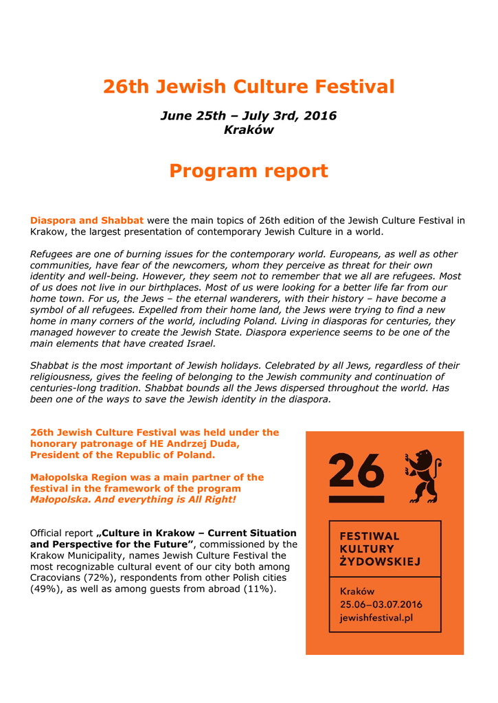 26th Jewish Culture Festival June 25th – July 3rd, 2016 Kraków Program report Diaspora and Shabbat were the main topics of 26th edition of the Jewish Culture Festival in Krakow, the largest presentation of contemporary Jewish Culture in a world. Refugees are one of burning issues for the contemporary world. Europeans, as well as other communities, have fear of the newcomers, whom they perceive as threat for their own identity and well-being. However, they seem not to remember that we all are refugees. Most of us does not live in our birthplaces. Most of us were looking for a better life far from our home town. For us, the Jews – the eternal wanderers, with their history – have become a symbol of all refugees. Expelled from their home land, the Jews were trying to find a new home in many corners of the world, including Poland. Living in diasporas for centuries, they managed however to create the Jewish State. Diaspora experience seems to be one of the main elements that have created Israel. Shabbat is the most important of Jewish holidays. Celebrated by all Jews, regardless of their religiousness, gives the feeling of belonging to the Jewish community and continuation of centuries-long tradition. Shabbat bounds all the Jews dispersed throughout the world. Has been one of the ways to save the Jewish identity in the diaspora. 26th Jewish Culture Festival was held under the honorary patronage of HE Andrzej Duda, President of the Republic of Poland. Małopolska Region was a main partner of the festival in the framework of the program Małopolska. And everything is All Right! Official report „Culture in Krakow – Current Situation and Perspective for the Future”, commissioned by the Krakow Municipality, names Jewish Culture Festival the most recognizable cultural event of our city both among Cracovians (72%), respondents from other Polish cities (49%), as well as among guests from abroad (11%). 26th Jewish Culture Festival in Krakow 150 events in the main program - 27 musical events: concerts, DJ-parties - 8 performances (contemporary dance and theater) - 23 lectures, meetings, discussions and sound lectures - 48 workshop session in 18 different series - 29 guided tours in 10 different series - 5 ceremonies - 7 film screenings - 3 exhibitions 140 events in the accompanying events program, organized by our partners: JCC Krakow, Galicia Jewish Museum, Beit Kraków and others 204 artists, lecturers and instructors from 8 countries: Israel, USA, Hungary, Turkey, Germany, Ukraine, Canada, Poland 58 volunteers from 8 countries: Poland, Ukraine, Belorussia, Germany, Austria, Italy, USA, France 102 accredited journalists and photo reporters from Polish and foreign media 285 media reports and information in Polish and international media, including: Gazeta Wyborcza, Dziennik Polski, Polish Television, Polish Radio, Twój Styl as well as Haaretz, Jewish Weekly, Forward 30,000 persons participated in 26th festival’s events, including 18,000 persons who participated in the Shalom on Szeroka Street concert 200,000 persons watched Shalom on Szeroka Street concert broadcast on Polish Television TVP2 (1,8% of all those who watched TV at that time) 24,461 persons watched live on-line streaming of the concerts on the festival website and ajctv.pl website 1,118 persons watched live on-line streaming of the Shalom on Szeroka Street concert on the website of the National Institute for Audiovisual Arts 111,241 views of the festival website by 26,443 users between June 20th and July 4th, 2016, including 61% of new users and 39% of returning users 11,922 persons likes Festival on Facebook 11,433 persons – average outreach of festival posts on Facebook 529 followers on Instagram 1,434 subscribers of the festival YouTube channel 854,710 views of video clips on festival YouTube channel 26th JCF – EVENTS MUSIC: concert, DJ-parties 1. 2. 3. 4. 5. 6. 7. 8. Concerts in the Tempel Synagogue Classics at Noon: Cantor Benzion Miller (USA), Menachem Bristowski (IL); Patron of the concert: Goldberg Family Foundation Cantors’ Concert: By the Rivers of Babylon…: Cantor Benzion Miller (USA), Cantor Yaakov Lemmer (USA), Cantor Avraham Kirshenbaum (IL), Choir of the Great Synagogue in Jerusalem conducted by Maestro Eli Yaffe (IL), Sinfonietta Cracovia chamber orchestra (PL); accompaniment: Menachem Bristowski (IL) Kronos Quartet (USA): David Harrington (violin), John Sherba (violin), Hank Dutt (viola), Sunny Jungin Yang (cello); special guest: David Krakauer (clarinet) Selda Bağcan & Boom Pam (TR / IL): Selda Bağcan (vocal), Uri Brauner Kinrot (vocal, guitar), Yuval Zolotov (tuba), Dani Ever-HaDani (keyboards), Ira Raviv (drums), Kemal Esen (baglama) Glass House Orchestra (USA / HU): Frank London (trumpet), Aram Bajakian (guitar), Pablo Aslan (bas), Yonadav Halevy (drums), Jake Shulman-Ment (violin), Miklós Lukács (cimbalom), Edina Szirtes Mókus (vocal, violin), Béla Ágoston (winds). The project has been a part of the Year of Hungarian Culture and organized with the support from Ministry of Foreign Affairs and Trade and the Balassi Institute. The Brothers Nazaroff (USA / DE): Daniel Kahn (accordeon), Michael Alpert (guitar), Bob Cohen (mandolin), Jake Shulman-Ment (violin), Hampus Melin (drums) Diwan Saz & Lubna Salameh, Rabin David Menachem, Muhammad Gadir (IL). Concert under patronage of the Taube Foundation for Jewish Life and Culture; dedicated to the memory of Jan Kulczyk, Polish businessman and philanthropist Leopold Kozłowski. The Master and His Followers (PL): Leopold Kozłowski, Halina Jarczyk (violin), Marta Bizoń (vocal), Kamila Klimczak (vocal), Renata Świerczyńska (vocal), Andrzej Róg (vocal), Jacek Bylica (piano), Michał Wierba (piano), Olek Brzeziński (piano), Jacek Hołubowski (accordion), Jacek Cygan (moderation); Concert under patronage of Małopolska Region as a part of the program Małopolska. And Everything is All Right! Musical events in the Cheder Libelid (PL): Ola Bilińska (