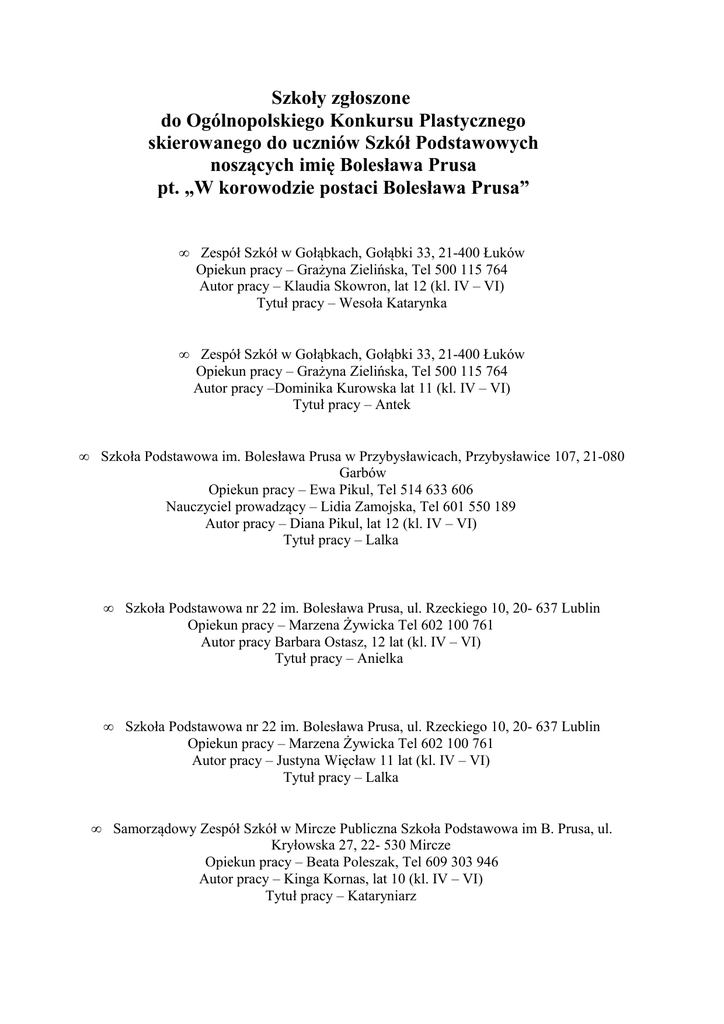 Szkoły zgłoszone do Ogólnopolskiego Konkursu Plastycznego skierowanego do uczniów Szkół Podstawowych noszących imię Bolesława Prusa pt. „W korowodzie postaci Bolesława Prusa” • • Zespół Szkół w Gołąbkach, Gołąbki 33, 21-400 Łuków Opiekun pracy – Grażyna Zielińska, Tel 500 115 764 Autor pracy – Klaudia Skowron, lat 12 (kl. IV – VI) Tytuł pracy – Wesoła Katarynka • Zespół Szkół w Gołąbkach, Gołąbki 33, 21-400 Łuków Opiekun pracy – Grażyna Zielińska, Tel 500 115 764 Autor pracy –Dominika Kurowska lat 11 (kl. IV – VI) Tytuł pracy – Antek Szkoła Podstawowa im. Bolesława Prusa w Przybysławicach, Przybysławice 107, 21-080 Garbów Opiekun pracy – Ewa Pikul, Tel 514 633 606 Nauczyciel prowadzący – Lidia Zamojska, Tel 601 550 189 Autor pracy – Diana Pikul, lat 12 (kl. IV – VI) Tytuł pracy – Lalka • • Szkoła Podstawowa nr 22 im. Bolesława Prusa, ul. Rzeckiego 10, 20- 637 Lublin Opiekun pracy – Marzena Żywicka Tel 602 100 761 Autor pracy Barbara Ostasz, 12 lat (kl. IV – VI) Tytuł pracy – Anielka • Szkoła Podstawowa nr 22 im. Bolesława Prusa, ul. Rzeckiego 10, 20- 637 Lublin Opiekun pracy – Marzena Żywicka Tel 602 100 761 Autor pracy – Justyna Więcław 11 lat (kl. IV – VI) Tytuł pracy – Lalka Samorządowy Zespół Szkół w Mircze Publiczna Szkoła Podstawowa im B. Prusa, ul. Kryłowska 27, 22- 530 Mircze Opiekun pracy – Beata Poleszak, Tel 609 303 946 Autor pracy – Kinga Kornas, lat 10 (kl. IV – VI) Tytuł pracy – Kataryniarz • Samorządowy Zespół Szkół w Mircze Publiczna Szkoła Podstawowa im B. Prusa, ul. Kryłowska 27, 22- 530 Mircze Opiekun pracy – Krystyna Bajerska, Tel 600 976 374 Autor pracy – Kaja Pacaj , lat 11 (kl. IV – VI) Tytuł pracy – Pani Łęcka • Szkoła Podstawowa nr 1 im. B. Prusa w Zielonce, ul. Staszica 56, 05 – 220 Zielonka Opiekun pracy – Magdalena Roguska, Tel 22 781 00 11 Autor pracy – Michał Świtalski , lat 12 (kl. IV – VI) Tytuł pracy – W laboratorium Geista • Szkoła Podstawowa nr 1 im. B. Prusa w Zielonce, ul. Staszica 56, 05 – 220 Zielonka Opiekun pracy – Hanna Fuśnik, Tel 603 538 123 Autor pracy – Kazimierz Janski , lat 7 (kl. I – III) Tytuł pracy – Antek • Szkoła Podstawowa nr 1 im. B. Prusa w Zielonce, ul. Staszica 56, 05 – 220 Zielonka Opiekun pracy – Marianna Frąckowiak , Tel 22 781 00 11 Autor pracy – Julia Włostowska, lat 13 (kl. IV – VI) Tytuł pracy – brak • Szkoła Podstawowa nr 1 im. B. Prusa w Zielonce, ul. Staszica 56, 05 – 220 Zielonka Opiekun pracy – Hanna Fuśnik, Tel 603 538 123 Autor pracy – Hanna Dobrowolska, lat 7 (kl. I –III) Tytuł pracy – Antek • Szkoła Podstawowa im. B. Prusa w Wiercanach, 39 -124 Iwierzyce Opiekun pracy –Ewa Medygrał Tel 694 630 530 Autor pracy – Marcelina Ochab, lat 13 (kl. IV –VI) Tytuł pracy – Antek • Szkoła Podstawowa im. B. Prusa w Wiercanach, 39 -124 Iwierzyce Opiekun pracy –Ewa Medygrał Tel 694 630 530 Autor pracy – Oliwia Siwiec, lat 13 (kl. IV –VI) Tytuł pracy – Antek • Szkoła Podstawowa im. B. Prusa w Wiercanach, 39 -124 Iwierzyce Opiekun pracy –Ewa Medygrał Tel 694 630 530 Autor pracy – Małgorzata Gąsior , lat 13 (kl. IV –VI) Tytuł pracy – Anielka Prace nagrodzone w Ogólnopolskim Konkursie Plastycznym skierowanym do uczniów Szkół Podstawowych noszących imię Bolesława Prusa pt. „W korowodzie postaci Bolesława Prusa” KATEGORIA KLAS I – III I MIEJSCE Szkoła Podstawowa nr 1 im. B. Prusa w Zielonce, ul. Staszica 56, 05 – 220 Zielonka Opiekun pracy – Hanna Fuśnik, Tel 603 538 123 Autor pracy – Hanna Dobrowolska, lat 7 (kl. I –III) Tytuł pracy – Antek WYRÓŻNIENIE Szkoła Podstawowa nr 1 im. B. Prusa w Zielonce, ul. Staszica 56, 05 – 220 Zielonka Opiekun pracy – Hanna Fuśnik, Tel 603 538 123 Autor pracy – Kazimierz Janski , lat 7 (kl. I – III) Tytuł pracy – Antek KATEGORIA KLAS IV – VI I MIEJSCE Szkoła Podstawowa nr 1 im. B. Prusa w Zielonce, ul. Staszica 56, 05 – 220 Zielonka Opiekun pracy – Marianna Frąckowiak , Tel 22 781 00 11 Autor pracy – Julia Włostowska, lat 13 (kl. IV – VI) Tytuł pracy – brak II MIEJSCE Szkoła Podstawowa im. B. Prusa w Wiercanach, 39 -124 Iwierzyce Opiekun pracy –Ewa Medygrał Tel 694 630 530 Autor pracy – Marcelina Ochab, lat 13 (kl. IV –VI) Tytuł pracy – Antek III MIEJSCE Szkoła Podstawowa im. B. Prusa w Wiercanach, 39 -124 Iwierzyce Opiekun pracy –Ewa Medygrał Tel 694 630 530 Autor pracy – Oliwia Siwiec, lat 13 (kl. IV –VI) Tytuł pracy – Antek WYRÓŻNIENIA: Samorządowy Zespół Szkół w Mircze Publiczna Szkoła Podstawowa im B. Prusa, ul. Kryłowska 27, 22- 530 Mircze Opiekun pracy – Krystyna Bajerska, Tel 600 976 374 Autor pracy – Kaja Pacaj , lat 11 (kl. IV – VI) Tytuł pracy – Pani Łęcka Szkoła Podstawowa nr 22 im. Bolesława Prusa, ul. Rzeckiego 10, 20- 637 Lublin Opiekun pracy – Marzena Żywicka Tel 602 100 761 Autor pracy – Justyna Więcław 11 lat (kl. IV – VI) Tytuł pracy – Lalka Samorządowy Zespół Szkół w Mircze Publiczna Szkoła Podstawowa im B. Prusa, ul. Kryłowska 27, 22- 530 Mircze Opiekun pracy – Beata Poleszak, Tel 609 303 946 Autor pracy – Kinga Kornas, lat 10 (kl. IV – VI) Tytuł pracy – Kataryniarz Szkoła Podstawowa im. B. Prusa w Wiercanach, 39 -124 IwierzyceOpiekun pracy –Ewa Medygrał Tel 694 630 530 Autor pracy – Małgorzata Gąsior , lat 13 (kl. IV –VI) Tytuł pracy – Anielka Szkoła Podstawowa nr 22 im. Bolesława Prusa, ul. Rzeckiego 10, 20- 637 Lublin Opiekun pracy – Marzena Żywicka Tel 602 100 761 Autor pracy Barbara Ostasz, 12 lat (kl. IV – VI) Tytuł pracy – Anielka