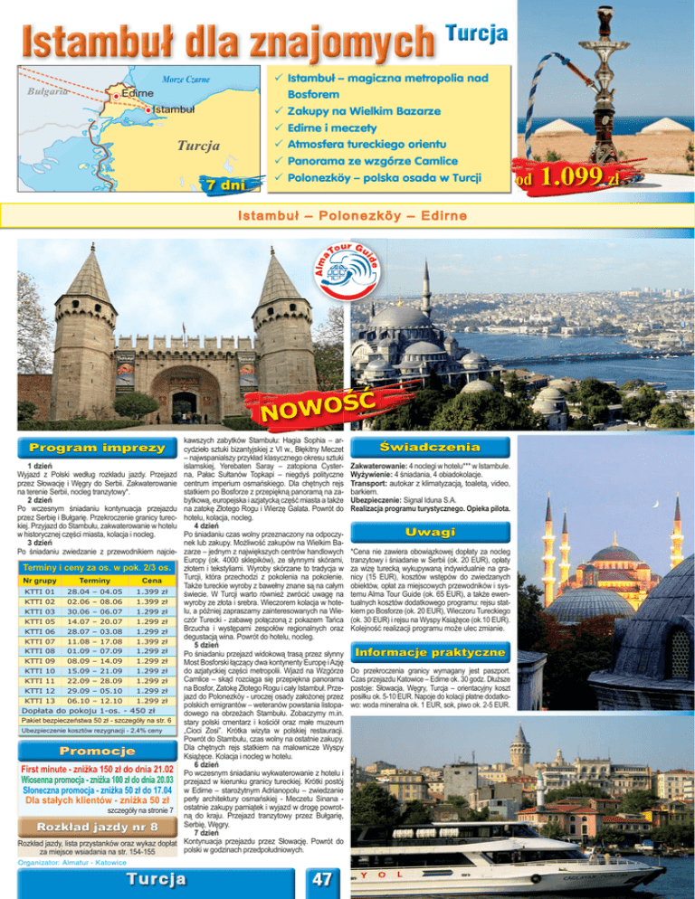 Istambuł dla znajomych Istambuł – magiczna metropolia nad Morze Czarne Bułgaria Edirne Bosforem Zakupy na Wielkim Bazarze Istambuł Edirne i meczety Atmosfera tureckiego orientu Turcja Panorama ze wzgórze Camlice 7 dni Polonezköy – polska osada w Turcji Istambuł – Polonezköy – Edirne ŚĆ NOWO Program imprezy 1 dzień Wyjazd z Polski według rozkładu jazdy. Przejazd przez Słowację i Węgry do Serbii. Zakwaterowanie na terenie Serbii, nocleg tranzytowy*. 2 dzień Po wczesnym śniadaniu kontynuacja przejazdu przez Serbię i Bułgarię. Przekroczenie granicy tureckiej. Przyjazd do Stambułu, zakwaterowanie w hotelu w historycznej części miasta, kolacja i nocleg. 3 dzień Po śniadaniu zwiedzanie z przewodnikiem najcie- Terminy i ceny za os. w pok. 2/3 os. Nr grupy Terminy Cena KTTI 01 28.04 – 04.05 1.399 zł KTTI 02 02.06 – 08.06 1.399 zł KTTI 03 30.06 – 06.07 1.299 zł KTTI 05 14.07 – 20.07 1.299 zł KTTI 06 28.07 – 03.08 1.299 zł KTTI 07 11.08 – 17.08 1.399 zł KTTI 08 01.09 – 07.09 1.299 zł KTTI 09 08.09 – 14.09 1.299 zł KTTI 10 15.09 – 21.09 1.299 zł KTTI 11 22.09 – 28.09 1.299 zł KTTI 12 29.09 – 05.10 1.299 zł KTTI 13 06.10 – 12.10 1.299 zł Dopłata do pokoju 1-os. - 450 zł Pakiet bezpieczeństwa 50 zł - szczegóły na str. 6 Ubezpieczenie kosztów rezygnacji - 2,4% ceny Promocje First minute - zniżka 150 zł do dnia 21.02 Wiosenna promocja - zniżka 100 zł do dnia 20.03 Słoneczna promocja - zniżka 50 zł do 17.04 Dla stałych klientów - zniżka 50 zł szczegóły na stronie 7 Rozkład jazdy nr 8 Rozkład jazdy, lista przystanków oraz wykaz dopłat za miejsce wsiadania na str. 154-155 kawszych zabytków Stambułu: Hagia Sophia – arcydzieło sztuki bizantyjskiej z VI w., Błękitny Meczet – najwspanialszy przykład klasycznego okresu sztuki islamskiej, Yerebaten Saray – zatopiona Cysterna, Pałac Sułtanów Topkapi – niegdyś polityczne centrum imperium osmańskiego. Dla chętnych rejs statkiem po Bosforze z przepiękną panoramą na zabytkową, europejska i azjatycką część miasta a także na zatokę Złotego Rogu i Wierzę Galata. Powrót do hotelu, kolacja, nocleg. 4 dzień Po śniadaniu czas wolny przeznaczony na odpoczynek lub zakupy. Możliwość zakupów na Wielkim Bazarze – jednym z największych centrów handlowych Europy (ok. 4000 sklepików), ze słynnymi skórami, złotem i tekstyliami. Wyroby skórzane to tradycja w Turcji, która przechodzi z pokolenia na pokolenie. Także tureckie wyroby z bawełny znane są na całym świecie. W Turcji warto również zwrócić uwagę na wyroby ze złota i srebra. Wieczorem kolacja w hotelu, a później zapraszamy zainteresowanych na Wieczór Turecki - zabawę połączoną z pokazem Tańca Brzucha i występami zespołów regionalnych oraz degustacją wina. Powrót do hotelu, nocleg. 5 dzień Po śniadaniu przejazd widokową trasą przez słynny Most Bosforski łączący dwa kontynenty Europę i Azję do azjatyckiej części metropolii. Wjazd na Wzgórze Camlice – skąd rozciąga się przepiękna panorama na Bosfor, Zatokę Złotego Rogu i cały Istambuł. Przejazd do Polonezköy - uroczej osady założonej przez polskich emigrantów – weteranów powstania listopadowego na obrzeżach Stambułu. Zobaczymy m.in. stary polski cmentarz i kościół oraz małe muzeum „Cioci Zosi”. Krótka wizyta w polskiej restauracji. Powrót do Stambułu, czas wolny na ostatnie zakupy. Dla chętnych rejs statkiem na malownicze Wyspy Książęce. Kolacja i nocleg w hotelu. 6 dzień Po wczesnym śniadaniu wykwaterowanie z hotelu i przejazd w kierunku granicy tureckiej. Krótki postój w Edirne – starożytnym Adrianopolu – zwiedzanie perły architektury osmańskiej - Meczetu Sinana ostatnie zakupy pamiątek i wyjazd w drogę powrotną do kraju. Przejazd tranzytowy przez Bułgarię, Serbię, Węgry. 7 dzień Kontynuacja przejazdu przez Słowację. Powrót do polski w godzinach przedpołudniowych. Organizator: Almatur - Katowice Turcja 47 Świadczenia Zakwaterowanie: 4 noclegi w hotelu*** w Istambule. Wyżywienie: 4 śniadania, 4 obiadokolacje. Transport: autokar z klimatyzacją, toaletą, video, barkiem. Ubezpieczenie: Signal Iduna S.A. Realizacja programu turystycznego. Opieka pilota. Uwagi *Cena nie zawiera obowiązkowej dopłaty za nocleg tranzytowy i śniadanie w Serbii (ok. 20 EUR), opłaty za wizę turecką wykupywaną indywidualnie na granicy (15 EUR), kosztów wstępów do zwiedzanych obiektów, opłat za miejscowych przewodników i systemu Alma Tour Guide (ok. 65 EUR), a także ewentualnych kosztów dodatkowego programu: rejsu statkiem po Bosforze (ok. 20 EUR), Wieczoru Tureckiego (ok. 30 EUR) i rejsu na Wyspy Książęce (ok.10 EUR). Kolejność realizacji programu może ulec zmianie. Informacje praktyczne Do przekroczenia granicy wymagany jest paszport. Czas przejazdu Katowice – Edirne ok. 30 godz. Dłuższe postoje: Słowacja, Węgry, Turcja – orientacyjny koszt posiłku ok. 5-10 EUR. Napoje do kolacji płatne dodatkowo: woda mineralna ok. 1 EUR, sok, piwo ok. 2-5 EUR. od 1.099 zł