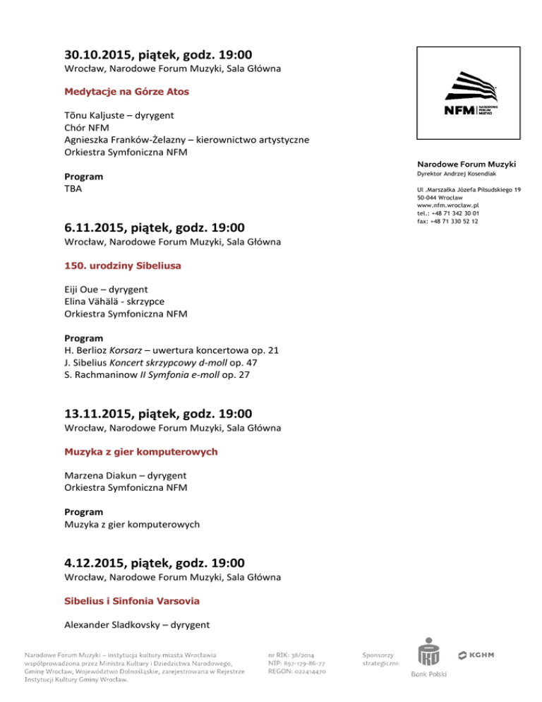 30.10.2015, piątek, godz. 19:00 Wrocław, Narodowe Forum Muzyki, Sala Główna Medytacje na Górze Atos Tõnu Kaljuste – dyrygent Chór NFM Agnieszka Franków-Żelazny – kierownictwo artystyczne Orkiestra Symfoniczna NFM Narodowe Forum Muzyki Program TBA 6.11.2015, piątek, godz. 19:00 Wrocław, Narodowe Forum Muzyki, Sala Główna 150. urodziny Sibeliusa Eiji Oue – dyrygent Elina Vähälä - skrzypce Orkiestra Symfoniczna NFM Program H. Berlioz Korsarz – uwertura koncertowa op. 21 J. Sibelius Koncert skrzypcowy d-moll op. 47 S. Rachmaninow II Symfonia e-moll op. 27 13.11.2015, piątek, godz. 19:00 Wrocław, Narodowe Forum Muzyki, Sala Główna Muzyka z gier komputerowych Marzena Diakun – dyrygent Orkiestra Symfoniczna NFM Program Muzyka z gier komputerowych 4.12.2015, piątek, godz. 19:00 Wrocław, Narodowe Forum Muzyki, Sala Główna Sibelius i Sinfonia Varsovia Alexander Sladkovsky – dyrygent Dyrektor Andrzej Kosendiak Ul .Marszałka Józefa Piłsudskiego 19 50-044 Wrocław www.nfm.wrocław.pl tel.: +48 71 342 30 01 fax: +48 71 330 52 12 Jakub Haufa – skrzypce Marcel Markowski – wiolonczela Orkiestra Sinfonia Varsovia Program Z. Noskowski Step K. Penderecki Concerto doppio per violino, viola e orchestra, w wersji na skrzypce i wiolonczelę J. Sibelius II Symfonia op. 43 11.12.2015, piątek, godz. 19:00 Wrocław, Narodowe Forum Muzyki, Sala Główna Słowik i skrzypce Benjamin Shwartz – dyrygent Henning Kraggerud - skrzypce Orkiestra Symfoniczna NFM Program I. Strawiński Pieśń słowika J. S. Bach Koncert skrzypcowy C. Nielsen III Symfonia op. 27, FS 60 „Sinfonia espansiva” 15.01.2016, piątek, godz. 19:00 Wrocław, Narodowe Forum Muzyki, Sala Główna Krylov - wirtuoz skrzypiec Ernst Kovacic – dyrygent Sergej Krylov - skrzypce Orkiestra Symfoniczna NFM Program TBA 22.01.2016, piątek, godz. 19:00 Wrocław, Narodowe Forum Muzyki, Sala Główna Symfoniczna potęga romantyków Daniel Raiskin – dyrygent Alexei Volodin – fortepian Orkiestra Symfoniczna NFM Program S. Moniuszko Polonez koncertowy A-dur J. Brahms II Koncert fortepianowy B-dur op. 83 Strona 2 z 5 A. Dvořák VIII Symfonia g-moll op. 88 5.02.2016, piątek, godz. 19:00 Wrocław, Narodowe Forum Muzyki, Sala Główna Dziadek do orzechów Daniel Raiskin – dyrygent Alexei Volodin – fortepian Orkiestra Symfoniczna NFM Program P. Czajkowski Suita do baletu Dziadek do orzechów F. Chopin II Koncert fortepianowy f-moll op. 21 P. Czajkowski V Symfonia e-moll op. 64 4.03.2016, piątek, godz. 19:00 Wrocław, Narodowe Forum Muzyki, Sala Główna Kaspszyk i Orkiestra Symfoniczna NFM Jacek Kaspszyk – dyrygent Orkiestra Symfoniczna NFM Program TBA 1.04.2016, piątek, godz. 19:00 Wrocław, Narodowe Forum Muzyki, Sala Główna West Side Stories Benjamin Shwartz – dyrygent Benjamin Hochman – fortepian Orkiestra Symfoniczna NFM Program Ch. Ives The Unanswered Question L. Bernstein Tańce symfoniczne z musicalu West Side Story M. Feldman Madame Press Died Last Week AT Ninety L. Bernstein II Symfonia “The Age of Anxiety” 22.04.2016, piątek, godz. 19:00 Wrocław, Narodowe Forum Muzyki, Sala Główna Strona 3 z 5 Kaspszyk i Orkiestra Symfoniczna NFM* Jacek Kaspszyk – dyrygent Orkiestra Symfoniczna NFM Program TBA 6.05.2016, piątek, godz. 19:00 Wrocław, Narodowe Forum Muzyki, Sala Główna L.U.C L.U.C Orkiestra Symfoniczna NFM Program L.U.C – zamówienie kompozytorskie dokonane przez Orkiestrę Symfoniczną NFM 13.05.2016, piątek, godz. 19:00 Wrocław, Narodowe Forum Muzyki, Sala Główna Beethoven - VIII Symfonia Christoph Altstaedt– dyrygent Orkiestra Symfoniczna NFM Program L. van Beethoven VIII Symfonia F-dur op. 93 27.05.2016, piątek, godz. 19:00 Wrocław, Narodowe Forum Muzyki, Sala Główna Koncert dyplomowy wydziału Dyrygentury i Instrumentalistyki Akademii Muzycznej im. Karola Lipińskiego we Wrocławiu z Orkiestrą Symfoniczną NFM Dyrygenci – TBA Soliści – TBA Orkiestra Symfoniczna NFM Program TBA 3.06.2016, piątek, godz. 19:00 Wrocław, Narodowe Forum Muzyki, Sala Główna Strona 4 z 5 Zamknięcie sezonu symfonicznego Benjamin Schwartz – dyrygent Richard Goode – fortepian Orkiestra Symfoniczna NFM Program L. van Beethoven V Koncert fortepianowy Es-dur op. 73 Strona 5 z 5
