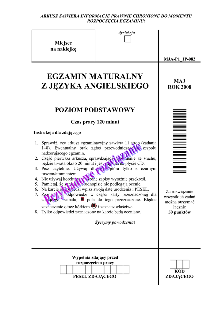 ARKUSZ ZAWIERA INFORMACJE PRAWNIE CHRONIONE DO MOMENTU ROZPOCZĘCIA EGZAMINU! dysleksja Miejsce na naklejkę MJA-P1_1P-082 EGZAMIN MATURALNY Z JĘZYKA ANGIELSKIEGO MAJ ROK 2008 POZIOM PODSTAWOWY Czas pracy 120 minut Instrukcja dla zdającego 1. Sprawdź, czy arkusz egzaminacyjny zawiera 11 stron (zadania 1–8). Ewentualny brak zgłoś przewodniczącemu zespołu nadzorującego egzamin. 2. Część pierwsza arkusza, sprawdzająca rozumienie ze słuchu, będzie trwała około 20 minut i jest nagrana na płycie CD. 3. Pisz czytelnie. Używaj długopisu/pióra tylko z czarnym tuszem/atramentem. 4. Nie używaj korektora, a błędne zapisy wyraźnie przekreśl. 5. Pamiętaj, że zapisy w brudnopisie nie podlegają ocenie. 6. Na karcie odpowiedzi wpisz swoją datę urodzenia i PESEL. 7. Zaznaczając odpowiedzi w części karty przeznaczonej dla zdającego, zamaluj pola do tego przeznaczone. Błędne i zaznacz właściwe. zaznaczenie otocz kółkiem 8. Tylko odpowiedzi zaznaczone na karcie będą oceniane. Za rozwiązanie wszystkich zadań można otrzymać łącznie 50 punktów Życzymy powodzenia! Wypełnia zdający przed rozpoczęciem pracy PESEL ZDAJĄCEGO KOD ZDAJĄCEGO Egzamin maturalny z języka angielskiego Poziom podstawowy 2 ROZUMIENIE ZE SŁUCHU Zadanie 1. (5 pkt) Usłyszysz dwukrotnie krótką rozmowę John’a i Mary. Na podstawie usłyszanych informacji odpowiedz na pytania 1.1. – 1.5. i zaznacz znakiem X odpowiednią rubrykę w tabeli. Za każdą poprawną odpowiedź otrzymasz 1 punkt. Who John Mary 1.1. prefers practice to theory? X 1.2. makes better omelettes? X 1.3. used to work as a cook? X 1.4. couldn’t find a job? X 1.5. met interesting people at university? X PRZENIEŚ ROZWIĄZANIA NA KARTĘ ODPOWIEDZI! Zadanie 2. (5 pkt) Usłyszysz dwukrotnie zapowiedzi pięciu programów telewizyjnych. Na podstawie usłyszanych informacji odpowiedz na podane pytanie, wpisując w każdą kratkę (2.1. – 2.5.) odpowiednią literę (A–F). Jeden punkt (A–F) podany został dodatkowo i nie odnosi się do żadnej wypowiedzi. Za każdą poprawną odpowiedź otrzymasz 1 punkt. What is each programme about? 2.1. B A. A LIFE CHANGE 2.2. A B. DAY-TO-DAY PROBLEMS KIDS HAVE 2.3. F C. A NICE PLACE TO LIVE 2.4. C D. PROFESSIONALS HELPING KIDS 2.5. D E. CHILDREN’S ACCIDENTS AT HOME F. PEOPLE IN UNIFORMS SAVING OUR LIVES PRZENIEŚ ROZWIĄZANIA NA KARTĘ ODPOWIEDZI! Egzamin maturalny z języka angielskiego Poziom podstawowy 3 Zadanie 3. (5 pkt) Usłyszysz dwukrotnie tekst narracyjny. Z podanych możliwości odpowiedzi wybierz właściwą, zgodną z treścią tekstu. Zakreśl literę A, B lub C. Za każdą poprawną odpowiedź otrzymasz 1 punkt. 3.1. According to the speaker, Harry’s childhood was A. quite typical. B. not very happy. C. really pleasant. 3.2. The speaker mentions Harry’s A. negative attitude to the Army. B. ability to work with kids. C. success as a rugby player. 3.3. Harry and his brother A. heard about the tsunami on the radio. B. made the Red Cross send more help. C. were glad they could help some people. 3.4. Which is true about Harry? A. He can apologise if he is wrong. B. He has always had a lot of girlfriends. C. He has never had problems with the media. 3.5. The speaker presents A. some facts from Harry’s life. B. his personal opinion on Harry. C. different views on the Royal Family. PRZENIEŚ ROZWIĄZANIA NA KARTĘ ODPOWIEDZI! Egzamin maturalny z języka angielskiego Poziom podstawowy 4 ROZUMIENIE TEKSTU CZYTANEGO Zadanie 4. (7 pkt) Przeczytaj poniższy tekst. Do każdej części tekstu (4.1. – 4.7.) dopasuj zdanie, podsumowujące jej treść (A – H) i wpisz w każdą kratkę odpowiednią literę. Jedno zdanie nie odnosi się do żadnego tekstu. Za każdą poprawną odpowiedź otrzymasz 1 punkt. A. The colour represents the way you earn money. B. Somebody who is different from the others. C. Life is rarely so clear. D. You knew who was who. E. The real world is full of lies. F. It’s a more official way. G. Not all lies are harmful. H. Black is not always negative. BLACK & WHITE 4.1. B A ‘black sheep’ is a person who ignores tradition or does things that are not accepted. A family may have a member who is not like them. This person brings shame to his/her group and is not welcome at family meetings. 4.2. D ‘White hats’ and ‘black hats’ were symbols of the ‘good guys’ and the ‘bad guys’ in American western movies. The early movies were made with no sound, so the film directors put a white hat on the hero and a black hat on the bad guy. That way even a small child could tell who the hero was. 4.3. H Black is also used in some expressions that describe good things. Being ‘in the black’ is a good situation. It is a business expression that means a company has made a profit. The expression comes from the colour of ink used in the books that record a company’s profits or losses. Profits are written in black and losses are written in red. 4.4. A A ‘white collar’ job is the kind of job many people want to have. It is a job where you work at a desk, using your brain instead of your muscles. Usually ‘white-collar’ jobs pay more than ‘blue-collar’ jobs - jobs where you use your physical strength. 4.5. F Some expressions use black and white together. Someone may say that your suggestion sounds all right, but he wants to see it in black and white. He wants to get a formal document in writing or in print – black ink on white paper. 4.6. C Some people see things only in black and white. In this expression, black and white represent opposite extremes. Most things in the world aren’t so simple. One side of an issue is not all good and the other side is not all bad. In the real world there are many grey areas where black and white mix to represent the true situation. 4.7. G We know that we should tell the truth, but is it always good? Sometimes people say something which is not true because they don’t want to hurt their friends or relat