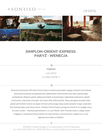 SIMPLON-ORIENT-EXPRESS: PARYŻ - WENECJA TERMIN Lato 2014 LICZBA OSÓB: 2 Stworzony pod koniec XIX wieku Orient-Express niemal od początku swojego istnienia stał się ikoną luksusowych podróży europejskiej elity: dyplomatów, biznesmenów oraz ludzi szlacheckiego pochodzenia. Wnętrza, godne najlepszych hoteli, przemierzające najbardziej malownicze zakątki kontynentu, rozpoczęły w Europie tak zwany Złoty Wiek podróży. Sławy pociągowi przydały takie postaci jak Graham Greene czy Agata Christie umieszczając akcję swoich powieści w jego wnętrzach. Dziś, funkcjonujący pod nazwą Venice Simplon-Orient-Express pociąg nie stracił nic ze swojego czaru: na trasie Londyn – Wenecja podróżowali m. in. Liza Minelli i John Travolta; ludzie z całego świata ściągają na londyńską Victoria Station, by wypić drinka w słynnym barze i spędzić noc w tym legendarnym hotelu na kółkach. PROGRAM WYJAZDU 1. PARYŻ: VENICE SIMPLON-ORIENT-EXPRESS Transfer na stację kolejową Gare de l'Est zakwaterowanie w dwuosobowych luksusowych przedziałach. Odjazd pociągu o godzinie 21.57. Czterodaniowa kolacja w jednym z historycznych luksusowych wagonów jadalnych. Czas na zabawę przy muzyce na żywo w wagonie barowym. Nocleg. 2. VENICE SIMPLON-ORIENT-EXPRESS / WENECJA: HOTEL SPLENDID Kontynentalne śniadanie serwowane w przedziale. Czas na relaks oraz kawę w wagonie barowym. Podziwianie alpejskich widoków za oknem. Lunch z widokiem na lokalne winnice i małe miasteczka. O godzinie 16.03 kilkuminutowy postój pociągu w Weronie. O godzinie 17.56 przyjazd na stację Santa Lucia w Wenecji. Zakończenie podróży Wykwaterowanie z pociągu Transfer do hotelu Splendid. Zakwaterowanie. Czas na kolację we własnym zakresie. Nocleg 3. WENECJA: HOTEL SPLENDID Śniadanie w hotelowej restauracji. Czas na samodzielna eksplorację miasta. Lunch oraz kolacja we własnym zakresie. Nocleg. 4. WENECJA Śniadanie w hotelowej restauracji. Czas na chwilę relaksu i wykwaterowanie. Możliwość zorganizowania transferu w dowolne miejsce. ZAKWATEROWANIE: POCIĄG VENICE SIMPLON-ORIENT-EXPRESS: Przez lata, poczynając od 1920 roku, luksusowe wagony Orient Expressu stawały się legendą elitarnych podróży europejskiej inteligencji. Dziś odnowiony skład, który zachował wszystkie elementy luksusowego wystroju z początku XX wieku, przecina Europę wioząc na pokładzie gości z całego świata. Przedziały, wyposażone w wygodną kanapę, podnóżki oraz stylowy stolik w czasie dnia pełnią funkcję lounge, wieczorem zaś zmieniają się w zaciszną sypialnię z dwoma łóżkami. W każdym przedziale znajduje się umywalka,toalety ulokowane są na końcu wagonów. W pociągu znajdują się trzy wagony restauracyjne: Cote d‘ Azur (z 1929 roku), Etoile du Nord (z 1926 roku) oraz L‘ Oriental z (1927 roku). Posiłki przygotowywane przez wyśmienitych francuskich kucharzy serwowane są w różnych godzinach, tak, by każdy z gości mógł czuć się jak najbardziej komfortowo. Skład posiada także wagon barowy rodem z początku XX wieku otwarty do ostatniego gościa. Niejednokrotnie wypełniony muzyką na żywo bar zmienia się w parkiet, na którym do późnej nocy tańczy się charlestona! WENECJA: STARHOTELS SPLENDID VENICE **** Elegancki hotel Starhotels Splendid Venice usytuowany jest nad kanałem w dzielnicy Mercerie w Wenecji, 5 minut spacerem od Placu Świętego Marka. Obiekt zapewnia prywatną przystań, znakomitą restaurację oraz pokoje z parkietem. Pokoje wyposażone są w klimatyzację, minibar oraz telewizor z dostępem do kanałów telewizji satelitarnej i kanałów pay-per-view. W niektórych pokojach można bezpłatnie korzystać z bezprzewodowego dostępu do Internetu. W łazience znajduje się miękki szlafrok i kapcie. Z niektórych pokoi roztacza się widok na kanał. www.splendidvenice.starhotels.com/en/home.aspx CENA : 2390 EUR/os. CENA ŚWIADCZEŃ ZAWIERA Przejazd pociągiem Simplon-Orient-Express na trasie Paryż-Wenecja Noclegi w Wenecji według programu Wyżywienie: w pociągu Simplon-OrientExpress Full Board (kolacja, śniadanie oraz lunch) Woda i herbata serwowana tylko podczas śniadania w pociągu Trasfery w Wenecji: stacja kolejowa – hotel Splendid Ubezpieczenie turystyczne TU EUROPA (KL-3000 €/os. NNW – 5000 €/os. OC- 50 00 €/os. bagaż - 500€/os.) CENA ŚWIADCZEŃ NIE ZAWIERA Przelotów międzynarodowych Transferów innych niż zawarte w programie Napojów do lunchu i kolacji podczas podrózy pociągiem Innych napojów oraz posiłków nie zawartych w programie Wydatków osobistych Napiwków