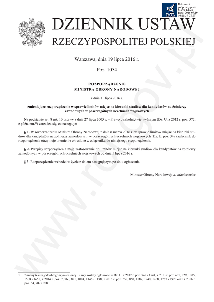Dokument podpisany przez Marek Głuch Data: 2016.07.19 16:25:39 CEST DZIENNIK USTAW v.p l RZECZYPOSPOLITEJ POLSKIEJ Warszawa, dnia 19 lipca 2016 r. Poz. 1054 ROZPORZĄDZENIE MINISTRA OBRONY NARODOWEJ .go z dnia 11 lipca 2016 r. zmieniające rozporządzenie w sprawie limitów miejsc na kierunki studiów dla kandydatów na żołnierzy zawodowych w poszczególnych uczelniach wojskowych Na podstawie art. 8 ust. 10 ustawy z dnia 27 lipca 2005 r. – Prawo o szkolnictwie wyższym (Dz. U. z 2012 r. poz. 572, z późn. zm.1)) zarządza się, co następuje: § 1. W rozporządzeniu Ministra Obrony Narodowej z dnia 8 marca 2016 r. w sprawie limitów miejsc na kierunki studiów dla kandydatów na żołnierzy zawodowych w poszczególnych uczelniach wojskowych (Dz. U. poz. 349) załącznik do rozporządzenia otrzymuje brzmienie określone w załączniku do niniejszego rozporządzenia. w. rcl § 2. Przepisy rozporządzenia mają zastosowanie do limitów miejsc na kierunki studiów dla kandydatów na żołnierzy zawodowych w poszczególnych uczelniach wojskowych od dnia 5 lipca 2016 r. § 3. Rozporządzenie wchodzi w życie z dniem następującym po dniu ogłoszenia. ww Minister Obrony Narodowej: A. Macierewicz 1) Zmiany tekstu jednolitego wymienionej ustawy zostały ogłoszone w Dz. U. z 2012 r. poz. 742 i 1544, z 2013 r. poz. 675, 829, 1005, 1588 i 1650, z 2014 r. poz. 7, 768, 821, 1004, 1146 i 1198, z 2015 r. poz. 357, 860, 1187, 1240, 1268, 1767 i 1923 oraz z 2016 r. poz. 64, 907 i 908. zarządzanie nawigacja OGÓŁEM mechatronika mechanika i budowa maszyn lotnictwo i kosmonautyka logistyka kryptologia i cyberbezpieczeństwo inżynieria bezpieczeństwa 392 20 35 35 30 56 50 12 8 20 764 92 –2– 230 217 18 4 70 v.p l 13 .go 10 Dziennik Ustaw informatyka geodezja i kartografia 31 12 97 17 59 Limity miejsc w poszczególnych uczelniach wojskowych Wojskowa Akademia Wyższa Szkoła Akademia Wyższa Szkoła Techniczna Oficerska Wojsk Marynarki Wojennej Oficerska Sił im. Jarosława Lądowych im. gen. im. Bohaterów Powietrznych Dąbrowskiego Tadeusza Kościuszki Westerplatte w Gdyni w Dęblinie we Wrocławiu w Warszawie w. rcl elektronika i telekomunikacja chemia budownictwo KIERUNEK STUDIÓW ww Załącznik do rozporządzenia Ministra Obrony Narodowej dnia 11Dz. lipcaU.2016 r. (poz. 1054) Załącznik do rozporządzenia Ministra Obrony Narodowej z dnia 11 lipcaz2016r. poz.. Poz. 1054