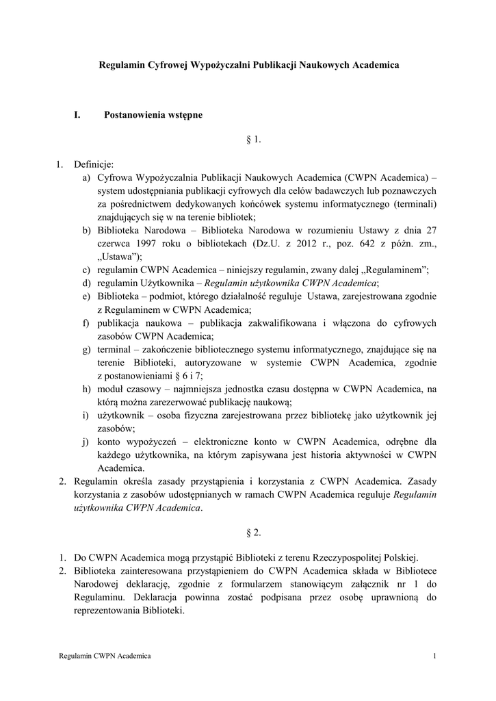 Regulamin Cyfrowej Wypożyczalni Publikacji Naukowych Academica I. Postanowienia wstępne § 1. 1. Definicje: a) Cyfrowa Wypożyczalnia Publikacji Naukowych Academica (CWPN Academica) – system udostępniania publikacji cyfrowych dla celów badawczych lub poznawczych za pośrednictwem dedykowanych końcówek systemu informatycznego (terminali) znajdujących się w na terenie bibliotek; b) Biblioteka Narodowa – Biblioteka Narodowa w rozumieniu Ustawy z dnia 27 czerwca 1997 roku o bibliotekach (Dz.U. z 2012 r., poz. 642 z póżn. zm., „Ustawa”); c) regulamin CWPN Academica – niniejszy regulamin, zwany dalej „Regulaminem”; d) regulamin Użytkownika – Regulamin użytkownika CWPN Academica; e) Biblioteka – podmiot, którego działalność reguluje Ustawa, zarejestrowana zgodnie z Regulaminem w CWPN Academica; f) publikacja naukowa – publikacja zakwalifikowana i włączona do cyfrowych zasobów CWPN Academica; g) terminal – zakończenie bibliotecznego systemu informatycznego, znajdujące się na terenie Biblioteki, autoryzowane w systemie CWPN Academica, zgodnie z postanowieniami § 6 i 7; h) moduł czasowy – najmniejsza jednostka czasu dostępna w CWPN Academica, na którą można zarezerwować publikację naukową; i) użytkownik – osoba fizyczna zarejestrowana przez bibliotekę jako użytkownik jej zasobów; j) konto wypożyczeń – elektroniczne konto w CWPN Academica, odrębne dla każdego użytkownika, na którym zapisywana jest historia aktywności w CWPN Academica. 2. Regulamin określa zasady przystąpienia i korzystania z CWPN Academica. Zasady korzystania z zasobów udostępnianych w ramach CWPN Academica reguluje Regulamin użytkownika CWPN Academica. § 2. 1. Do CWPN Academica mogą przystąpić Biblioteki z terenu Rzeczypospolitej Polskiej. 2. Biblioteka zainteresowana przystąpieniem do CWPN Academica składa w Bibliotece Narodowej deklarację, zgodnie z formularzem stanowiącym załącznik nr 1 do Regulaminu. Deklaracja powinna zostać podpisana przez osobę uprawnioną do reprezentowania Biblioteki. Regulamin CWPN Academica 1 3. Deklaracja zostanie przyjęta przez Bibliotekę Narodową, o ile formularz stanowiący załącznik nr 1 do Regulaminu będzie wypełniony bez błędów i doręczony Bibliotece Narodowej. Oceny poprawności wypełnienia formularza dokonuje Biblioteka Narodowa. Ocena ta jest ostateczna i nie przysługuje od niej odwołanie. W przypadku błędu w deklaracji, Biblioteka Narodowa może na jego usunięcie wyznaczyć Bibliotece termin, po którego bezskutecznym upływie deklarację pozostawia się bez rozpatrzenia. Brak w wypełnionym formularzu, stanowiącym załącznik nr 1 do Regulaminu stanowi również błąd w rozumieniu Regulaminu. 4. Z chwilą doręczenia Bibliotece Narodowej wolnej od błędów i podpisanej przez osobę uprawnioną do reprezentowania Biblioteki deklaracji, o której mowa w ust. 2, Biblioteka jest związana Regulaminem. 5. W przypadku zmiany danych zawartych w deklaracji Biblioteka jest zobowiązana do niezwłocznego poinformowania o tym Biblioteki Narodowej poprzez złożenie nowej deklaracji. § 3. 1. Udostępnieniu za pośrednictwem CWPN Academica podlegają publikacje naukowe należące do zbiorów Biblioteki Narodowej, które mają postać cyfrową, i które z racji ochrony autorskich praw majątkowych nie są dostępne w nieodpłatnym dostępie z legalnego źródła w sieci Internet, o ile co innego nie wynika z przepisów prawa albo udzielonych Bibliotece Narodowej praw. 2. W wypadku braku przeciwnego wyraźnego oznaczenia publikacji naukowej przez Bibliotekę Narodową, przyjmuje się, że udostępnione w ramach CWPN Academica publikacje naukowe podlegają ochronie prawnoautorskiej oraz nie są przeznaczone do korzystania oraz udostępniania w sposób inny niż określony w Regulaminie. § 4. Publikacje naukowe są udostępniane do korzystania za pośrednictwem CWPN Academica wyłącznie dla celów badawczych lub poznawczych w rozumieniu i w zakresie wyznaczonym przepisami ustawy z dnia 4 lutego 1994 roku o prawie autorskim i prawach pokrewnych (Dz.U. z 2006 r., Nr 90, poz. 631 z późn. zm.) § 5. 1. Biblioteka Narodowa nie pobiera opłat za udostępnianie Bibliotece publikacji naukowych za pośrednictwem CWPN Academica. 2. Biblioteka Narodowa decyduje o dostępności publikacji naukowej za pośrednictwem CWPN Academica oraz o liczbie udostępnianych egzemplarzy. 3. Zakończenie udostępniania publikacji naukowej za pośrednictwem CWPN Academica może nastąpić w dowolnym czasie. Regulamin CWPN Academica 2 II. Rejestracja Biblioteki i jej terminali w CWPN Academica § 6. 1. Rejestracja Biblioteki w CWPN Academica następuje niezwłocznie po przyjęciu przez Bibliotekę Narodową wolnej od błędów deklaracji. Rejestracja Biblioteki oznacza wprowadzenie przez pracownika Biblioteki Narodowej do CWPN Academica danych teleadresowych Biblioteki, zarejestrowanie zgłoszonych terminali oraz co najmniej jednego pracownika Biblioteki upoważnionego do współpracy w ramach CWPN Academica. 2. Aktywacja następuje po przekazaniu Bibliotece oprogramowania terminali, przekazaniu upoważnionemu pracownikowi Biblioteki danych dostępowych do CWPN Academica oraz autoryzacji terminali. 3. Dane dostępowe do CWPN Academica są przekazywane Bibliotece przez pracownika Biblioteki Narodowej po zarejestrowaniu Biblioteki w CWPN Academica. 4. Za skutki uzyskania przez osoby trzecie dostępu do danych dostępowych do CWPN Academica jest odpowiedzialna Biblioteka. 5. Parametry techniczne, które muszą spełniać terminale autoryzowane w CWPN Academica są określone w załączniku nr 2 do Regulaminu. § 7. 1. Udostępnianie publikacji naukowych w CWPN Academica odbywa się wyłącznie w celach badawczych lub poznawczych, na terenie Biblioteki, za pośrednictwem zarejestrowanych i autoryzowanych terminali. 2. Na terminalach, o których mowa w ust. 1, może być zainstalowane wyłącznie oprogramowanie dedykowane do korzyst