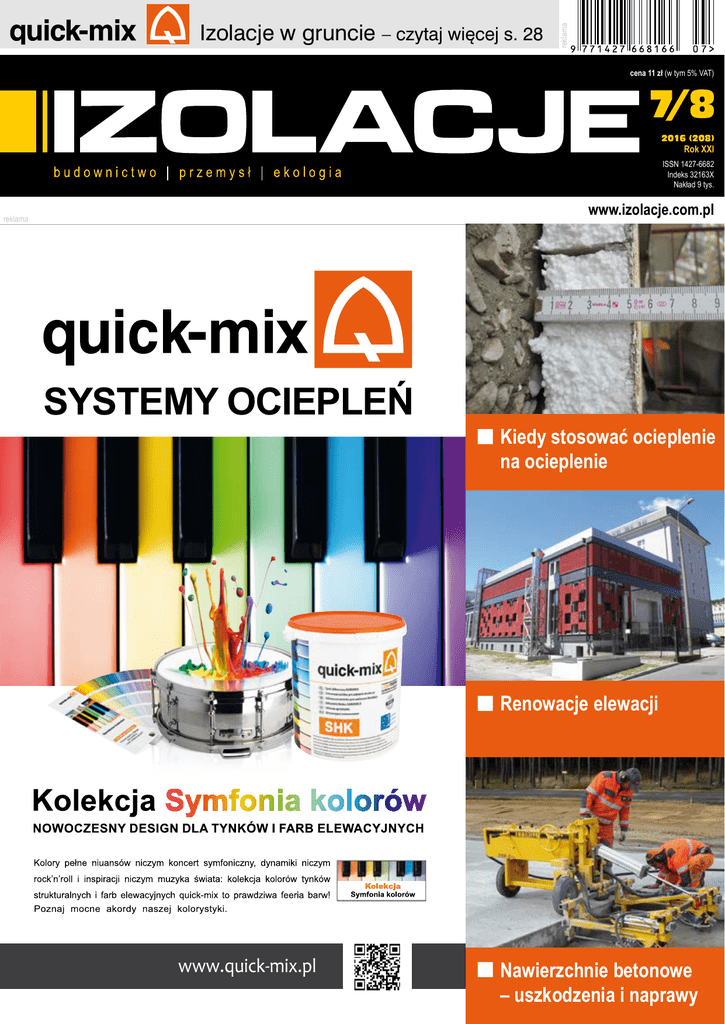 reklama Izolacje w gruncie – czytaj więcej s. 28 cena 11 zł (w tym 5% VAT) 7/8 2016 (208) Rok XXI ISSN 1427-6682 Indeks 32163X Nakład 9 tys. www.izolacje.com.pl reklama SYSTEMY OCIEPLEŃ nKiedy stosować ocieplenie na ocieplenie nRenowacje elewacji nNawierzchnie betonowe – uszkodzenia i naprawy NOWE WYMAGANIA AKUSTYCZNE DLA SAL WYKŁADOWYCH I KONFERENCYJNYCH ORAZ W ZAKRESIE OCHRONY PRZED HAŁASEM POGŁOSOWYM W BUDYNKACH WEDŁUG NORMY PN-B 02151-4:2015-06 W artykule Andrzej K. Kłosak i Mikołaj Jarosz przedstawiają nowe wymagania dotyczące akustyki. Omawiają zagadnienia pogłosu, transmisji mowy oraz chłonności akustycznej. Przedstawiają wymagania akustyczne stawiane obiektom biurowym i sportowym, salom i pracowniom szkolnym, salom audytoryjnym i wykładowym oraz innym pomieszczeniom o podobnym przeznaczeniu. Zrozumiałość mowy Doskonała s. 18 Wartość wskaźnika STI > 0,75 Dobra 0,60–0,75 Dostateczna 0,45–0,60 Słaba 0,30–0,45 Zła < 0,30 Zależność między wskaźnikiem STI a subiektywnym odbiorem mowy TABELA 1. s. 44 KIEDY NALEŻY STOSOWAĆ TECHNOLOGIĘ OCIEPLENIA NA OCIEPLENIU W artykule Paweł Gaciek omawia zalety technologii wykonywania ocieplenia na ociepleniu. Wymienia niezbędne kroki przed podjęciem takich prac oraz czynniki, na które należy zwracać szczególną uwagę. Podkreśla znaczenie łączników mechanicznych w poprawnym mocowaniu obu ociepleń. s. 36 NAWIERZCHNIE BETONOWE – USZKODZENIA I NAPRAWY s. 50 RENOWACJE ELEWACJI Z WYKORZYSTANIEM MATERIAŁÓW I ELEMENTÓW LEKKIEJ OBUDOWY Wioletta Jackiewicz-Rek, Małgorzata Konopska-Piechurska, Kamil Załęgowski, Andrzej Garbacz przedstawiają klasyfikację uszkodzeń nawierzchni betonowych, wymieniają czynniki destrukcyjne i ich genezy, mogące wynikać z błędów projektowych, wykonawczych i eksploatacyjnych, popełnianych w trakcie realizacji nawierzchni betonowej oraz w trakcie cyklu jej życia. Prezentują możliwości użycia nieniszczących metod diagnostyki stanu nawierzchni, a także wybrane sposoby naprawy uszkodzeń powierzchniowych i strukturalnych nawierzchni betonowych. fot.: archiwum W. Jackiewicz-Rek, M. Konopskiej-Piechurskiej, K. Załęgowskiego, A. Garbacza Elżbieta Urbańska-Galewska i Dariusz Kowalski omawiają podział i charakterystykę lekkich przegród budowlanych oraz podstawowe materiały i elementy lekkiej obudowy: materiały metalowe, szkło i materiały izolacyjne. fot.: D. Kowalski fot.: archiwum P. Gaćka fot.: archiwum W. Jackiewicz-Rek, M. Konopskiej-Piechurskiej, K. Załęgowskiego, A. Garbacza fot.: archiwum P. Gaćka s. 58 REMONTY I PRZEBUDOWY DACHÓW Z ZASTOSOWANIEM ELEMENTÓW LEKKIEJ OBUDOWY 1 fot.: archiwum P. Gaćka 4 2 W artykule Elżbieta Urbańska-Galewska L i Dariusz Kowalski przedstawiają przykładowe rozwiązania L remontów i przebudowy dachów. Omawiają rozwiązania zmiany materiału pokrycia zarówno bez dodawania warstwy izolacyjnej, jak i z ułożeh ki niem dodatkowej ńs szy u r warstwy ocieplenia .: P r ys na istniejącej połaci dachowej, a także sposób przebudowy dachu, polegający na ustawianiu nowej, lekkiej konstrukcji nośnej dachu, bezpośrednio na istniejącym pokryciu dachu płaskiego. nr 7/8/2016 INDEKS FIRM SPIS TREŚCI 15 Alpha Dam 26 Alpol Gips 7 Balex Metal 27BASF 45Bolix 63Celuterm 10Drutex 49 Ejot Polska 8, 58, 59, 60, 62, 63 Fakro 33 Griltex Polska 37Hydrostop 28Izohan 53Izopanel 42, 43Jordahl & Pfeifer Technika Budowlana 61 Knauf Insulation 17 Klimas Wkręt-met 72 Mapei Polska 17Mercor 8, 9 Ministerstwo Infrastruktury i Budownictwa 13, 14 Ministerstwo Rozwoju 13 Monier Braas 14, 16 Oferteo 21 OWA Polska 51 Paroc Panel System Oy Ab 14, 15 Polski Związek Inżynierów i Techników Budownictwa, Oddział w Gliwicach 2, 33 PCC Prodex 25 Przedsiębiorstwo „Carmen” 1, 28 quick-mix 29, 34, 35, 41 Remmers Polska 10, 11, 12, 13 Rockwool Polska 19 Saint Gobain Construction Products Polska/Rigips 47Schöck 3, 30 Selena 31 Soprema Polska 10, 12, 13Stowarzyszenie Wykonawców Dachów Płaskich i Fasad DAFA 56, 57 Swisspor Polska 59Triflex 16, 71 Uniwersytet Technologiczno ‑Przyrodniczy w Bydgoszczy, Wydział Budownictwa, Architektury i Inżynierii Środowiska 9 Velux Polska 32 Visbud-Projekt 9, 10 Związek Polskie Okna i Drzwi 8 8 Zarzuty firmy Fakro wobec działań Komisji Europejskiej 9 Oświadczenie w sprawie naruszenia dóbr osobistych Grupy VELUX przez firmę Fakro 10 Rockwool zainwestował w nową linię produkcyjną 12Jubileusz 10-lecia Stowarzyszenia DAFA 13 20 lat fabryki Braas w Opolu 14XX Jubileuszowa Konferencja Naukowo-Techniczna KONTRA 2016 16I Ogólnopolska Konferencja Studentów i Doktorantów „Budownictwo zrównoważone” 17Mercor: wzrost sprzedaży mimo spadków na rynku rosyjskim 18 Ściany, stropy 18Andrzej K. Kłosak, Mikołaj Jarosz Nowe wymagania akustyczne dla sal wykładowych i konferencyjnych oraz w zakresie ochrony przed hałasem pogłosowym w budynkach według normy PN-B 02151-4:2015-06 25 ZDJĘCIA NA OKŁADCE Izo-aktualności Przegląd 25 Izolacje w gruncie P. Gaciek D. Kowalski TPA 34 Nawierzchnie betonowe – uszkodzenia i naprawy 42Uszczelniaj i oszczędzaj – nowoczesny system uszczelnień PENTAFLEX® PREZENTACJA 44Paweł Gaciek Kiedy należy stosować technologię ocieplenia na ociepleniu 49Wojciech Hasiak EJOT DART-SET – Skuteczny montaż ocieplenia na ocieplenie PREZENTACJA 50Elżbieta Urbańska-Galewska, Dariusz Kowalski Renowacje elewacji z wykorzystaniem materiałów i elementów lekkiej obudowy 56Styropian zespolony trzeciej generacji to już standard PREZENTACJA 58 Dachy 58Elżbieta Urbańska-Galewska, Dariusz Kowalski Remonty i przebudowy dachów z zastosowaniem elementów lekkiej obudowy Materiały i technologie 64 Katalog firm 34Jarosław Gasewicz Izolacje powłokowe – trwałe i skuteczne, dobierane do rzeczywistych warunków PREZENTACJA nr 7/8/2016 36 Wioletta Jackiewicz-Rek, Małgorzata Konopska-Piechurska, Kamil Załęgowski, Andrzej Garbacz 69 70 W poprzednich numerach Tu zn