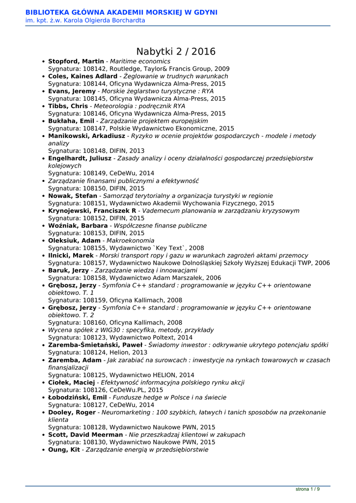 BIBLIOTEKA GŁÓWNA AKADEMII MORSKIEJ W GDYNI im. kpt. ż.w. Karola Olgierda Borchardta Nabytki 2 / 2016 Stopford, Martin - Maritime economics Sygnatura: 108142, Routledge, Taylor& Francis Group, 2009 Coles, Kaines Adlard - Żeglowanie w trudnych warunkach Sygnatura: 108144, Oficyna Wydawnicza Alma-Press, 2015 Evans, Jeremy - Morskie żeglarstwo turystyczne : RYA Sygnatura: 108145, Oficyna Wydawnicza Alma-Press, 2015 Tibbs, Chris - Meteorologia : podręcznik RYA Sygnatura: 108146, Oficyna Wydawnicza Alma-Press, 2015 Bukłaha, Emil - Zarządzanie projektem europejskim Sygnatura: 108147, Polskie Wydawnictwo Ekonomiczne, 2015 Manikowski, Arkadiusz - Ryzyko w ocenie projektów gospodarczych - modele i metody analizy Sygnatura: 108148, DIFIN, 2013 Engelhardt, Juliusz - Zasady analizy i oceny działalności gospodarczej przedsiębiorstw kolejowych Sygnatura: 108149, CeDeWu, 2014 Zarządzanie finansami publicznymi a efektywność Sygnatura: 108150, DIFIN, 2015 Nowak, Stefan - Samorząd terytorialny a organizacja turystyki w regionie Sygnatura: 108151, Wydawnictwo Akademii Wychowania Fizycznego, 2015 Krynojewski, Franciszek R - Vademecum planowania w zarządzaniu kryzysowym Sygnatura: 108152, DIFIN, 2015 Woźniak, Barbara - Współczesne finanse publiczne Sygnatura: 108153, DIFIN, 2015 Oleksiuk, Adam - Makroekonomia Sygnatura: 108155, Wydawnictwo `Key Text`, 2008 Ilnicki, Marek - Morski transport ropy i gazu w warunkach zagrożeń aktami przemocy Sygnatura: 108157, Wydawnictwo Naukowe Dolnośląskiej Szkoły Wyższej Edukacji TWP, 2006 Baruk, Jerzy - Zarządzanie wiedzą i innowacjami Sygnatura: 108158, Wydawnictwo Adam Marszałek, 2006 Grębosz, Jerzy - Symfonia C++ standard : programowanie w języku C++ orientowane obiektowo. T. 1 Sygnatura: 108159, Oficyna Kallimach, 2008 Grębosz, Jerzy - Symfonia C++ standard : programowanie w języku C++ orientowane obiektowo. T. 2 Sygnatura: 108160, Oficyna Kallimach, 2008 Wycena spółek z WIG30 : specyfika, metody, przykłady Sygnatura: 108123, Wydawnictwo Poltext, 2014 Zaremba-Śmietański, Paweł - Świadomy inwestor : odkrywanie ukrytego potencjału spółki Sygnatura: 108124, Helion, 2013 Zaremba, Adam - Jak zarabiać na surowcach : inwestycje na rynkach towarowych w czasach finansjalizacji Sygnatura: 108125, Wydawnictwo HELION, 2014 Ciołek, Maciej - Efektywność informacyjna polskiego rynku akcji Sygnatura: 108126, CeDeWu.PL, 2015 Łobodziński, Emil - Fundusze hedge w Polsce i na świecie Sygnatura: 108127, CeDeWu, 2014 Dooley, Roger - Neuromarketing : 100 szybkich, łatwych i tanich sposobów na przekonanie klienta Sygnatura: 108128, Wydawnictwo Naukowe PWN, 2015 Scott, David Meerman - Nie przeszkadzaj klientowi w zakupach Sygnatura: 108130, Wydawnictwo Naukowe PWN, 2015 Oung, Kit - Zarządzanie energią w przedsiębiorstwie strona 1 / 9 BIBLIOTEKA GŁÓWNA AKADEMII MORSKIEJ W GDYNI im. kpt. ż.w. Karola Olgierda Borchardta Sygnatura: 108131, Wydawnictwo Naukowe PWN, 2015 Żwirbla, Adam - Nowe podejście do analizy progu rentowności : produkcja wieloasortymentowa Sygnatura: 108132, Wydawnictwo Naukowe PWN, 2015 Malinowski, Bartosz Filip - Crowdfunding : zrealizuj swój pomysł ze wsparciem cyfrowego tłumu Sygnatura: 108133, Wydawnictwo HELION, 2015 Innowacje i przedsiębiorczość w procesie podnoszenia konkurencyjności przedsiębiorstw Sygnatura: 108135, Wyższa Szkoła Biznesu, 2015 Kawasaki, Guy - Jak Cię widzą, tak Cię piszą : sztuka autopromocji w mediach społecznościowych Sygnatura: 108136, Wydawnictwo HELION, 2016 Ziemblicki, Bartosz - Prawo dla żeglarzy Sygnatura: 108137, Oficyna Wydawnicza Alma-Press, 2015 Biernat, Kamil - Prawo w e-biznesie Sygnatura: 108138, Helion, 2015 Rodriguez, Jason - Nowoczesny e-mail marketing : uniwersalny, responsywny i skuteczny mailing w HTML-u Sygnatura: 108139, Wydawnictwo HELION, 2015 Michalak, Piotr R - Marketing wirusowy w internecie Sygnatura: 108140, Wydawnictwo HELION, 2009 Trzeciak, Sergiusz - Wizerunek publiczny w internecie : kim jesteś w sieci? Sygnatura: 108141, Wydawnictwo HELION, 2015 Gientkowski, Zdzisław - Elementy elektrotechniki i elektroniki dla wydziałów chemicznych Sygnatura: 108089, Wydawnictwa Uczelniane Uniwersytetu Technologiczno-Przyrodniczego, 2015 Michalska, Anna - Style kierowania menedżerów w sytuacjach trudnych Sygnatura: 108090, Wydawnictwa Uczelniane Uniwersytetu Technologiczno-Przyrodniczy, 2015 Skowroński, Marek - Obliczenia hydrauliczne i cieplne układów pompowych Sygnatura: 108091, Oficyna Wydawnicza Politechniki Wrocławskiej, 2015 Przyrodnicze i zdrowotne aspekty turystyki i rekreacji Sygnatura: 108092, Wydawnictwo im. Stanisława Podobińskiego Akademii im. Jana Długosza, 2015 Fazlagić, Amir Jan - Kreatywni w biznesie Sygnatura: 108093, Wydawnictwo Poltext, 2015 Dobaczewska, Anna - Leksykon prawa finansowego : 100 podstawowych pojęć Sygnatura: 108095, Wydawnictwo C. H. Beck, 2015 Pietrzyca, Michał - Nagi Trading - technika inwestowania bez jakichkolwiek wskaźników analizy technicznej Sygnatura: 108096, Wiedza i Praktyka, 2014 Cox, Joyce - Microsoft Access 2013 : krok po kroku Sygnatura: 108097, APN Promise, 2013 Moore, John T. - Chemia dla bystrzaków Sygnatura: 108098, Wydawnictwo HELION, 2015 Cialdini, Robert B. - Mała w!elka zmiana : jak skuteczniej wywierać wpływ Sygnatura: 108099, Gdańskie Wydawnictwo Psychologiczne, 2016 Nestorowicz, Bartosz - Zdobywanie pracy : odkryj klucz do sukcesu zawodowego Sygnatura: 108100, Wydawnictwo HELION, 2015 Bisewski, Tadeusz - 7 kroków do własnej firmy Sygnatura: 108101, Edgard, 2015 Jemielniak, Dariusz - Klasyka teorii zarządzania : ćwiczenia, przykłady, testy Sygnatura: 108102, Wydawnictwo Poltext, 2015 Rembisz, Włodzimierz - Mikroekonomia współczesna Sygnatura: 108103, VIZJA Press & IT, 2015 strona 2 / 9 BIBLIOTEKA GŁÓWNA AKADEMII MORSKIEJ W GDYNI im. kpt. ż.w. Karola Olgierda Borchardta Polskie prawo podatkowe : podręcznik akademicki Sygnatura: 108104, DIFIN, 2015 Grodkiewicz, Piotr
