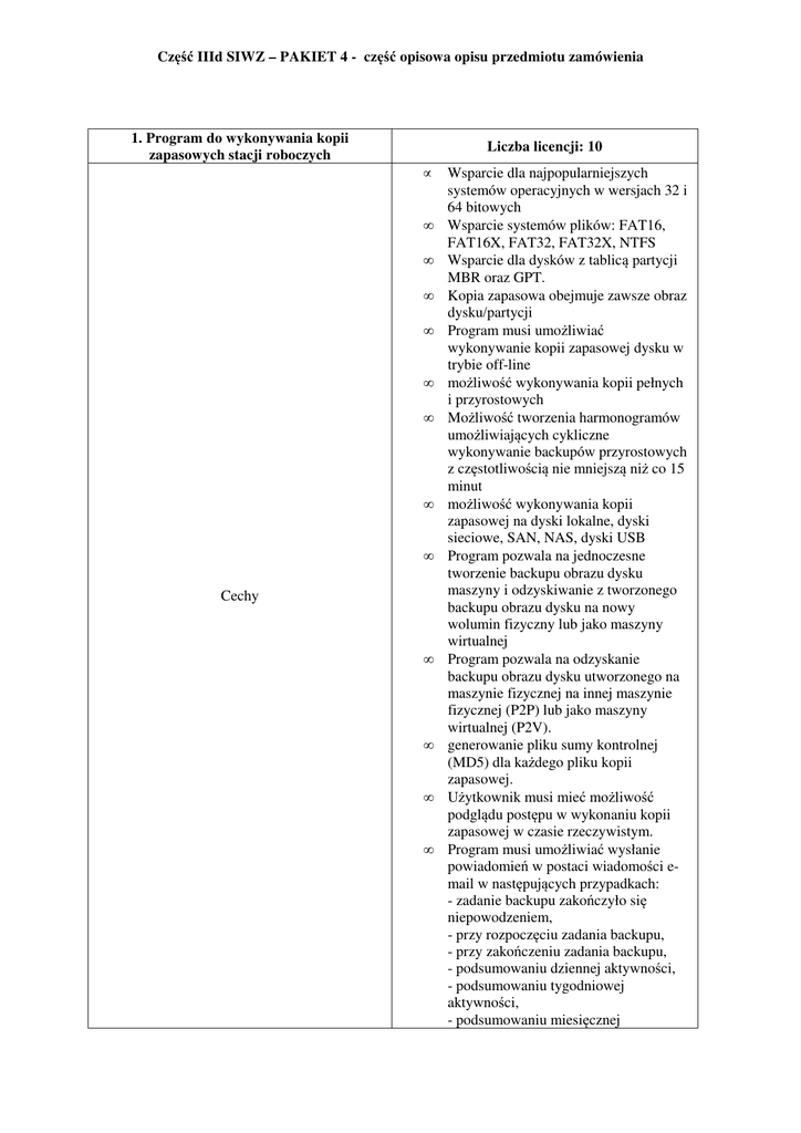 Część IIId SIWZ – PAKIET 4 - część opisowa opisu przedmiotu zamówienia 1. Program do wykonywania kopii zapasowych stacji roboczych Liczba licencji: 10 • • • • • • • • • Cechy • • • • Wsparcie dla najpopularniejszych systemów operacyjnych w wersjach 32 i 64 bitowych Wsparcie systemów plików: FAT16, FAT16X, FAT32, FAT32X, NTFS Wsparcie dla dysków z tablicą partycji MBR oraz GPT. Kopia zapasowa obejmuje zawsze obraz dysku/partycji Program musi umożliwiać wykonywanie kopii zapasowej dysku w trybie off-line możliwość wykonywania kopii pełnych i przyrostowych Możliwość tworzenia harmonogramów umożliwiających cykliczne wykonywanie backupów przyrostowych z częstotliwością nie mniejszą niż co 15 minut możliwość wykonywania kopii zapasowej na dyski lokalne, dyski sieciowe, SAN, NAS, dyski USB Program pozwala na jednoczesne tworzenie backupu obrazu dysku maszyny i odzyskiwanie z tworzonego backupu obrazu dysku na nowy wolumin fizyczny lub jako maszyny wirtualnej Program pozwala na odzyskanie backupu obrazu dysku utworzonego na maszynie fizycznej na innej maszynie fizycznej (P2P) lub jako maszyny wirtualnej (P2V). generowanie pliku sumy kontrolnej (MD5) dla każdego pliku kopii zapasowej. Użytkownik musi mieć możliwość podglądu postępu w wykonaniu kopii zapasowej w czasie rzeczywistym. Program musi umożliwiać wysłanie powiadomień w postaci wiadomości email w następujących przypadkach: - zadanie backupu zakończyło się niepowodzeniem, - przy rozpoczęciu zadania backupu, - przy zakończeniu zadania backupu, - podsumowaniu dziennej aktywności, - podsumowaniu tygodniowej aktywności, - podsumowaniu miesięcznej Część IIId SIWZ – PAKIET 4 - część opisowa opisu przedmiotu zamówienia • • • Dane techniczne • • • • 2. Program do wykonywania kopii zapasowych serwerów wirtualnych aktywności, Możliwość przywrócenia z backupu obrazu dysku jak powyżej na zupełnie innym sprzęcie niż wykonywany był oryginalnie backup. możliwość wyszukiwania i odzyskiwania pojedynczych plików lub folderów w kopiach zapasowych obrazu dysku Program umożliwia uruchomienie w ciągu kilku minut obrazu dysku z kopii zapasowej jako maszyny wirtualnej w VirtualBox, VMware vSphere oraz Hyper-V. Ważność licencji: dożywotnia Liczba użytkowników: 1 Wersja językowa: polska Współpracujący z preinstalowanym systemem operacyjnym na zakupionych w ramach zamówienia komputerach Liczba licencji: 1 • • • • • • • Cechy • • • Wsparcie dla systemów operacyjnych 64 bitowych Wsparcie systemów plików: etx2, ext3, ext4, XFS. Wsparcie dla dysków z tablicą partycji MBR oraz GPT. Kopia zapasowa obejmuje zawsze obraz dysku/partycji Program musi umożliwiać wykonywanie kopii zapasowej dysku w trybie off-line możliwość wykonywania kopii pełnych i przyrostowych Możliwość tworzenia harmonogramów umożliwiających cykliczne wykonywanie backupów przyrostowych z częstotliwością nie mniejszą niż co 15 minut możliwość wykonywania kopii zapasowej na dyski lokalne, dyski sieciowe, SAN, NAS, dyski USB Program pozwala na jednoczesne tworzenie backupu obrazu dysku maszyny i odzyskiwanie z tworzonego backupu obrazu dysku na nowy wolumin fizyczny lub jako maszyny wirtualnej Program pozwala na odzyskanie backupu obrazu dysku utworzonego na maszynie fizycznej na innej maszynie Część IIId SIWZ – PAKIET 4 - część opisowa opisu przedmiotu zamówienia • • • • • • Dane techniczne • • • 3. Program do wykonywania kopii zapasowych serwerów wirtualnych Liczba licencji: 3 • • • Cechy fizycznej (P2P) lub jako maszyny wirtualnej (P2V). generowanie pliku sumy kontrolnej (MD5) dla każdego pliku kopii zapasowej. Użytkownik musi mieć możliwość podglądu postępu w wykonaniu kopii zapasowej w czasie rzeczywistym. Program musi umożliwiać wysłanie powiadomień w postaci wiadomości email w następujących przypadkach: - zadanie backupu zakończyło się niepowodzeniem, - przy rozpoczęciu zadania backupu, - przy zakończeniu zadania backupu, - podsumowaniu dziennej aktywności, - podsumowaniu tygodniowej aktywności, - podsumowaniu miesięcznej aktywności, Możliwość przywrócenia z backupu obrazu dysku jak powyżej na zupełnie innym sprzęcie niż wykonywany był oryginalnie backup. możliwość wyszukiwania i odzyskiwania pojedynczych plików lub folderów w kopiach zapasowych obrazu dysku Program umożliwia uruchomienie w ciągu kilku minut obrazu dysku z kopii zapasowej jako maszyny wirtualnej w VirtualBox, VMware vSphere oraz Hyper-V. Ważność licencji: dożywotnia Liczba użytkowników: 1 Wersja językowa: polska • • • Pełne wsparcie dla najpopularniejszych środowisk wirtualnych Wsparcie dla najpopularniejszych serwerowych systemów operacyjnych w wersjach 32 i 64 bitowych Wsparcie systemów plików: FAT16, FAT16X, FAT32, FAT32X, NTFS Wsparcie dla dysków z tablicą partycji MBR oraz GPT. Kopia zapasowa obejmuje zawsze obraz dysku/partycji Program musi umożliwiać wykonywanie kopii zapasowej dysku w trybie off-line Część IIId SIWZ – PAKIET 4 - część opisowa opisu przedmiotu zamówienia • • • • • • • • • • • możliwość wykonywania kopii pełnych i przyrostowych Możliwość tworzenia harmonogramów umożliwiających cykliczne wykonywanie backupów przyrostowych z częstotliwością nie mniejszą niż co 15 minut możliwość wykonywania kopii zapasowej na dyski lokalne, dyski sieciowe, SAN, NAS, dyski USB Program pozwala na jednoczesne tworzenie backupu obrazu dysku maszyny i odzyskiwanie z tworzonego backupu obrazu dysku na nowy wolumin fizyczny lub jako maszyny wirtualnej Program pozwala na odzyskanie backupu obrazu dysku utworzonego na maszynie fizycznej na innej maszynie fizycznej (P2P) lub jako maszyny wirtualnej (P2V). generowanie pliku sumy kontrolnej (MD5) dla każdego pliku kopii zapasowej. Użytkownik musi mieć możliwość pod