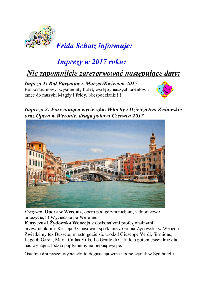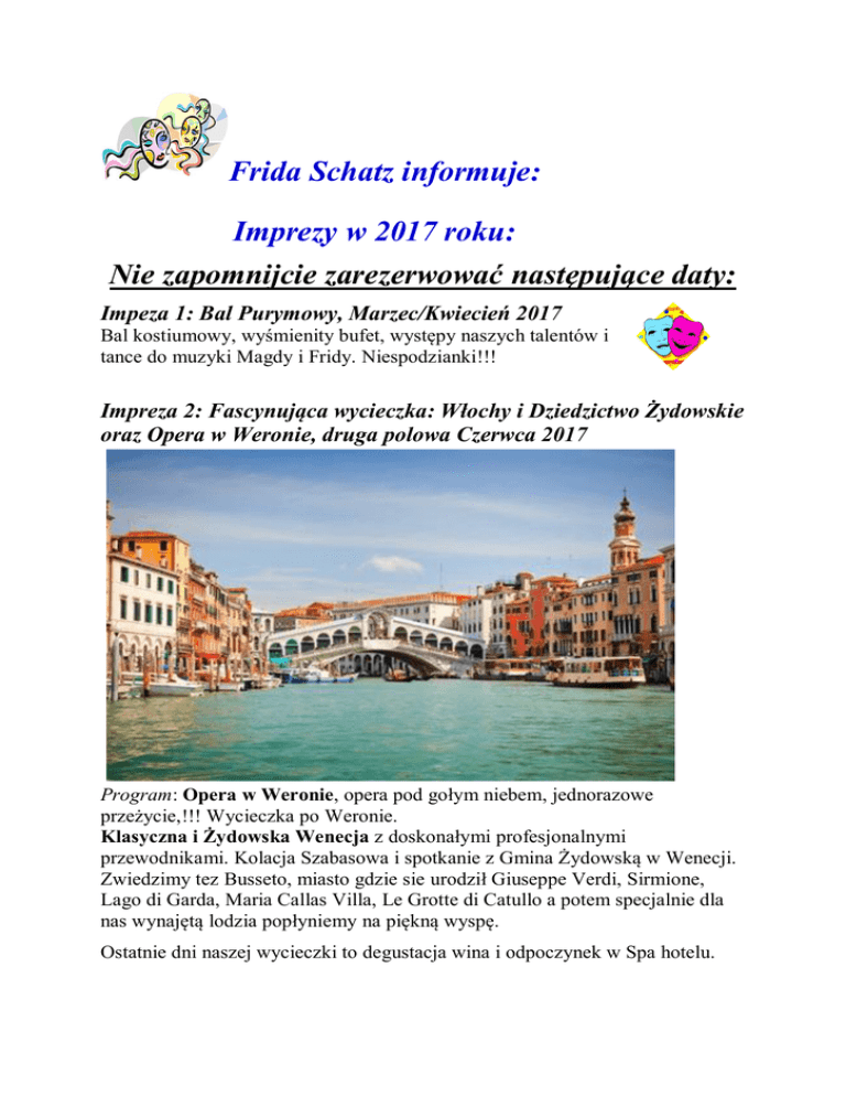 Frida Schatz informuje: Imprezy w 2017 roku: Nie zapomnijcie zarezerwować następujące daty: Impeza 1: Bal Purymowy, Marzec/Kwiecień 2017 Bal kostiumowy, wyśmienity bufet, występy naszych talentów i tance do muzyki Magdy i Fridy. Niespodzianki!!! Impreza 2: Fascynująca wycieczka: Włochy i Dziedzictwo Żydowskie oraz Opera w Weronie, druga polowa Czerwca 2017 Program: Opera w Weronie, opera pod gołym niebem, jednorazowe przeżycie,!!! Wycieczka po Weronie. Klasyczna i Żydowska Wenecja z doskonałymi profesjonalnymi przewodnikami. Kolacja Szabasowa i spotkanie z Gmina Żydowską w Wenecji. Zwiedzimy tez Busseto, miasto gdzie sie urodził Giuseppe Verdi, Sirmione, Lago di Garda, Maria Callas Villa, Le Grotte di Catullo a potem specjalnie dla nas wynajętą lodzia popłyniemy na piękną wyspę. Ostatnie dni naszej wycieczki to degustacja wina i odpoczynek w Spa hotelu. Impreza 3: Jednorazowa wycieczka: Peru, kraj Inkow, Boliwia oraz Dziedzictwo Zydowskie, Listopad 2017 Program: Zwiedzimy Klasyczna i Żydowska Limę, Peru. Następnie Paracas, rezerwat przyrody, który znajduje sie na UNESCO World Heritage List z pięknymi wybrzeżami i skalnymi formacjami. Wycieczka lodzia na piękne wyspy Ballestas, które sa zwane tez ”male Galapagos”. Po drodze zobaczymy zycie morskich ptaków, lwow morskich, pelikanów, pingwinów, fok i delfinów. Zwiedzimy sławną oazę Huacachina. W południowym Peru zwiedzimy piękne miasteczko Arequipa, położonym na wysokości 2 335. Miasto jest otoczone szczytami wulkanów. Dalej do klasztoru Santa Catalina i wielkiej katedry. Zwiedzimy tez Chivay w Canyon Colca. W Andach zobaczymy alpaki, lamy i rożne ptaki. Pojedziemy do Chivay i będziemy mieli możliwość kąpieli w naturalnych ciepłych źródłach w Calera. Dalej do Puno, położone na wysokości 3830 metrów nad poziomem morza, przy jeziorze Titicaca. Wycieczka do pięknej Taquile, wyspa na jeziorze Titicaca. Mieszkańcy wyspy sa znani z ręcznie robionych tkanin i ubrań. Po drodze do Taquile zwiedzimy Uros sztucznie zrobione z czciny pływające wyspy, tam usłyszymy o życiu Uros-Indian . Dalej do starej stolicy Inkow Cusco, centrum religijne i kulturalne krolewstwa Inków. Zwiedzimy tez Świątynie Słońca, która była centrem religijnym w okresie ich krolewstwa. Zobaczymy po drodze imponującą twierdze Sacsay i ruiny Qénqo, Puka Pukara och Tambomachay. Jadąc wzdłuż rzeki Vilcanota, zwiedzimy ciekawy rynek Pisac. Dalej do miasta Inków, Ollantaytambo z forteca która obejmuje miasto razem z rynkami i świątyniami. Ulice i wodne kanały zachowały sie jeszcze z czasów Inków. Będziemy podziwiali wspaniałą architekturę Inków. Pojedziemy pociągiem do Świętej Doliny Inków - Machu Picchu. Najpierw do Aguas Calientes, wioski u podnóża Machu Picchu. Następnie, autobusem do bram fascynującego Machu Pichu, ktore lezy na szczycie góry. Machu Picchu jest jednym z bardziej imponujacych zabytków w Południowej Ameryce i jest zaliczane do jednych z siedmiu cudów świata. Miasto znajduje się na UNESCO World Heritage List. Zwiedzimy Klasyczny i Żydowski La Paz, Bolivia. Impreza 4:Zabawa Channukowa, Grudzien 2017. Występy, tance, dobre jedzenie i wiele niespodzianek!!! Podczas roku postaram się zorganizować ciekawe wykłady z gośćmi i wyjątkowymi profesorami z Israela na tematy państwa Israel i ogólnie na tematy żydowskie. Jeżeli chcesz otrzymywać więcej informacji lub zameldować się na powyższe imprezy, napisz do: Fridy Schatz: [email protected], tel: 070-837 33 55 Ilość miejsc na każdą imprezę jest ograniczona.