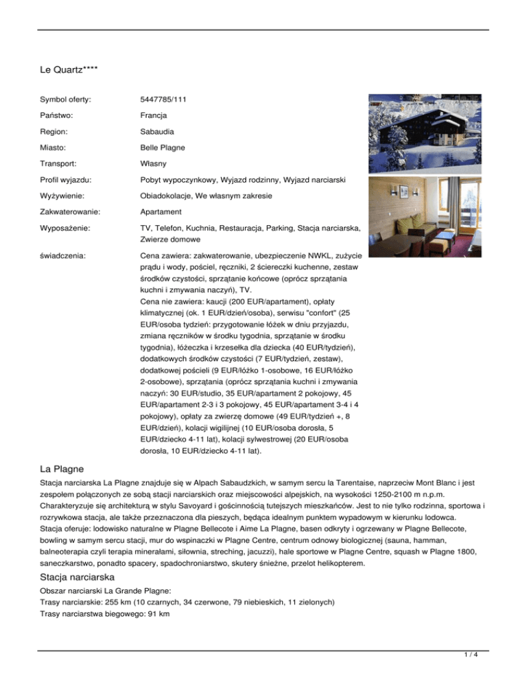 Le Quartz**** Symbol oferty: 5447785/111 Państwo: Francja Region: Sabaudia Miasto: Belle Plagne Transport: Własny Profil wyjazdu: Pobyt wypoczynkowy, Wyjazd rodzinny, Wyjazd narciarski Wyżywienie: Obiadokolacje, We własnym zakresie Zakwaterowanie: Apartament Wyposażenie: TV, Telefon, Kuchnia, Restauracja, Parking, Stacja narciarska, świadczenia: Cena zawiera: zakwaterowanie, ubezpieczenie NWKL, zużycie Zwierze domowe prądu i wody, pościel, ręczniki, 2 ściereczki kuchenne, zestaw środków czystości, sprzątanie końcowe (oprócz sprzątania kuchni i zmywania naczyń), TV. Cena nie zawiera: kaucji (200 EUR/apartament), opłaty klimatycznej (ok. 1 EUR/dzień/osoba), serwisu "confort" (25 EUR/osoba tydzień: przygotowanie łóżek w dniu przyjazdu, zmiana ręczników w środku tygodnia, sprzątanie w środku tygodnia), łóżeczka i krzesełka dla dziecka (40 EUR/tydzień), dodatkowych środków czystości (7 EUR/tydzień, zestaw), dodatkowej pościeli (9 EUR/łóżko 1-osobowe, 16 EUR/łóżko 2-osobowe), sprzątania (oprócz sprzątania kuchni i zmywania naczyń: 30 EUR/studio, 35 EUR/apartament 2 pokojowy, 45 EUR/apartament 2-3 i 3 pokojowy, 45 EUR/apartament 3-4 i 4 pokojowy), opłaty za zwierzę domowe (49 EUR/tydzień +, 8 EUR/dzień), kolacji wigilijnej (10 EUR/osoba dorosła, 5 EUR/dziecko 4-11 lat), kolacji sylwestrowej (20 EUR/osoba dorosła, 10 EUR/dziecko 4-11 lat). La Plagne Stacja narciarska La Plagne znajduje się w Alpach Sabaudzkich, w samym sercu la Tarentaise, naprzeciw Mont Blanc i jest zespołem połączonych ze sobą stacji narciarskich oraz miejscowości alpejskich, na wysokości 1250-2100 m n.p.m. Charakteryzuje się architekturą w stylu Savoyard i gościnnością tutejszych mieszkańców. Jest to nie tylko rodzinna, sportowa i rozrywkowa stacja, ale także przeznaczona dla pieszych, będąca idealnym punktem wypadowym w kierunku lodowca. Stacja oferuje: lodowisko naturalne w Plagne Bellecote i Aime La Plagne, basen odkryty i ogrzewany w Plagne Bellecote, bowling w samym sercu stacji, mur do wspinaczki w Plagne Centre, centrum odnowy biologicznej (sauna, hamman, balneoterapia czyli terapia minerałami, siłownia, streching, jacuzzi), hale sportowe w Plagne Centre, squash w Plagne 1800, saneczkarstwo, ponadto spacery, spadochroniarstwo, skutery śnieżne, przelot helikopterem. Stacja narciarska Obszar narciarski La Grande Plagne: Trasy narciarskie: 255 km (10 czarnych, 34 czerwone, 79 niebieskich, 11 zielonych) Trasy narciarstwa biegowego: 91 km 1/4 Szlaki dla pieszych: 30 km Obszar narciarski Paradiski: Trasy narciarskie: 425 km (35 czarnych, 66 czerwone, 129 niebieskich, 12 zielonych) Trasy narciarstwa biegowego: 158 km Szlaki dla pieszych: 30 km Obszar snowboard Zakwaterowanie Apartament 2 pokojowy 4-osobowy (niektóre są typu mezzanine): 28-32 m2, salon z 2-osobową, rozkładaną kanapą, sypialnia 2 łóżkami 1-osobowymi, łazienka, oddzielne WC lub prysznic z WC, kuchnia z wyposażeniem (piec ceramiczny, lodówka, mikrofalówka, zmywarka, czajnik, telefon (dodatkowo płatny), TV, odkurzacz, balkon lub taras na parterze z 1 leżakiem. Apartament 3 pokojowy 5-6-osobowy: 43-51 m2, salon z 2 łóżkami 1-osobowymi, sypialnia z 2 łóżkami 1-osobowymi, sypialnia z 2-osobowym łóżkiem, łazienka lub prysznic z WC, 1 dodatkowy prysznic lub łazienka, 1 dodatkowe WC, kuchnia z wyposażeniem (piec ceramiczny, lodówka, mikrofalówka, zmywarka, czajnik, telefon (dodatkowo płatny), TV, odkurzacz, balkon lub taras na parterze z 1 leżakiem. Apartament 3-4 pokojowy 8-osobowy: 54-59 m2, salon z 2 łóżkami 1-osobowymi, cabine z łóżkiem piętrowym, sypialnia z 2 łóżkami 1-osobowymi, sypialnia z 2-osobowym łóżkiem, łazienka, oddzielne WC, 1 dodatkowy prysznic z WC, kuchnia z wyposażeniem (piec ceramiczny, lodówka, mikrofalówka, zmywarka, czajnik, telefon (dodatkowo płatny), TV, odkurzacz, balkon lub taras na parterze z 1 leżakiem. Studio 2-osobowe: 21 m2, salon z 2-osobową, rozkładaną kanapą, łazienka lub prysznic z WC, kuchnia z wyposażeniem (piec ceramiczny, lodówka, mikrofalówka, zmywarka, czajnik, telefon (dodatkowo płatny), TV, odkurzacz, balkon lub taras na parterze z 1 leżakiem. Studio 2-3-osobowe: 24-28 m2, salon z 2-osobową, rozkładaną kanapą i 1-osobowym łóżkiem, łazienka lub prysznic z WC, kuchnia z wyposażeniem (piec ceramiczny, lodówka, mikrofalówka, zmywarka, czajnik, telefon (dodatkowo płatny), TV, odkurzacz, balkon lub taras na parterze z 1 leżakiem. Studio 3-4-osobowe: 29-32 m2, salon z 2-osobową, rozkładaną kanapą i 1-osobowym łóżkiem lub 2 łóżkami 1-osobowymi i cabine z piętrowym łóżkiem, łazienka lub prysznic z WC, kuchnia z wyposażeniem (piec ceramiczny, lodówka, mikrofalówka, zmywarka, czajnik, telefon (dodatkowo płatny), TV, odkurzacz, balkon lub taras na parterze z 1 leżakiem. Położenie Rezydencja Le Quartz****, gruntownie odnowiona, składa się z drewnianego domku typu chalet. Korzysta w pełni z pasjonującego otoczenia. Apartamenty posiadają ekspozycję południowo-wschodnią, południowo-zachodnią lub północno-wschodnią. Zakwaterowanie: sobota po godz. 17:00. Wykwaterowanie: sobota do godz. 10:00. Restauracja Rezerwacji należy dokonać przed wyjazdem. Restauracja oferuje obiadokolacje, 3 dania (entree + danie główne + deser). Club dla dzieci Do dyspozycji gości jest ogród zabaw w ESF dla dzieci od 18 miesiąca do 3 lat, czynny od niedzieli do piątku oraz ogród zabaw dla dzieci 3-6 lat, z możliwością nauki jazdy na nartach. Do dyspozycji jest także Mini Club dla dzieci 3-4 lat i 5-6 lat. Rezerwacji należy dokonać przed wyjazdem. Oferta specjalna 8 = 7 Dla terminu 19/12/09-26/12/09 istnieje możliwość przyjazdu 18/12/09 oraz dla terminu 10/04/10-17/04/10 istnieje możliwość wyjazdu 18/04/10 bez ponoszenia dodatkowych kosztów. Promocja W promocji, rezerwując otrzymasz: - atlas narciarski Europy - mapę tras narciarskich i wyciągów 2/4 - zniżkę na