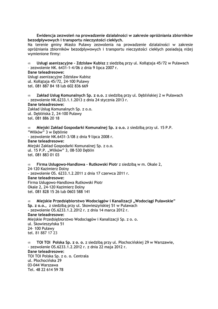 Ewidencja zezwoleń na prowadzenie działalności w zakresie opróŜniania zbiorników bezodpływowych i transportu nieczystości ciekłych. Na terenie gminy Miasto Puławy zezwolenia na prowadzenie działalności w zakresie opróŜniania zbiorników bezodpływowych i transportu nieczystości ciekłych posiadają niŜej wymienione firmy: • Usługi asenizacyjne – Zdzisław Kubisz z siedzibą przy ul. Kołłątaja 45/72 w Puławach – zezwolenie NK. 6431-1-4/06 z dnia 9 lipca 2007 r. Dane teleadresowe: Usługi asenizacyjne Zdzisław Kubisz ul. Kołłątaja 45/72, 24-100 Puławy tel. 081 887 84 18 lub 602 836 669 • Zakład Usług Komunalnych Sp. z o.o. z siedzibą przy ul. Dęblińskiej 2 w Puławach – zezwolenie NK.6233.1.1.2013 z dnia 24 stycznia 2013 r. Dane teleadresowe: Zakład Usług Komunalnych Sp. z o.o. ul. Dęblińska 2, 24-100 Puławy tel. 081 886 20 18 • Miejski Zakład Gospodarki Komunalnej Sp. z o.o. z siedzibą przy ul. 15 P.P. ”Wilków” 3 w Dęblinie - zezwolenie NK.6431-3/08 z dnia 9 lipca 2008 r. Dane teleadresowe: Miejski Zakład Gospodarki Komunalnej Sp. z o.o. ul. 15 P.P. „Wilków” 3, 08-530 Dęblin tel. 081 883 01 03 • Firma Usługowo-Handlowa – Rutkowski Piotr z siedzibą w m. Okale 2, 24-120 Kazimierz Dolny - zezwolenie OS. 6233.1.2.2011 z dnia 17 czerwca 2011 r. Dane teleadresowe: Firma Usługowo-Handlowa Rutkowski Piotr Okale 2, 24-120 Kazimierz Dolny tel. 081 828 15 26 lub 0603 588 141 • Miejskie Przedsiębiorstwo Wodociągów i Kanalizacji „Wodociągi Puławskie” Sp. z o.o., z siedzibą przy ul. Skowieszyńskiej 51 w Puławach - zezwolenie OS.6233.1.2.2012 r. z dnia 14 marca 2012 r. Dane teleadresowe: Miejskie Przedsiębiorstwo Wodociągów i Kanalizacji Sp. z o. o. ul. Skowieszyńska 51 24- 100 Puławy tel. 81 887 17 23 • TOI TOI Polska Sp. z o. o. z siedzibą przy ul. Płochocińskiej 29 w Warszawie, - zezwolenie OS.6233.1.2.2012 r. z dnia 22 maja 2012 r. Dane teleadresowe: TOI TOI Polska Sp. z o. o. Centrala ul. Płochocińska 29 03-044 Warszawa Tel. 48 22 614 59 78 • WC Serwis Sp. Komandytowa z siedzibą przy ul. Szybowej 2 w Zabrzu - zezwolenie nr OS.6233.1.3.2012 r. z dnia 22 czerwca 2012 r. Dane teleadresowe: WC Serwis ul. Pod Borem 10 41-808 Zabrze Tel. 32 278 45 31 • Przedsiębiorstwo WielobranŜowe „EXOL” z siedzibą przy ul. Strojnowskiego 25 w Lublinie - zezwolenie nr NK. 6233.3.2012 z dnia 23.11.2012 r. Dane teleadresowe: Przedsiębiorstwo WielobranŜowe „EXOL” Jacek Budzyński Ul. Strojnowskiego 25 20-386 Lublin Tel. 81 441 14 11