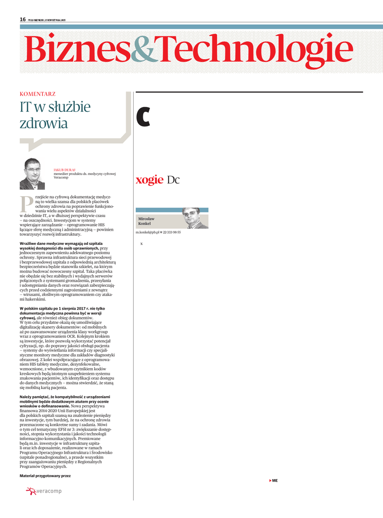 16 Biznes&Technologie KOMENTARZ IT w służbie zdrowia JAKUB DURAJ menedżer produktu ds. medycyny cyfrowej Veracomp P rzejście na cyfrową dokumentację medyczną to wielka szansa dla polskich placówek ochrony zdrowia na poprawienie funkcjonowania wielu aspektów działalności w dziedzinie IT, a w dłuższej perspektywie czasu — na oszczędności. Inwestycjom w systemy wspierające zarządzanie — oprogramowanie HIS łączące sferę medyczną i administracyjną — powinien towarzyszyć rozwój infrastruktury. Wrażliwe dane medyczne wymagają od szpitala wysokiej dostępności dla osób uprawnionych, przy jednoczesnym zapewnieniu adekwatnego poziomu ochrony. Sprawna infrastruktura sieci przewodowej i bezprzewodowej szpitala z odpowiednią architekturą bezpieczeństwa będzie stanowiła szkielet, na którym można budować nowoczesny szpital. Taka placówka nie obędzie się bez stabilnych i wydajnych serwerów połączonych z systemami gromadzenia, przesyłania i udostępniania danych oraz rozwiązań zabezpieczających przed codziennymi zagrożeniami z zewnątrz — wirusami, złośliwym oprogramowaniem czy atakami hakerskimi. c xogie Dc Mirosław Konkel [email protected] % 22-333-98-55 x W polskim szpitalu po 1 sierpnia 2017 r. nie tylko dokumentacja medyczna powinna być w wersji cyfrowej, ale również obieg dokumentów. W tym celu przydatne okażą się umożliwiające digitalizację skanery dokumentów: od mobilnych aż po zaawansowane urządzenia klasy workgroup wraz z oprogramowaniem OCR. Kolejnym krokiem są inwestycje, które pozwolą wykorzystać potencjał cyfryzacji, np. do poprawy jakości obsługi pacjenta — systemy do wyświetlania informacji czy specjalistyczne monitory medyczne dla zakładów diagnostyki obrazowej. Z kolei współpracujące z oprogramowaniem HIS tablety medyczne, dezynfekowalne, wzmocnione, z wbudowanym czytnikiem kodów kreskowych będą istotnym uzupełnieniem systemu znakowania pacjentów, ich identyfikacji oraz dostępu do danych medycznych — można stwierdzić, że staną się mobilną kartą pacjenta. Należy pamiętać, że kompatybilność z urządzeniami mobilnymi będzie dodatkowym atutem przy ocenie wniosków o dofinansowanie. Nowa perspektywa finansowa 2014-2020 Unii Europejskiej jest dla polskich szpitali szansą na znalezienie pieniędzy na inwestycje, tym bardziej, że na ochronę zdrowia przeznaczone są konkretne sumy i zadania. Mówi o tym cel tematyczny EFSI nr 3: zwiększanie dostępności, stopnia wykorzystania i jakości technologii informacyjno-komunikacyjnych. Premiowane będą m.in. inwestycje w infrastrukturę szpitali oraz ich doposażenie, realizowane w ramach Programu Operacyjnego Infrastruktura i Środowisko (szpitale ponadregionalne), a przede wszystkim przy zaangażowaniu pieniędzy z Regionalnych Programów Operacyjnych. Materiał przygotowany przez ME