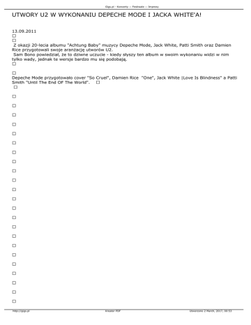 Gigs.pl - Koncerty :: Festiwale :: Imprezy UTWORY U2 W WYKONANIU DEPECHE MODE I JACKA WHITE'A! 13.09.2011 Z okazji 20-lecia albumu "Achtung Baby" muzycy Depeche Mode, Jack White, Patti Smith oraz Damien Rice przygotowali swoje aranżację utworów U2. Sam Bono powiedział, że to dziwne uczucie - kiedy słyszy ten album w swoim wykonaniu widzi w nim tylko wady, jednak te wersje bardzo mu się podobają. Depeche Mode przygotowało cover "So Cruel", Damien Rice "One", Jack White |Love Is Blindness" a Patti Smith "Until The End OF The World". http://gigs.pl Kreator PDF Utworzono 2 March, 2017, 00:53 Gigs.pl - Koncerty :: Festiwale :: Imprezy http://gigs.pl Kreator PDF Utworzono 2 March, 2017, 00:53
