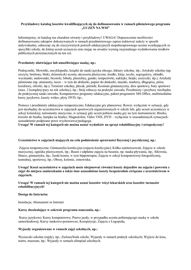Przykładowy katalog kosztów kwalifikujących się do dofinansowania w ramach pilotażowego programu „UCZEŃ NA WSI” Informujemy, że katalog ma charakter otwarty i przykładowy! UWAGA! Dopuszczenie możliwości dofinansowania zakupów dokonywanych w ramach przedmiotowego zapisu traktować należy w sposób indywidualny, odnosząc się do rzeczywistych potrzeb edukacyjnych niepełnosprawnego ucznia wynikających ze specyfiki szkoły, do której uczeń uczęszcza oraz mając na uwadze wymóg racjonalnego wydatkowania środków publicznych przeznaczonych na ten cel. Przedmioty ułatwiające lub umożliwiające naukę, np.: Podręczniki, Słowniki, encyklopedie, książki do nauki języka obcego, lektury szkolne, itp.; Artykuły szkolne (np. zeszyty, bruliony, bloki, dzienniczki ucznia, akcesoria plastyczne, kredki, kleje, teczki, segregatory, okładki, wycinanki, malowanki, brystole, bibuły, plasteliny, gumki, temperówki, naklejki, linijki, nożyczki, itp.); Artykuły piśmienne (np. atramenty, tusze – w tym do drukarki, papier do drukarki, mazaki, markery, długopisy, pióra, korektory, ołówki, itp.); Tornister szkolny, plecak, piórnik; Kostium gimnastyczny, dres sportowy, buty sportowe (max. 2 komplety/pary na rok szkolny), itp.; Strój roboczy na praktyki zawodu; Przedmioty i przybory niezbędne do praktycznej nauki zawodu; Komputerowe programy edukacyjne, pakiet programów MS Office, multimedialne kursy językowe, kasety wideo, płyty DVD, itp.; Pomoce i przedmioty edukacyjno-terapeutyczne; Edukacyjne gry planszowe; Rower, wyłącznie w sytuacji, gdy jest niezbędny do uczestnictwa w zajęciach sportowych organizowanych w szkole lub, gdy uczeń uczestniczy w sekcji kolarskiej; nstrumenty muzyczne, w sytuacji gdy uczeń pobiera naukę gry na tym instrumencie; Biurko, krzesło do biurka, lampka na biurko; Magnetofon, Video VHS, DVD – wyłącznie w uzasadnionych sytuacjachuzasadnienie podpisane przez wychowawcę/pedagoga. Uwaga! W ramach tej kategorii nie można uznać wydatków na sprzęt rehabilitacyjny i ortopedyczny! Uczestnictwo w zajęciach mających na celu podniesienie sprawności fizycznej i psychicznej, np.: Zajęcia terapeutyczne; Gimnastyka korekcyjna (zajęcia korekcyjne); Kółka zainteresowań; Zajęcia w szkole muzycznej, ognisku plastycznym, itp.; Basen i odpłatne zajęcia na basenie, np. nauka pływania, itp.; Siłownia, fitness, gimnastyka, itp.; Jazda konna, w tym hippoterapia; Zajęcia w sekcji komputerowej fotograficznej, teatralnej, sportowej, itp.; Obozy, kolonie, zimowiska. Uwaga! Koszt uczestnictwa w zajęciach może obejmować również koszty dojazdów na zajęcia i powrotu z zajęć do miejsca zamieszkania a także inne uzasadnione koszty bezpośrednio związane z uczestnictwem w zajęciach. Uwaga! W ramach tej kategorii nie można uznać kosztów wizyt lekarskich oraz kosztów turnusów rehabilitacyjnych! Dostęp do Internetu: Instalacja; Abonament za Internet. Kursy doszkalające w zakresie programu nauczania, np.: Kursy językowe; Kursy komputerowe; Prawo jazdy, w przypadku ucznia pobierającego naukę w szkole samochodowej; Kursy naukowo-poznawcze; Korepetycje; Zajęcia z Logopedą. Wyjazdy organizowane w ramach zajęć szkolnych, np.: Wycieczki szkolne (rajdy), itp.; Zielona/biała szkoła; Wyjazdy w ramach praktyk szkolnych; Wyjście do kina, teatru, muzeum, itp.; Wyjazdy w ramach olimpiad szkolnych.