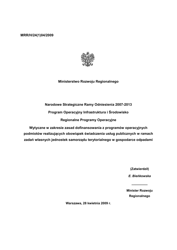 MRR/H/24(1)04/2009 Ministerstwo Rozwoju Regionalnego Narodowe Strategiczne Ramy Odniesienia 2007-2013 Program Operacyjny Infrastruktura i Środowisko Regionalne Programy Operacyjne Wytyczne w zakresie zasad dofinansowania z programów operacyjnych podmiotów realizujących obowiązek świadczenia usług publicznych w ramach zadań własnych jednostek samorządu terytorialnego w gospodarce odpadami (Zatwierdził) E. Bieńkowska _________ Minister Rozwoju Regionalnego Warszawa, 28 kwietnia 2009 r. SPIS TREŚCI Rozdział 1 – Podstawa prawna ...........................................................................................................................................3 Rozdział 2 – Definicje ..........................................................................................................................................................6 Rozdział 3 – Pomoc publiczna a usługi w ogólnym interesie gospodarczym ......................................................................9 w prawie wspólnotowym ......................................................................................................................................................9 Podrozdział 3.1 – Brak pomocy publicznej w rozumieniu art. 87 TWE..........................................................................10 Podrozdział 3.2 – Pomoc zgodna ze wspólnym rynkiem i nie podlegająca notyfikacji ..................................................11 Podrozdział 3.3 – Pomoc, która moŜe zostać uznana za zgodną z zasadami wspólnego rynku przez Komisję Europejską ....................................................................................................................................................................13 Rozdział 4 – Gospodarka odpadami w świetle prawa wspólnotowego..............................................................................14 Rozdział 5 – Gospodarka odpadami w prawie polskim i cele jej finansowania z programów operacyjnych ......................14 Rozdział 6 – Zakres zastosowania Wytycznych ................................................................................................................16 Rozdział 7 – Cel i przedmiot Wytycznych ..........................................................................................................................19 Rozdział 8 – Zobowiązanie do świadczenia usług publicznych .........................................................................................20 Podrozdział 8.1 – Uwagi wstępne .................................................................................................................................20 Sekcja 8.1.1 – Uwagi o charakterze technicznym .................................................................................................20 Podrozdział 8.2 – Zakład budŜetowy.............................................................................................................................20 Sekcja 8.2.1 – Uwagi wstępne ...............................................................................................................................20 Sekcja 8.2.2 – Sposób zobowiązania do świadczenia usług publicznych ..............................................................20 Sekcja 8.2.3 – Określenie szczegółowego zakresu obowiązku świadczenia usług publicznych ............................21 Sekcja 8.2.4 – Sposób wyboru podmiotu ...............................................................................................................22 Podrozdział 8.3 – Spółka komunalna ...........................................................................................................................22 Sekcja 8.3.1 – Uwagi wstępne ...............................................................................................................................22 Sekcja 8.3.2 – Sposób zobowiązania do świadczenia usług publicznych ..............................................................23 Sekcja 8.3.3 – Określenie szczegółowego zakresu obowiązku świadczenia usług publicznych ............................24 Sekcja 8.3.4 – Sposób wyboru podmiotu ...............................................................................................................25 Podrozdział 8.4 – Przedsiębiorca zewnętrzny...............................................................................................................25 Sekcja 8.4.1 – Uwagi wstępne ...............................................................................................................................25 Sekcja 8.4.2 – Sposób zobowiązania do świadczenia usług publicznych ..............................................................25 Sekcja 8.4.3 – Określenie szczegółowego zakresu obowiązku świadczenia usług publicznych ............................25 Sekcja 8.4.4 – Sposób wyboru podmiotu ...............................................................................................................26 Rozdział 9 – Ubieganie się o dofinansowanie ...................................................................................................................26 Rozdział 10 – Rekompensata............................................................................................................................................28 Podrozdział 10.1 – Ogólne wytyczne do obliczenia wysokości rekompensaty..............................................................28 Podrozdział 10.2 – Obliczanie wysokości dofinansowania - zakres stosowania mechanizmu luki finansowej..............32 Podrozdział 10.3 – Kontrola nadwyŜek i zasady zwrotu rekompensaty .......................................................................34 Rozdział 11 – Przejrzystość stosunków finansowych ........................................................................................................35 Roz