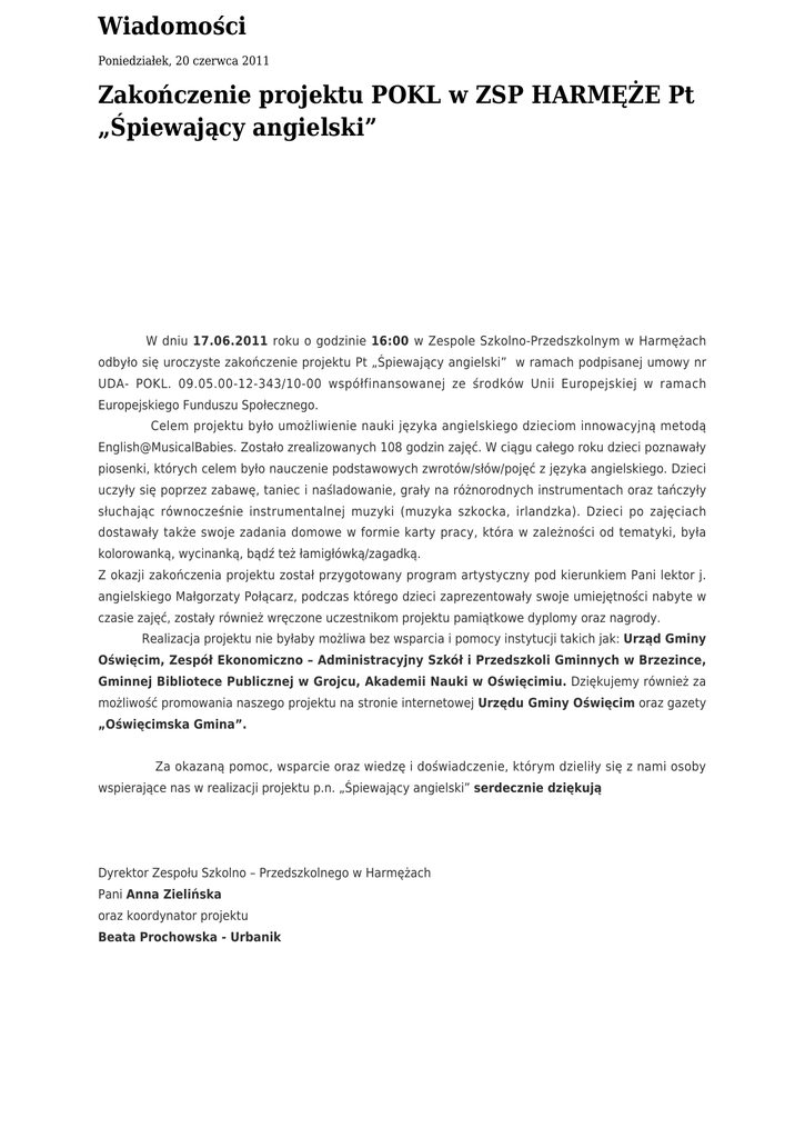 Wiadomości Poniedziałek, 20 czerwca 2011 Zakończenie projektu POKL w ZSP HARMĘŻE Pt „Śpiewający angielski” W dniu 17.06.2011 roku o godzinie 16:00 w Zespole Szkolno-Przedszkolnym w Harmężach odbyło się uroczyste zakończenie projektu Pt „Śpiewający angielski” w ramach podpisanej umowy nr UDA- POKL. 09.05.00-12-343/10-00 współfinansowanej ze środków Unii Europejskiej w ramach Europejskiego Funduszu Społecznego. Celem projektu było umożliwienie nauki języka angielskiego dzieciom innowacyjną metodą English@MusicalBabies. Zostało zrealizowanych 108 godzin zajęć. W ciągu całego roku dzieci poznawały piosenki, których celem było nauczenie podstawowych zwrotów/słów/pojęć z języka angielskiego. Dzieci uczyły się poprzez zabawę, taniec i naśladowanie, grały na różnorodnych instrumentach oraz tańczyły słuchając równocześnie instrumentalnej muzyki (muzyka szkocka, irlandzka). Dzieci po zajęciach dostawały także swoje zadania domowe w formie karty pracy, która w zależności od tematyki, była kolorowanką, wycinanką, bądź też łamigłówką/zagadką. Z okazji zakończenia projektu został przygotowany program artystyczny pod kierunkiem Pani lektor j. angielskiego Małgorzaty Połącarz, podczas którego dzieci zaprezentowały swoje umiejętności nabyte w czasie zajęć, zostały również wręczone uczestnikom projektu pamiątkowe dyplomy oraz nagrody. Realizacja projektu nie byłaby możliwa bez wsparcia i pomocy instytucji takich jak: Urząd Gminy Oświęcim, Zespół Ekonomiczno – Administracyjny Szkół i Przedszkoli Gminnych w Brzezince, Gminnej Bibliotece Publicznej w Grojcu, Akademii Nauki w Oświęcimiu. Dziękujemy również za możliwość promowania naszego projektu na stronie internetowej Urzędu Gminy Oświęcim oraz gazety „Oświęcimska Gmina”. Za okazaną pomoc, wsparcie oraz wiedzę i doświadczenie, którym dzieliły się z nami osoby wspierające nas w realizacji projektu p.n. „Śpiewający angielski” serdecznie dziękują Dyrektor Zespołu Szkolno – Przedszkolnego w Harmężach Pani Anna Zielińska oraz koordynator projektu Beata Prochowska - Urbanik