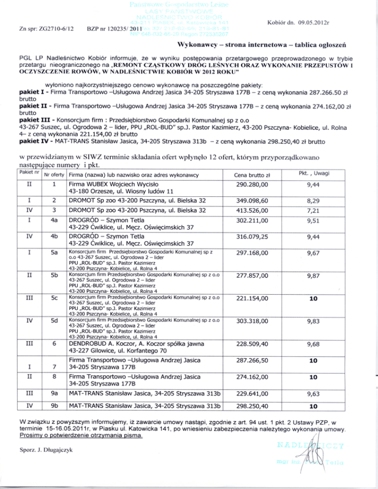 Kobiór dn. 09.05.2012r Zn spr: ZG2710-6/12 BZP nr 120235/20 II I .1, 7 Wykonawcy - strona internetowa - tablica ogłoszeń PGL LP Nadleśnictwo Kobiór informuje, że w wyniku postępowania przetargowego przeprowadzonego w trybie przetargu nieograniczonego na "REMONT CZĄSTKOWY DRÓG LEŚNYCH ORAZ WYKONANIE PRZEPUSTÓW I OCZYSZCZENIE ROWÓW, W NADLEŚNICTWIE KOBIÓR W 2012 ROKU" wyłoniono najkorzystniejszego cenowo wykonawcę na poszczególne pakiety: pakiet - Firma I Transportowo -Usługowa Andrzej Jasica 34-205 Stryszawa 177B - z ceną wykonania 287.266.50 zł brutto pakiet II - Firma Transportowo -Usługowa Andrzej Jasica 34-205 Stryszawa 177B - z ceną wykonania 274.162,00 zł brutto pakiet III - Konsorcjum firm: Przedsiębiorstwo Gospodarki Komunalnej sp z 0.0 43-267 Suszec, ul. Ogrodowa 2 - lider, PPU "ROL-BUD" spJ. Pastor Kazimierz, 43-200 Pszczyna- Kobielice, ul. Rolna 4- z ceną wykonania 221.154,00 zł brutto pakiet IV - MAT-TRANS w przewidzianym w SIWZ . następu lące numery Pakiet nr Stanisław Jasica, 34-205 Stryszawa 313b - z ceną wykonania 298.250,40 zł brutto . l terminie składania ofert wpłynęło 12 ofert, którym przyporządkowano pk Nr oferty Firma (nazwa) lub nazwisko oraz adres wykonawcy Cena brutto zł Pkt. , Uwagi II 1 Firma WUBEX Wojciech Wycisło 43-180 Orzesze, ul. Wiosny ludów 11 290.280,00 9,44 I 2 DROMOT Sp zoo 43-200 Pszczyna, ul. Bielska 32 349.098,60 8,29 IV 3 DROMOT Sp zoo 43-200 Pszczyna, ul. Bielska 32 413.526,00 7,21 I 4a DROGRqD - Szymon Tetla 43-229 Cwiklice, ul. Męcz. Oświęcimskich 37 302.211,00 9,51 IV 4b DROGRqD - Szymon Tetla 316.079,25 9,44 297.168,00 9,67 277.857,00 9,87 43-229 Cwiklice, ul. Męcz. Oświęcimskich 37 I 5a II 5b Konsorcjum firm Przedsiębiorstwo Gospodarki Komunalnej sp z 0.043-267 Suszec, ul. Ogrodowa2 - lider PPU "ROL-BUD" spJ. PastorKazimierz 43-200 Pszczyna- Kobielice, ul. Rolna 4 III 5c IV 5d III 6 Konsorcjum firm Przedsiębiorstwo Gospodarki Komunalnej sp z 0.0 43-267 Suszec, ul. Ogrodowa 2 - lider PPU "ROL-BUD" spJ. Pastor Kazimierz 43-200 Pszczyna- Kobielice, ul. Rolna 4 Konsorcjum firm Przedsiębiorstwo Gospodarki Komunalnej sp z 0.0 43-267 Suszec, ul. Ogrodowa 2 - lider PPU "ROL-BUD" spJ. Pastor Kazimierz 43-200 Pszczvna- Kobielice, ul. Rolna 4 Konsorcjum firm Przedsiębiorstwo Gospodarki Komunalnej sp z 0.0 43-267 Suszec, ul. Ogrodowa 2 - lider PPU "ROL-BUD" spJ. Pastor Kazimierz 43-200 Pszczyna- Kobielice ul. Rolna 4 DENDROBUD A. Koczor, A. Kaczor spółka jawna , 221.154,00 10 303.318,00 9,83 228.509,40 9,68 287.266,50 10 43-227 Gilowice, ul. Korfantego 70 Firma Transportowo -Usługowa Andrzej Jasica I 7 34-205 Stryszawa 177B II 8 Firma Transportowo -Usługowa Andrzej Jasica 34-205 Stryszawa 177B 274.162,00 10 III 9a MAT-TRANS Stanisław Jasica, 34-205 Stryszawa 313b 229.641,00 9,63 IV 9b MAT-TRANS Stanisław Jasica, 34-205 Stryszawa 313b 298.250,40 10 W związku z powyższym informujemy, iż zawarcie umowy nastąpi, zgodnie z art. 94 ust. 1 pkt. 2 Ustawy PZP, w terminie 15-16.05.2011r, w Piasku ul. Katowicka 141, po wniesieniu zabezpieczenia należytego wykonani!,! umowy. Prosimy o potwierdzenie otrzymania pisma. Sparz. J. Długajczyk