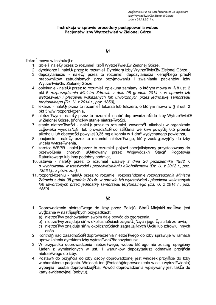 Załącznik Nr 2 do Zarządzenia nr 33 Dyrektora Izby Wytrzeźwień w Zielonej Górze z dnia 31.12.2014 r. Instrukcja w sprawie procedury postępowania wobec Pacjentów Izby Wytrzeźwień w Zielonej Górze §1 Ilekroć mowa w Instrukcji o: 1. izbie – należy przez to rozumieć Izbę Wytrzeźwień w Zielonej Górze, 2. dyrektorze – należy przez to rozumieć Dyrektora Izby Wytrzeźwień w Zielonej Górze, 3. depozytariuszu - należy przez to rozumieć depozytariusza kierującego pracą pracowników zatrudnionych przy przyjmowaniu i zwalnianiu pacjentów Izby Wytrzeźwień w Zielonej Górze, 4. opiekunie - należy przez to rozumieć opiekuna zamiany, o którym mowa w § 8 ust. 2 pkt 5 rozporządzenia Ministra Zdrowia z dnia 08 grudnia 2014 r. w sprawie izb wytrzeźwień i placówek wskazanych lub utworzonych przez jednostkę samorządu terytorialnego (Dz. U. z 2014 r., poz. 1850), 5. lekarzu - należy przez to rozumieć lekarza lub felczera, o którym mowa w § 8 ust. 2 pkt 3 w/w rozporządzenia, 6. nietrzeźwym - należy przez to rozumieć osobę doprowadzoną do Izby Wytrzeźwień w Zielonej Górze, będącą w stanie nietrzeźwości, 7. stanie nietrzeźwości - należy przez to rozumieć zawartość alkoholu w organizmie człowieka wynoszącą lub prowadzącą do stężenia we krwi powyżej 0,5 promila alkoholu lub obecności powyżej 0,25 mg alkoholu w 1 dm3 wydychanego powietrza, 8. pacjencie - należy przez to rozumieć nietrzeźwego, który został przyjęty do izby w celu wytrzeźwienia, 9. karetce WSPR - należy przez to rozumieć pojazd specjalistyczny przystosowany do przewożenia chorych użytkowany przez Wojewódzką Stację Pogotowia Ratunkowego lub inny podobny podmiot, 10. ustawie - należy przez to rozumieć ustawę z dnia 26 października 1982 r. o wychowaniu w trzeźwości i przeciwdziałaniu alkoholizmowi (Dz. U. z 2012 r., poz. 1356 t.j., z późn. zm.), 11. rozporządzeniu - należy przez to rozumieć rozporządzenie rozporządzenia Ministra Zdrowia z dnia 08 grudnia 2014r. w sprawie izb wytrzeźwień i placówek wskazanych lub utworzonych przez jednostkę samorządu terytorialnego (Dz. U. z 2014 r., poz. 1850). §2 1. Doprowadzenie nietrzeźwego do izby przez Policję, Straż Miejską możliwe jest wyłącznie w następujących przypadkach: a) nietrzeźwy zachowaniem swoim daje powód do zgorszenia, b) nietrzeźwy znajduje się w okolicznościach zagrażających jego życiu lub zdrowiu, c) nietrzeźwy znajduje się w okolicznościach zagrażających życiu lub zdrowiu innych osób. 2. Kontrolę nad zasadnością doprowadzenia nietrzeźwego do izby sprawuje w ramach upoważnienia dyrektora izby wytrzeźwień depozytariusz. 3. W przypadku doprowadzenia nietrzeźwego, wobec którego nie został spełniony żaden z wymienionych w ust. 1 warunków depozytariusz odmawia przyjęcia nietrzeźwego do izby. 4. Postawą do przyjęcia do izby osoby doprowadzonej jest wniosek przyjęcie do Izby w charakterze pacjenta. Wniosek ten (Protokół doprowadzenia w celu wytrzeźwienia) wypełnia osoba doprowadzająca. Powód doprowadzenia wpisywany jest także do karty ewidencyjnej (pobytu). 5. Funkcjonariusz Policji lub Straży Miejskiej/Gminnej sporządza protokół doprowadzenia w celu wytrzeźwienia w trzech egzemplarzach (po jednym dla doprowadzającego, izby i pacjenta). 6. Po stwierdzeniu przez depozytariusza, iż wniosek o przyjęcie (protokół doprowadzenia) zostały wypełnione, następuje badanie zawartości alkoholu w organizmie osoby doprowadzonej. Warunkiem przyjęcia do Izby jest wynik badania wskazujący na stan nietrzeźwości. 7. Jeden egzemplarz wydruku zawierającego wynik w/w badania dołącza się w sposób trwały ( za pomocą zszywacza) do karty ewidencyjnej (pobytu). 8. Osoba doprowadzona potwierdza własnoręcznym podpisem wykonanie badania na zawartość alkoholu w wydychanym powietrzu bądź braku zgody na wykonanie takiego badania. §3 1. Przed przyjęciem do izby lekarz przeprowadza badanie nietrzeźwego oraz stwierdza: a) brak objawów stanu nietrzeźwości uzasadniających umieszczenie w izbie lub placówce, albo b) potrzebę udzielenia pomocy doraźnej, która może być udzielona w izbie, albo c) potrzebę wykonania zabiegów higieniczno-sanitarnych, uwzględniając objawy nietrzeźwości oraz brak przeciwwskazań do umieszczenia w izbie, albo d) istnienie medycznych przesłanek skierowania do szpitala lub innego zakładu opieki zdrowotnej – uwzględniając objawy stanu nietrzeźwości oraz istnienie wskazań do hospitalizacji. 2. Opiekun winien każdorazowo uczestniczyć i w razie zaistnienia takiej potrzeby – udzielać pomocy lekarzowi w przeprowadzaniu badania osoby nietrzeźwej oraz w trakcie dokonywania wobec niej innych zabiegów medycznych. 3. W przypadku stwierdzenia lub podejrzenia u osoby doprowadzonej do izby wystąpienia istotnych zakłóceń funkcji zdrowotnych organizmu, lekarz obowiązany jest do natychmiastowego wezwania karetki WSPR. 4. Informacje o wyniku badania nietrzeźwego, lekarz umieszcza niezwłocznie w „karcie badania lekarskiego”. §4 1. O przyjęciu lub odmowie przyjęcia do izby nietrzeźwego decyduje z upoważnienia dyrektora izby wytrzeźwień depozytariusz, biorąc pod uwagę wypełnienie przesłanek doprowadzenia, o których mowa w § 2 ust. 1, stopień zawartości alkoholu w organizmie oraz opinię lekarza. 2. Odmowa przyjęcia do izby nietrzeźwego jest, z zastrzeżeniem w § 2 ust. 3, możliwa jedynie w przypadkach, gdy: a) brak jest objawów stanu nietrzeźwości, b) stan jego zdrowia według opinii lekarza wymaga udzielenia świadczeń, których w izbie nie można udzielić lub które powinny być zastosowane w zakładzie opieki zdrowotnej, c) dyrektor izby, depozytariusz, bądź osoba upoważniona biorąc pod uwagę stan zdrowia oraz objawów nietrzeźwości, podejmie taką decyzję na podstawie pisemnego wniosku członka najbliższej rodziny osoby doprowadzonej lub jej opiekuna prawnego złożonego prz