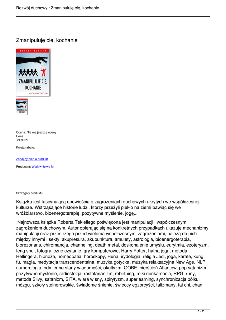 Rozwój duchowy : Zmanipuluję cię, kochanie Zmanipuluję cię, kochanie Ocena: Nie ma jeszcze oceny Cena 24,90 zł Kwota rabatu: Zadaj pytanie o produkt Producent: Wydawnictwo M Szczegóły produktu Książka jest fascynującą opowieścią o zagrożeniach duchowych ukrytych we współczesnej kulturze. Wstrząsające historie ludzi, którzy przeżyli piekło na ziemi bawiąc się we wróżbiarstwo, bioenergoterapię, pozytywne myślenie, jogę... Najnowsza książka Roberta Tekieliego poświęcona jest manipulacji i współczesnym zagrożeniom duchowym. Autor opierając się na konkretnych przypadkach ukazuje mechanizmy manipulacji oraz przestrzega przed wieloma współczesnymi zagrożeniami, należą do nich między innymi : sekty, akupresura, akupunktura, amulety, astrologia, bioenergoterapia, biorezonans, chiromancja, channeling, death metal, doskonalenie umysłu, eurytmia, ezoteryzm, feng shui, fotograficzne czytanie, gry komputerowe, Harry Potter, hatha joga, metoda Hellingera, hipnoza, homeopatia, horoskopy, Huna, irydologia, religia Jedi, joga, karate, kung fu, magia, medytacja transcendentalna, muzyka gotycka, muzyka relaksacyjna New Age. NLP. numerologia, odmienne stany wiadomości, okultyzm. OOBE. pierścień Atlantów, pop satanizm, pozytywne myślenie, radiestezja, rastafarianizm, rebirthing, reiki reinkarnacja, RPG, runy, metoda Silvy, satanizm, SITA, wiara w sny, spirytyzm, superlearning, synchronizacja półkul mózgu, szkoły steinerowskie, świadome śnienie, świeccy egzorcyści, talizmany, tai chi, chan, 1/2 Rozwój duchowy : Zmanipuluję cię, kochanie tarot, muzyka techno, trash metal, uwolnienia egipskie, wahadełko, WITCH, wróżbiarstwo, wywoływanie duchów, zen. Książka będzie ciekawą lektura dla tych wszystkich którzy chcą poznać drugie dno tak bardzo popularnych obecnie praktyk i zjawisk. Autor czerpie są wiedzę z ogromnej ilość spotkań z ludźmi którzy sami doświadczali konkretnych zagrożeń duchowych. Książka jest pełna opisów konkretnych przypadków. Opinie Nikt jeszcze nie oceniał tego produktu. 2/2 Powered by TCPDF (www.tcpdf.org)