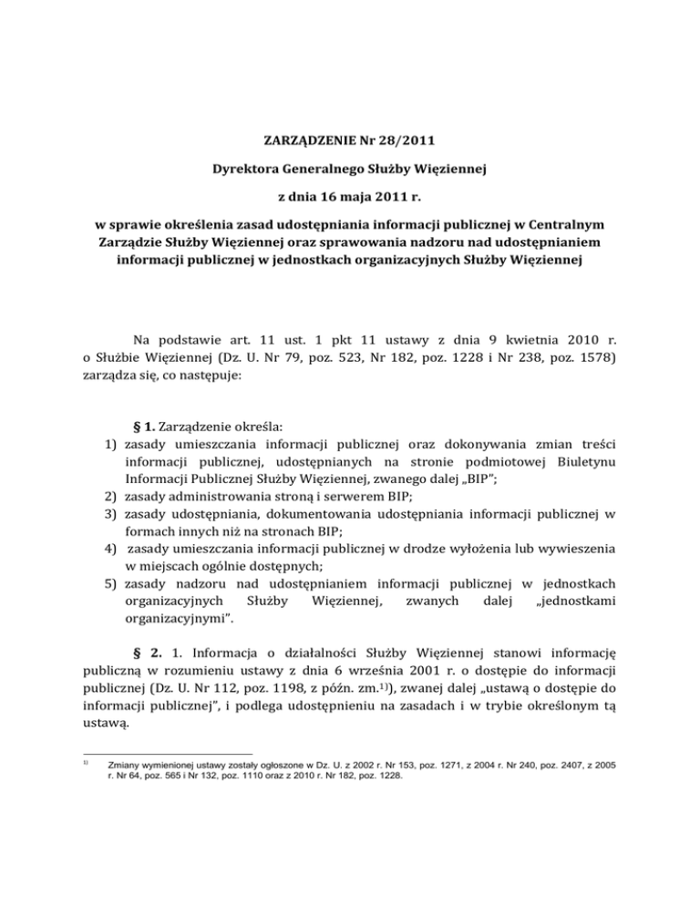 ZARZĄDZENIE Nr 28/2011 Dyrektora Generalnego Służby Więziennej z dnia 16 maja 2011 r. w sprawie określenia zasad udostępniania informacji publicznej w Centralnym Zarządzie Służby Więziennej oraz sprawowania nadzoru nad udostępnianiem informacji publicznej w jednostkach organizacyjnych Służby Więziennej Na podstawie art. 11 ust. 1 pkt 11 ustawy z dnia 9 kwietnia 2010 r. o Służbie Więziennej (Dz. U. Nr 79, poz. 523, Nr 182, poz. 1228 i Nr 238, poz. 1578) zarządza się, co następuje: 1) 2) 3) 4) 5) § 1. Zarządzenie określa: zasady umieszczania informacji publicznej oraz dokonywania zmian treści informacji publicznej, udostępnianych na stronie podmiotowej Biuletynu Informacji Publicznej Służby Więziennej, zwanego dalej „BIP”; zasady administrowania stroną i serwerem BIP; zasady udostępniania, dokumentowania udostępniania informacji publicznej w formach innych niż na stronach BIP; zasady umieszczania informacji publicznej w drodze wyłożenia lub wywieszenia w miejscach ogólnie dostępnych; zasady nadzoru nad udostępnianiem informacji publicznej w jednostkach organizacyjnych Służby Więziennej, zwanych dalej „jednostkami organizacyjnymi”. § 2. 1. Informacja o działalności Służby Więziennej stanowi informację publiczną w rozumieniu ustawy z dnia 6 września 2001 r. o dostępie do informacji publicznej (Dz. U. Nr 112, poz. 1198, z późn. zm.1)), zwanej dalej „ustawą o dostępie do informacji publicznej”, i podlega udostępnieniu na zasadach i w trybie określonym tą ustawą. 1) Zmiany wymienionej ustawy zostały ogłoszone w Dz. U. z 2002 r. Nr 153, poz. 1271, z 2004 r. Nr 240, poz. 2407, z 2005 r. Nr 64, poz. 565 i Nr 132, poz. 1110 oraz z 2010 r. Nr 182, poz. 1228. 2. Za udostępnianie informacji publicznej odpowiedzialni są kierownicy jednostek organizacyjnych, zwani dalej „kierownikami jednostek”. 3. Szczegółowe procedury udostępniania informacji publicznej w jednostkach organizacyjnych określają kierownicy jednostek. § 3. 1. W Centralnym Zarządzie Służby Więziennej, zwanym dalej „CZSW”, koordynację zadań określonych w § 1 realizuje Zespół Organizacji Współpracy Zewnętrznej w Biurze Dyrektora Generalnego Służby Więziennej, zwany dalej „Zespołem”. 2. Do realizacji zadań określonych w § 1 pkt 1 i 2, powołuje się redakcję BIP CZSW w składzie: 1) redaktorzy BIP: a) funkcjonariusze lub pracownicy Zespołu, b) wyznaczeni funkcjonariusze lub pracownicy: okręgowych inspektoratów Służby Więziennej, zwanych dalej „OISW”, Centralnego Ośrodka Szkolenia Służby Więziennej w Kaliszu, zwanego dalej „COSSW w Kaliszu”, ośrodka szkolenia Służby Więziennej w Kulach, zwanego dalej „OSSW w Kulach”, ośrodka doskonalenia kadr Służby Więziennej w Popowie, zwanego dalej „ODK SW w Popowie”; 2) administrator strony podmiotowej BIP – funkcjonariusze lub pracownicy Biura Informatyki i Łączności CZSW; 3) administrator serwera BIP – funkcjonariusze lub pracownicy Biura Informatyki i Łączności CZSW; 4) realizatorzy: a) funkcjonariusze lub pracownicy Zespołu oraz Biura Informatyki i Łączności CZSW, b) wyznaczeni funkcjonariusze lub pracownicy OISW, COSSW w Kaliszu, OSSW w Kulach oraz ODK SW w Popowie. 3. Kierownicy jednostek wyznaczają redaktorów i realizatorów BIP, którzy odpowiadają za realizację zadań określonych w § 1 pkt 1, w jednostkach organizacyjnych. § 4. Do zadań redaktorów BIP należy w szczególności: 1) koordynowanie procesu edycyjnego; 2) opracowywanie treści zakładek BIP i pozyskiwanie informacji z poszczególnych komórek organizacyjnych CZSW, zgodnie z zakresem ich merytorycznej działalności; 3) nadzór merytoryczny i organizacyjny nad zmianami strony podmiotowej BIP; 4) projektowanie struktury i określenie funkcjonalności BIP; 2 5) szkolenie w zakresie dostępu do informacji publicznej i nadzór nad realizacją zadań merytorycznych związanych z właściwym funkcjonowaniem strony podmiotowej BIP; 6) przekazywanie ministrowi właściwemu ds. informatyzacji informacji niezbędnych do zamieszczania na stronie głównej BIP oraz powiadamiania tego ministra o zmianach treści tych informacji. § 5. 1. Za techniczną eksploatację BIP, o której mowa w § 1 pkt 2, odpowiada Biuro Informatyki i Łączności CZSW. 2. Dyrektor Biura Informatyki i Łączności w CZSW wyznacza z podległych funkcjonariuszy lub pracowników administratora strony i serwera BIP i jego zastępcę. § 6. Do zadań administratora strony podmiotowej BIP należy w szczególności: 1) przydzielanie uprawnień dla redaktorów i realizatorów BIP; 2) prowadzenie ewidencji kont przydzielonych funkcjonariuszom lub pracownikom jednostek organizacyjnych w zakresie edycji BIP; 3) prowadzenie kontroli dziennika strony BIP w każdy dzień roboczy; 4) dokonywanie niezbędnych zmian w instrukcji dotyczącej korzystania z informacji zawartych na stronie BIP; 5) kopiowanie informacji zgromadzonych w bazie danych na stronach BIP na odrębne informatyczne nośniki informacji, nie później niż dobę po zaistnieniu tych zmian; 6) prowadzenie szkoleń dla osób odpowiadających za stronę techniczną BIP w jednostkach organizacyjnych. § 7. Do zadań administratora serwera BIP należy w szczególności: 1) zapewnienie zabezpieczenia treści informacji publicznej udostępnianej w BIP, w szczególności ochrona przed celowym spowolnieniem lub uniemożliwieniem dostępu do zasobów BIP; 2) tworzenie kopii bezpieczeństwa dla serwera, na którym znajduje się strona podmiotowa BIP; 3) sporządzenie wykazu serwerów podlegających tworzeniu i archiwizacji kopii zapasowych; 4) sporządzenie wykazu aplikacji podlegających tworzeniu i archiwizacji kopii zapasowych; 5) sporządzenie ewidencji kopii zapasowych systemu informatycznego strony podmiotowej BIP; 6) dbałość o spełnienie minimalnych wymagań dla systemów teleinformatycznych; 7) dbałość o rozwiązania chroniące strony BIP przed celowy