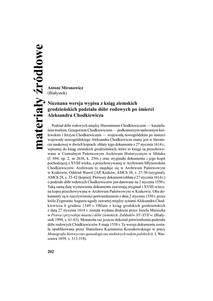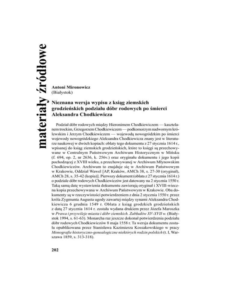 materiały źródłowe Antoni Mironowicz (Białystok) Nieznana wersja wypisu z ksiąg ziemskich grodzieńskich podziału dóbr rodowych po śmierci Aleksandra Chodkiewicza Podział dóbr rodowych między Hieronimem Chodkiewiczem — kasztelanem trockim, Grzegorzem Chodkiewiczem — podkomorzym nadwornym królewskim i Jerzym Chodkiewiczem — wojewodą nowogródzkim po śmierci wojewody nowogródzkiego Aleksandra Chodkiewicza znany jest w literaturze naukowej w dwóch kopiach: oblaty tego dokumentu z 27 stycznia 1614 r., wpisanej do ksiąg ziemskich grodzieńskich, które to księgi są przechowywane w Centralnym Państwowym Archiwum Historycznym w Mińsku (f. 694, op. 2, nr 2636, k. 256v.) oraz oryginału dokumentu i jego kopii pochodzącej z XVIII wieku, a przechowywanej w Archiwum Młynowskim Chodkiewiczów. Archiwum to znajduje się w Archiwum Państwowym w Krakowie, Oddział Wawel [AP, Kraków, AMCh 38, s. 27-30 (oryginał), AMCh 28, s. 35-42 (kopia)]. Pierwszy dokument (oblata z 27 stycznia 1614 r.) o podziale dóbr rodowych Chodkiewiczów jest datowany na 2 stycznia 1550 r. Taką samą datę wystawienia dokumentu zawierają oryginał i XVIII-wieczna kopia przechowywana w Archiwum Państwowym w Krakowie. Oba dokumenty są w rzeczywistości potwierdzeniem z dnia 2 stycznia 1550 r. przez króla Zygmunta Augusta ugody zawartej między synami Aleksandra Chodkiewicza 6 grudnia 1549 r. Oblata z ksiąg grodzkich grodzieńskich z datą 27 stycznia 1614 r. została wydana drukiem przez Józefa Maroszka w Prawa i przywileje miasta i dóbr ziemskich. Zabłudów XV-XVII w. (Białystok 1994, s. 61-63). Monarcha raz jeszcze dokonał potwierdzenia podziału dóbr rodowych Chodkiewiczów 8 maja 1558 r. Ta wersja dokumentu została opublikowana przez Stanisława Kazimierza Kossakowskiego w pracy Monografie historyczno-genealogiczne niektórych rodzin polskich (t. I, Warszawa 1859, s. 313-318). 202 W Oddziale Rękopisów Wileńskiej Biblioteki Uniwersyteckiej w Wilnie znajdują się wypisy dwóch dokumentów o podziale dóbr rodowych Chodkiewiczów z ksiąg ziemskich grodzieńskich [F4 – 36715 (A – 3901), k. 5965]. Oba zostały wpisane do ksiąg ziemskich grodzieńskich pod datą 27 stycznia 1614 r. Pierwszy zawiera pełną wersję potwierdzenia z dnia 2 stycznia 1550 r. przez króla Zygmunta Augusta podziału dóbr rodowych między Hieronimem Chodkiewiczem, Grzegorzem Chodkiewiczem i Jerzym Chodkiewiczem po śmierci wojewody nowogródzkiego Aleksandra Chodkiewicza, a drugi — potwierdzenie monarsze tego samego dokumentu z 8 maja 1558 r. Oba potwierdzenia królewskie zawierają cały dokument ustanowiony i podpisany przez synów Aleksandra Chodkiewicza w dniu 6 grudnia 1549 r. w Brzostowicy. Biorąc pod uwagę znane wersje dokumentu (rękopiśmienne i drukowane), wartym przytoczenia jest jej wileńska wersja, która różni się od pozostałych w wielu aspektach. Wypisy wileńskie różnią się wersją językową i niektórymi zwrotami. Przywoływane wypisy są kompletne i przez to stanowią doskonałe źródło do badań nad dziejami rodu Chodkiewiczów w XVI wieku. Najważniejszą zaletą tych wypisów jest najbliższa oryginałowi treść i forma przekazu. Opublikowane dotychczas dwie wersje dokumentu zawierają liczne nieścisłości powstałe albo z niedokładnego odczytania przez wydawców drukowanego źródła, albo z nieprecyzyjnego wykonania przez pisarza wpisu dokumentu do ksiąg ziemskich lub sporządzenia jego kopii albo też z jej niekompletności. Oba wydania zawierają treść dokumentu w nieco odmiennej wersji językowej od tej, która jest w wypisach wileńskich. Zwracam również uwagę na wartość poznawczą dokumentu, w którym podane są najwcześniejsze informacje dotyczące zamku w Gródku, dworu w Zabłudowie czy Dojlid. W publikowanym dokumencie znajdują się inne nazwy geograficzne i topograficzne, nazwy miejscowości, które są bardzo przydatne w badaniach nad dziejami regionu. Wypis wileński jest przede wszystkim ważnym źródłem do poznania losów rodu Chodkiewiczów po śmierci wojewody nowogródzkiego Aleksandra 28 maja 1549 r.1 W wyniku dokonanego podziału ziem Aleksandra Chodkiewicza jego syn Grzegorz, podkomorzy nadworny, uzyskał zamek Supraśl (Gródek), większą część Puszczy Błudowskiej, dwór w Zabłudowie, dobra Choroszcz, Fasty, Karakule; Hieronim, kasztelan trocki, uzyskał Bychów, Mysz i Lebedę, a Jerzy, wojewoda nowogródzki, część Puszczy Błudowskiej, Brzostowicę Wielką i Roś. Wymienione powyższe względy raz jeszcze zachęcają do opublikowania dokumentu z 6 grudnia 1549 r. potwierdzonego przez króla Zygmunta Augusta 8 maja 1558 r. Badacz powinien zwrócić przede wszystkim uwagę na 1 J. Jasnowski, Chodkiewicz Aleksander, „Polski Słownik Biograficzny”, t. III, Kraków 1937, s. 354-355. Por. też biogramy synów Aleksandra Chodkiewicza – Hieronima, Grzegorza i Jerzego, tamże, t. III, s. 358-361. 203 treść dokumentu, jego formę i wersję językową. Przygotowując omawiany dokument do wydania wskazałem na różnice faktograficzne i językowe, które występują w tekście wypisu wileńskiego i publikowanych wersjach dokumentu. Nie wszystkie różnice językowe zawarte w publikowanych wersjach zostały tu przywołane. Wskazano jedynie na te rozbieżności, które wpływają na zrozumienie treści dokumentu lub wskazują na jego cechy językowe. Podział dóbr rodowych między Hieronimem Chodkiewiczem – kasztelanem trockim, Grzegorzem Chodkiewiczem – podkomorzym nadwornym królewskim i Jerzym Chodkiewiczem – wojewodą nowogródzkim po śmierci wojewody nowogródzkiego Aleksandra Chodkiewicza dokonany 6 grudnia 1549 r. Odział Rękopisów Biblioteki Uniwersytetu Wileńskiego w Wilnie, F4 – 36715 (A – 3901), k. 59-65. Wypis z Ksiąg Ziemskich Grodzieńskich k. 59 Leta od Narodzenia Syna Bożego 1614, miesiąca Janwara, 27 dnia. Oznaymujemy tym naszym nynieyszym i na potym buduczym, komu budet potreba toho weda