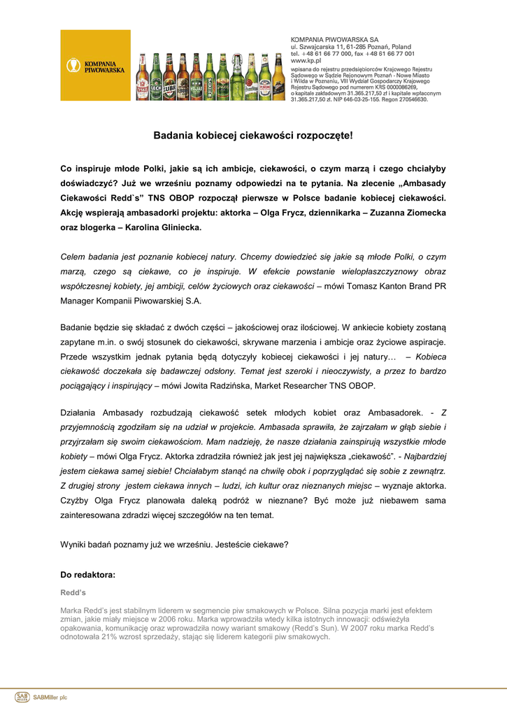 Badania kobiecej ciekawości rozpoczęte! Co inspiruje młode Polki, jakie są ich ambicje, ciekawości, o czym marzą i czego chciałyby doświadczyć? Już we wrześniu poznamy odpowiedzi na te pytania. Na zlecenie „Ambasady Ciekawości Redd`s” TNS OBOP rozpoczął pierwsze w Polsce badanie kobiecej ciekawości. Akcję wspierają ambasadorki projektu: aktorka – Olga Frycz, dziennikarka – Zuzanna Ziomecka oraz blogerka – Karolina Gliniecka. Celem badania jest poznanie kobiecej natury. Chcemy dowiedzieć się jakie są młode Polki, o czym marzą, czego są ciekawe, co je inspiruje. W efekcie powstanie wielopłaszczyznowy obraz współczesnej kobiety, jej ambicji, celów życiowych oraz ciekawości – mówi Tomasz Kanton Brand PR Manager Kompanii Piwowarskiej S.A. Badanie będzie się składać z dwóch części – jakościowej oraz ilościowej. W ankiecie kobiety zostaną zapytane m.in. o swój stosunek do ciekawości, skrywane marzenia i ambicje oraz życiowe aspiracje. Przede wszystkim jednak pytania będą dotyczyły kobiecej ciekawości i jej natury… – Kobieca ciekawość doczekała się badawczej odsłony. Temat jest szeroki i nieoczywisty, a przez to bardzo pociągający i inspirujący – mówi Jowita Radzińska, Market Researcher TNS OBOP. Działania Ambasady rozbudzają ciekawość setek młodych kobiet oraz Ambasadorek. - Z przyjemnością zgodziłam się na udział w projekcie. Ambasada sprawiła, że zajrzałam w głąb siebie i przyjrzałam się swoim ciekawościom. Mam nadzieję, że nasze działania zainspirują wszystkie młode kobiety – mówi Olga Frycz. Aktorka zdradziła również jak jest jej największa „ciekawość”. - Najbardziej jestem ciekawa samej siebie! Chciałabym stanąć na chwilę obok i poprzyglądać się sobie z zewnątrz. Z drugiej strony jestem ciekawa innych – ludzi, ich kultur oraz nieznanych miejsc – wyznaje aktorka. Czyżby Olga Frycz planowała daleką podróż w nieznane? Być może już niebawem sama zainteresowana zdradzi więcej szczegółów na ten temat. Wyniki badań poznamy już we wrześniu. Jesteście ciekawe? Do redaktora: Redd’s Marka Redd’s jest stabilnym liderem w segmencie piw smakowych w Polsce. Silna pozycja marki jest efektem zmian, jakie miały miejsce w 2006 roku. Marka wprowadziła wtedy kilka istotnych innowacji: odświeżyła opakowania, komunikację oraz wprowadziła nowy wariant smakowy (Redd’s Sun). W 2007 roku marka Redd’s odnotowała 21% wzrost sprzedaży, stając się liderem kategorii piw smakowych. Redd’s dostępny jest w trzech wariantach smakowych trafiających w różne potrzeby i gusty odbiorców: Redd's Apple: wprowadzony do portfela Kompanii Piwowarskiej w lipcu 2000. Wywodzi się z Republiki Południowej Afryki, gdzie piwa z aromatem owocowym są produktami wysoko cenionymi ze względu na swoje głęboko orzeźwiające właściwości. Redd`s Apple to wyjątkowo orzeźwiający smak zielonych jabłek. Redd's Red: wprowadzony do portfela Kompanii Piwowarskiej w październiku 2004. To połączenie tradycyjnego piwa z sokiem malinowym. Jest to doskonała alternatywa dla osób lubiących piwo z sokiem. Redd's Red to wyjątkowe piwo o klarownym, delikatnie czerwonym zabarwieniu i malinowym zapachu, produkowane z naturalnie warzonej bazy piwnej z dodatkiem specjalnie przygotowanej zaprawy malinowej. Redd`s Red to wyjątkowa kombinacja charakterystycznej piwnej goryczki z kuszącym smakiem malin. Redd's Sun: wprowadzony do portfela Kompanii Piwowarskiej w kwietniu 2006. To piwo o smaku cytrusowym. Redd`s Sun to promienie słońca ukryte w butelce. Doskonale orzeźwia i gasi pragnienie. To piwo o smaku cytrusowym jest doskonałą oferta dla amatorów egzotycznych owoców i niebanalnych wrażeń smakowych. To kombinacja piwa (97%) i cytrusowej owocowej zaprawy (3%). Kompania Piwowarska - Lider branży piwowarskiej w Polsce Kompania Piwowarska jest największym przedsiębiorstwem piwowarskim w Polsce. Kilkusetletnie doświadczenia w warzeniu piwa, nowoczesne technologie i rygorystyczne przestrzeganie zasad produkcji na światowym poziomie gwarantują najwyższą jakość naszych produktów. Do portfela marek KP należą najpopularniejsze polskie piwa - m.in. Tyskie, Żubr, Lech, Dębowe Mocne, Redd's, a także międzynarodowe marki premium: Pilsner Urquell, Grolsch oraz Peroni Nastro Azzurro. Kompania Piwowarska (utworzona w 1999 roku) posiada trzy browary (w Tychach, Poznaniu i Białymstoku) oraz oddziały handlowe na terenie całego kraju. Kompania Piwowarska prowadzi także działalność społeczną nastawioną na walkę z wykluczeniem społecznym na tle ubóstwa oraz programy edukacyjne popularyzujące odpowiedzialność i umiar w konsumowaniu alkoholu. Wielkość sprzedaży osiągniętej przez KP w roku finansowym zakończonym 31 marca 2011 r. wyniosła 14,1 mln hektolitrów piwa. SABMiller – jeden z największych na świecie producentów piwa Kompania Piwowarska jest częścią jednego z największych na świecie producentów piwa - SABMiller plc. Grupa produkuje lub dystrybuuje piwo na sześciu kontynentach, a jej ogólnoświatowy portfel obejmuje międzynarodowe piwa premium, takie jak Grolsch, Miller Genuine Draft, Peroni Nastro Azzurro czy Pilsner Urquell oraz czołowe marki lokalne, takie jak Aquila, Castle, Miller Lite, Snow czy Tyskie. SABMiller jest jedną z największych na świecie (poza USA) firm rozlewających produkty Coca-Coli. W roku finansowym zakończonym 31 marca 2011 SABMiller osiągnął przychody w wysokości 28,3 mld USD oraz wypracował zysk brutto (EBITA) w wysokości 5 mld USD. SABMiller plc jest notowany na giełdach papierów wartościowych w Londynie i Johannesburgu. Dodatkowych informacji udzielają Jakub Góralczyk Specjalista ds. brand PR KOMPANIA PIWOWARSKA S.A. [email protected] tel. +48 61 667 74 59; faks: +48 61 667 76 75 tel. kom.:+48 695 520 519 Piotr Komorowski Senior Consultant Q&Aconsulting [email protected] tel.: +48 61 8525849; faks: 