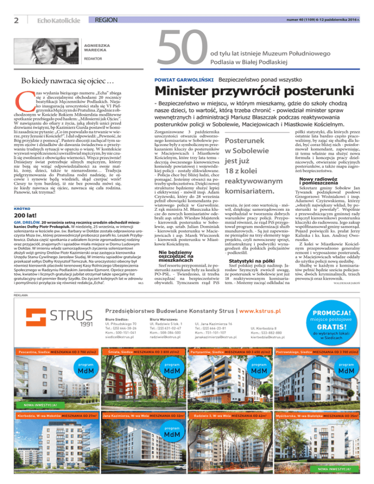 2 EchoKatolickie region agnieszKa warecKa reDaktor Bo kiedy nawraca się ojciec… C zas wydania bieżącego numeru „Echa” zbiega się z diecezjalnymi obchodami 20 rocznicy beatyfikacji Męczenników Podlaskich. Niejako inauguracją uroczystości stała się VI Pielgrzymka Mężczyzn do Pratulina. Zgodnie z obchodzonym w Kościele Rokiem Miłosierdzia modlitewne spotkanie przebiegało pod hasłem: „Miłosierni jak Ojciec”. W nawiązaniu do ofiary z życia, jaką złożyli unici przed drzwiami świątyni, bp Kazimierz Gurda postawił w homilii zasadnicze pytanie: „Co im pozwalało na trwanie w wierze, przy Jezusie i Kościele?”. I dał odpowiedź: „Pewność, że Bóg przyjdzie z pomocą”. Pasterz diecezji zachęcał tym samym ojców i dziadków do dawania świadectwa o przeżywaniu trudnych sytuacji w oparciu o wiarę. W kontekście wyzwań współczesności uwrażliwiał mężczyzn, by nie czuli się zwolnieni z obowiązku wierności. Wręcz przeciwnie! Dzisiejszy świat potrzebuje silnych mężczyzn, którzy nie boją się wziąć odpowiedzialności za swoje matki, żony, dzieci, także te nienarodzone… Tradycja pielgrzymowania do Pratulina rodzi nadzieję, że ojcowie i synowie będą wiedzieli, skąd czerpać wzór! Cieszy to tym bardziej, iż nie bez powodu mówi się, że kiedy nawraca się ojciec, nawraca się cała rodzina. Panowie, tak trzymać! KrótKo 200 lat! gm. dRelów. 20 września setną rocznicę urodzin obchodził mieszkaniec dołhy Piotr Prokopiuk. W niedzielę, 25 września, w intencji solenizanta w kościele pw. św. Barbary w Dołdze została odprawiona uroczysta Msza św., której przewodniczył proboszcz parafii ks. leszek Przybyłowicz. Dalsza część spotkania z udziałem licznie zgromadzonej rodziny oraz przyjaciół, znajomych i sąsiadów miała miejsce w Domu ludowym w Dołdze. W imieniu władz samorządowych życzenia solenizantowi złożyli wójt gminy Drelów Piotr kazimierski oraz zastępca kierownika Urzędu Stanu cywilnego Jarosław Siudaj. W imieniu sąsiadów gratulacje przekazał sołtys Dołhy krzysztof tomczuk. na uroczystości obecny był również kierownik placówki terenowej kasy rolniczego Ubezpieczenia Społecznego w radzyniu Podlaskim Jarosław ejsmont. oprócz prezentów, kwiatów i licznych gratulacji jubilat otrzymał także specjalny list gratulacyjny od premier Beaty Szydło. Do życzeń kolejnych lat w zdrowiu MlS i pomyślności przyłącza się również redakcja „echa”. 50 numer 40 (1109) 6-12 października 2016 r. od tylu lat istnieje Muzeum Południowego Podlasia w Białej Podlaskiej POwIaT gaRwOLIŃSkI Bezpieczeństwo ponad wszystko Minister przywrócił posterunki - Bezpieczeństwo w miejscu, w którym mieszkamy, gdzie do szkoły chodzą nasze dzieci, to wartość, którą trzeba chronić - powiedział minister spraw wewnętrznych i administracji Mariusz Błaszczak podczas reaktywowania posterunków policji w Sobolewie, Maciejowicach i Miastkowie Kościelnym. Zorganizowane 3 października uroczystości otwarcia odtworzonego komisariatu w Sobolewie połączone były z symbolicznym przekazaniem kluczy do posterunków w Maciejowicach i Miastkowie Kościelnym, które trzy lata temu decyzją ówczesnego kierownictwa komendy powiatowej i wojewódzkiej policji - zostały zlikwidowane. - Policja chce być bliżej ludzi, chce pomagać. Jesteśmy otwarci na potrzeby społeczeństwa. Dzięki nowej strukturze będziemy służyć lepiej i efektywniej - mówił insp. Adam Czyżewski, który do 28 września pełnił obowiązki komendanta powiatowego policji w Garwolinie. Z rąk ministra M. Błaszczaka klucze do nowych komisariatów odebrali: asp. sztab. Wiesław Majsterek - kierownik posterunku w Sobolewie, asp. sztab. Julian Dominiak - kierownik posterunku w Maciejowicach i asp. Marek Wieczorek - kierownik posterunku w Miastkowie Kościelnym. Nie będziemy oszczędzać na mieszkańcach Szef resortu przypomniał, że posterunki zamykane były za koalicji PO-PSL. - Twierdzono, iż trzeba oszczędzać na bezpieczeństwie obywateli. Tymczasem rząd PiS Posterunek w Sobolewie jest już 18 z kolei reaktywowanym komisariatem. uważa, że jest ono wartością - mówił, dziękując samorządowcom za współudział w tworzeniu dobrych warunków pracy policji. Przypomniał również, że rząd PiS przygotował program modernizacji służb mundurowych. - Są już zapewnione pieniądze na trzy elementy tego projektu, czyli nowoczesny sprzęt, infrastrukturę i podwyżki wynagrodzeń dla polskich policjantów - podkreślił. Statystyki na półki Szef polskiej policji nadinsp. Jarosław Szymczyk zwrócił uwagę, że posterunek w Sobolewie jest już 18 reaktywowanym komisariatem. - Możemy zacząć odkładać na półki statystyki, dla których przez ostatnie lata bardzo często pracowaliśmy, by zająć się służbą dla ludzi, być coraz bliżej nich - poinformował komendant, zapewniając, iż temu właśnie ma służyć nowa formuła i koncepcja pracy dzielnicowych, otwieranie policyjnych posterunków, a także mapa zagrożeń bezpieczeństwa. Nowy radiowóz i pomieszczenia Sekretarz gminy Sobolew Jan Tywanek podziękował posłowi Grzegorzowi Woźniakowi i insp. Adamowi Czyżewskiemu, którzy „włożyli największy wkład, by posterunki te powstały”. Wspólnie z przewodniczącym gminnej rady wręczył kierownikowi posterunku kluczyki do radiowozu. Jego zakup współfinansował gminy samorząd. Pojazd poświęcili ks. prałat Jerzy Kalinka i ks. kan. Andrzej Oworuszko. Z kolei w Miastkowie Kościelnym przeprowadzono generalny remont i wyposażono posterunek, a w Maciejowicach władze oddały do użytku policji nową siedzibę. Służbę w każdym z komisariatów pełnić będzie sześciu policjantów, dwóch kryminalnych, trzech prewencji oraz kierownik. WALDEMAR JAROń Reklama PROMOCJA! miejsce postojowe GRATIS! do wybranych lokali w Siedlcach 6 www.echokatolickie.pl Region tyle tys. osób będzie studiować w roku akade