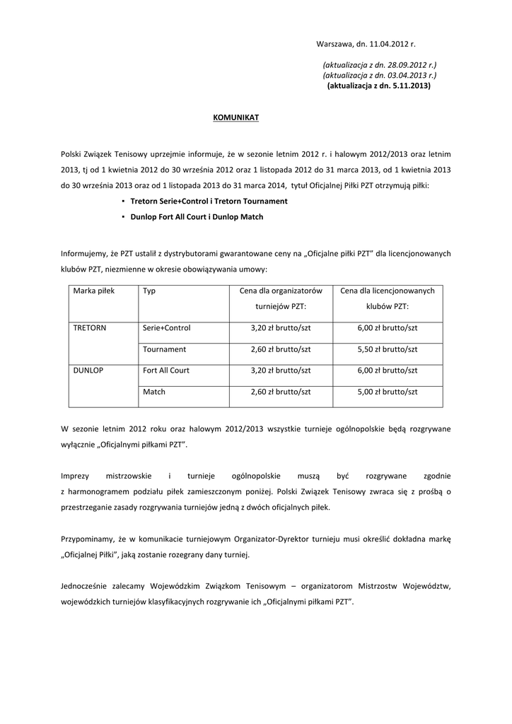 Warszawa, dn. 11.04.2012 r. (aktualizacja z dn. 28.09.2012 r.) (aktualizacja z dn. 03.04.2013 r.) (aktualizacja z dn. 5.11.2013) KOMUNIKAT Polski Związek Tenisowy uprzejmie informuje, że w sezonie letnim 2012 r. i halowym 2012/2013 oraz letnim 2013, tj od 1 kwietnia 2012 do 30 września 2012 oraz 1 listopada 2012 do 31 marca 2013, od 1 kwietnia 2013 do 30 września 2013 oraz od 1 listopada 2013 do 31 marca 2014, tytuł Oficjalnej Piłki PZT otrzymują piłki: ▪ Tretorn Serie+Control i Tretorn Tournament ▪ Dunlop Fort All Court i Dunlop Match Informujemy, że PZT ustalił z dystrybutorami gwarantowane ceny na „Oficjalne piłki PZT” dla licencjonowanych klubów PZT, niezmienne w okresie obowiązywania umowy: Marka piłek TRETORN DUNLOP Typ Cena dla organizatorów Cena dla licencjonowanych turniejów PZT: klubów PZT: Serie+Control 3,20 zł brutto/szt 6,00 zł brutto/szt Tournament 2,60 zł brutto/szt 5,50 zł brutto/szt Fort All Court 3,20 zł brutto/szt 6,00 zł brutto/szt Match 2,60 zł brutto/szt 5,00 zł brutto/szt W sezonie letnim 2012 roku oraz halowym 2012/2013 wszystkie turnieje ogólnopolskie będą rozgrywane wyłącznie „Oficjalnymi piłkami PZT”. Imprezy mistrzowskie i turnieje ogólnopolskie muszą być rozgrywane zgodnie z harmonogramem podziału piłek zamieszczonym poniżej. Polski Związek Tenisowy zwraca się z prośbą o przestrzeganie zasady rozgrywania turniejów jedną z dwóch oficjalnych piłek. Przypominamy, że w komunikacie turniejowym Organizator-Dyrektor turnieju musi określić dokładna markę „Oficjalnej Piłki”, jaką zostanie rozegrany dany turniej. Jednocześnie zalecamy Wojewódzkim Związkom Tenisowym – organizatorom Mistrzostw Województw, wojewódzkich turniejów klasyfikacyjnych rozgrywanie ich „Oficjalnymi piłkami PZT”. Informujemy także, że w ramach współpracy z dystrybutorami oficjalnych piłek ustalono, że przy zamówieniach większej ilości piłek lub umowach o stałej współpracy, kluby i inne organizacje – członkowie Polskiego Związku Tenisowego mogą ubiegać się o dodatkowe rabaty, każdorazowo uzgadniane indywidualnie. Podział imprez ogólnopolskich i imprez mistrzowskich PZT na okres od 1 kwietnia 2012 do 30 września 2012 oraz od 1 listopada 2012 do 30 marca 2013 oraz od 1 kwietnia 2013 do 30 września 2013, które zostaną rozegrane „Oficjalną Piłką PZT” Kategoria wiekowa 1.04.2012 - 30.09.2012 01.11.2012 – 30.03.2013 1.04.2013 - 30.09.2013 1.11-2013-31.03.2014 do lat 12 - skrzaty Dunlop Tretorn Tretorn Dunlop do lat 14 - młodzicy Tretorn Dunlop Dunlop Tretorn do lat 16 - kadeci Tretorn Dunlop Dunlop Tretorn do lat 18 - juniorzy Dunlop Tretorn Tretorn Dunlop Kobiety i Mężczyźni Dunlop/Tretorn Dunlop/Tretorn Dunlop/Tretorn Dunlop/Tretorn Adresy dystrybutorów Oficjalnych Piłek PZT: PIŁKI TRETORN Sprzęt Tenisowy Ireneusz Maciocha ul. Czorsztyńska 30; 71-163 Szczecin tel. 91 486 29 20 fax. (91) 486 29 27 PIŁKI DUNLOP W&W Racket Sports M. i M. Wieczorek S.C ul. Św. Rocha 53 42-200 Częstochowa Tel. (34) 365 58 59, 606 44 88 50, 600 35 35 90 e-mail: [email protected]