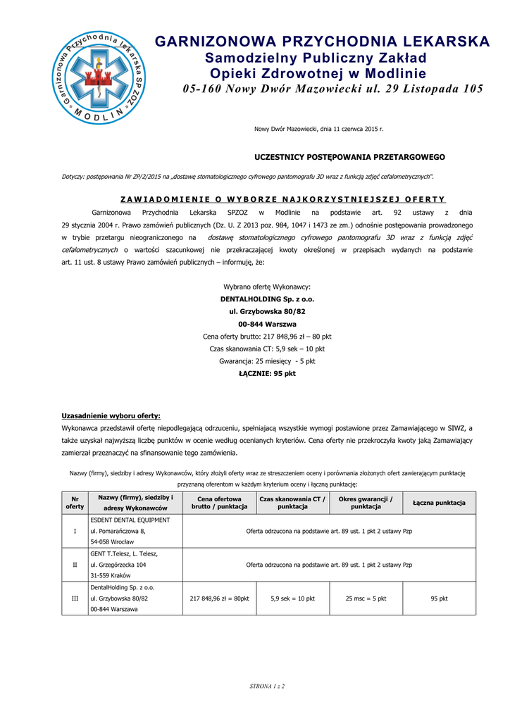 h o d ni a GARNIZONOWA PRZYCHODNIA LEKARSKA le Samodzielny Publiczny Zakład Opieki Zdrowotnej w Modlinie ar i z o no w a P yc k rz G ar n s k a S P ZO Z * * M 05-160 Nowy Dwór Mazowiecki ul. 29 Listopada 105 O D L I N Nowy Dwór Mazowiecki, dnia 11 czerwca 2015 r. UCZESTNICY POSTĘPOWANIA PRZETARGOWEGO Dotyczy: postępowania Nr ZP/2/2015 na „dostawę stomatologicznego cyfrowego pantomografu 3D wraz z funkcją zdjęć cefalometrycznych“. ZAWIADOMIENIE O WYBORZE NAJKORZYSTNIEJSZEJ OFERTY Garnizonowa Przychodnia Lekarska SPZOZ w Modlinie na podstawie art. 92 ustawy z dnia 29 stycznia 2004 r. Prawo zamówień publicznych (Dz. U. Z 2013 poz. 984, 1047 i 1473 ze zm.) odnośnie postępowania prowadzonego w trybie przetargu nieograniczonego na dostawę stomatologicznego cyfrowego pantomografu 3D wraz z funkcją zdjęć cefalometrycznych o wartości szacunkowej nie przekraczającej kwoty określonej w przepisach wydanych na podstawie art. 11 ust. 8 ustawy Prawo zamówień publicznych – informuję, że: Wybrano ofertę Wykonawcy: DENTALHOLDING Sp. z o.o. ul. Grzybowska 80/82 00-844 Warszwa Cena oferty brutto: 217 848,96 zł – 80 pkt Czas skanowania CT: 5,9 sek – 10 pkt Gwarancja: 25 miesięcy - 5 pkt ŁĄCZNIE: 95 pkt Uzasadnienie wyboru oferty: Wykonawca przedstawił ofertę niepodlegającą odrzuceniu, spełniajacą wszystkie wymogi postawione przez Zamawiającego w SIWZ, a także uzyskał najwyższą liczbę punktów w ocenie według ocenianych kryteriów. Cena oferty nie przekroczyła kwoty jaką Zamawiający zamierzał przeznaczyć na sfinansowanie tego zamówienia. Nazwy (firmy), siedziby i adresy Wykonawców, który złożyli oferty wraz ze streszczeniem oceny i porównania złożonych ofert zawierającym punktację przyznaną oferentom w każdym kryterium oceny i łączną punktację: Nr oferty Nazwy (firmy), siedziby i adresy Wykonawców Cena ofertowa brutto / punktacja Czas skanowania CT / punktacja Okres gwarancji / punktacja Łączna punktacja ESDENT DENTAL EQUIPMENT I ul. Pomarańczowa 8, Oferta odrzucona na podstawie art. 89 ust. 1 pkt 2 ustawy Pzp 54-058 Wrocław GENT T.Telesz, L. Telesz, II ul. Grzegórzecka 104 Oferta odrzucona na podstawie art. 89 ust. 1 pkt 2 ustawy Pzp 31-559 Kraków DentalHolding Sp. z o.o. III ul. Grzybowska 80/82 217 848,96 zł = 80pkt 5,9 sek = 10 pkt 00-844 Warszawa STRONA 1 z 2 25 msc = 5 pkt 95 pkt h o d ni a GARNIZONOWA PRZYCHODNIA LEKARSKA le ar i z o no w a P yc k rz G ar n s k a S P ZO Z 05-160 Nowy Dwór Mazowiecki ul. 29 Listopada 105 * * M Samodzielny Publiczny Zakład Opieki Zdrowotnej w Modlinie O D L I N W przedmiotowym postępowaniu zostału odrzucone dwie oferty: Oferta nr I ESDENT DENTAL EQUIPMENT ul. Pomarańczowa 8, 54-058 Wrocław Uzasadnienie faktyczne: Wykonawca zaoferował urządzenie, którego parametry techniczne nie spełniają wymogów postawionych przez Zamawiającego w Specyfikacji Istotnych Warunków Zamówienia. Zgodnie z załącznikiem Nr 2 do SIWZ – Szczegółowym Opisie Przedmiotu Zamówienia, Zamawiajacy wymagał zaoferowania urządzeń spełniających m.in. następujący parametr: „Pole obrazowania CT nie mniejsze niż 10 x 8cm” . Wykonawca zaoferował wartość: „Tak 9X9 cm” Biorąc pod uwagę kryteria postawione przez Zamawiającego, a w szczególności fakt, iż Wykonawca nie mogł zaproponować urządzenia o parametrach gorszych niż określone przez Zamawiającego, ofertę Wykonawcy uznaje się ofertę za odrzuconą. Uzasadnienie prawne: Ofertę odrzucono na podstawie art. 89 ust. 1 pkt. 2 ustawy z dnia 29 stycznia 2004 r. Prawo zamówień publicznych (Dz. U. Z 2013 poz. 984, 1047 i 1473 ze zm.) Oferta nr II GENT T.Telesz, L.Telesz ul. Grzegórzecka 104 31-559 Kraków Uzasadnienie faktyczne: Zgodnie z załącznikiem Nr 2 do SIWZ, tj. „Szczegółowym Opisem Przedmiotu Zamówienia” w pozycji nr 12, Zamawiający wymagał podania nazwy i wersji oprogramowania. Wykonawca nie uzupełnił prawidłowo formularza, poprzez nie wpisanie numeru wersji oprogramowania, jaką zamierzał zaoferować. W związku z powyższym, treść oferty nie odpowiada treści Specyfikacji Istotnych Warunków Zamówienia. Uzasadnienie prawne: Ofertę odrzucono na podstawie art. 89 ust. 1 pkt. 2 ustawy z dnia 29 stycznia 2004 r. Prawo zamówień publicznych (Dz. U. Z 2013 poz. 984, 1047 i 1473 ze zm.) Umowa ws. udzielenia zamówienia publicznego będzie zawarta w dniu 16 czerwca 2015 r. o godzinie 12:00 w siedzibie Zamawiającego. (ul. 29 Listopada 105, 05-160 Nowy Dwór Mazowiecki). W przypadku braku możliwości podpisania umowy przez przedstawiciela Wykonawcy w wyznaczonym terminie, uprzejmie proszę o informację dot. przesłania umowy drogą pocztową. .................................................. Podpis kierownika Zamawiającego STRONA 2 z 2