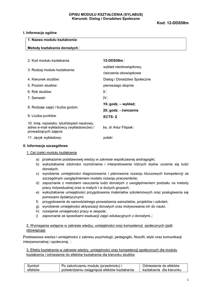 OPISU MODUŁU KSZTAŁCENIA (SYLABUS) Kierunek: Dialog i Doradztwo Społeczne Kod: 12-DDS58m I. Informacje ogólne 1. Nazwa modułu kształcenia: Metody kształcenia dorosłych 2. Kod modułu kształcenia 3. Rodzaj modułu kształcenia: 12-DDS58m wykład nieobowiązkowy, ćwiczenia obowiązkowe 4. Kierunek studiów: Dialog i Doradztwo Społeczne 5. Poziom studiów: pierwszego stopnia 6. Rok studiów: II 7. Semestr: IV 8. Rodzaje zajęć i liczba godzin: 10. godz. – wykład; 20. godz. - ćwiczenia 9. Liczba punktów ECTS: 2 10. Imię, nazwisko, tytuł/stopień naukowy, adres e-mail wykładowcy (wykładowców) / prowadzących zajęcia ks. dr Artur Filipiak 11. Język wykładowy: polski II. Informacje szczegółowe 1. Cel (cele) modułu kształcenia a) przekazanie podstawowej wiedzy w zakresie współczesnej andragogiki; b) wykształcenie zdolności rozróżniania i interpretowania różnych stylów uczenia się ludzi dorosłych; c) wyrobienie umiejętności diagnozowania i planowania rozwoju kluczowych kompetencji ze szczególnym uwzględnieniem modelu rozwoju pracowników; d) zapoznanie z metodami nauczania ludzi dorosłych z uwzględnieniem podziału na metody pracy indywidualnej oraz w małych i w dużych grupach; e) wykształcenie umiejętności przygotowania materiałów szkoleniowych oraz posługiwania się pomocami dydaktycznymi; f) przygotowanie do samodzielnego prowadzenia warsztatów, projektów i szkoleń; g) wyrobienie umiejętności aktywizacji dorosłych oraz motywowania ich do nauki; h) rozwijanie umiejętności pracy w zespole; i) zapoznanie ze sposobami ewaluacji zajęć edukacyjnych z dorosłymi.. 2. Wymagania wstępne w zakresie wiedzy, umiejętności oraz kompetencji społecznych (jeśli obowiązują) Podstawowa wiedza i umiejętności z zakresu psychologii, pedagogiki, filozofii, etyki oraz komunikacji interpersonalnej i społecznej. 3. Efekty kształcenia w zakresie wiedzy, umiejętności oraz kompetencji społecznych dla modułu kształcenia i odniesienie do efektów kształcenia dla kierunku studiów Symbol efektów Po zakończeniu modułu (przedmiotu) i potwierdzeniu osiągnięcia efektów kształcenia Odniesienie do efektów kształcenia dla kierunku 1 OPISU MODUŁU KSZTAŁCENIA (SYLABUS) Kierunek: Dialog i Doradztwo Społeczne Kod: 12-DDS58m kształcenia _01 student: studiów samodzielnie charakteryzuje specyfikę kształcenia dorosłych DiDS_W05; DiDS_W06, DiDS_W07; DiDS_W09; DiDS_U02; DiDS_W08; DiDS_U01; DiDS_K01; DiDS_W02; DiDS_W05; DiDS_W07; DiDS_U02; DiDS_U10; DiDS_W08; DiDS_W09; DiDS_K03; DiDS_K04; wskazuje różnice między stylami uczenia się człowieka dorosłego zna metody diagnozowania i planowania rozwoju kluczowych kompetencji człowieka dorosłego dobiera metody właściwe dla pracy warsztatowej i szkolenia dorosłych wyszukuje i poprawnie stosuje środki dydaktyczne odpowiednie dla kształcenia dorosłych samodzielnie lub w zespole sporządza projekt warsztatów i szkolenia _02 _03 _04 _05 _06 _07 zna i stosuje metody aktywizacji i motywowania dorosłych do nauki _08 jest otwarty i kreatywny w korzystaniu z dziedzictwa kulturowego ludzkości w nauczaniu dorosłych _09 korzysta z osiągnięć współczesnej andragogiki i nauk o komunikacji _10 wybiera i prawidłowo stosuje metody ewaluacji zajęć DiDS_W09; DiDS_U06; DiDS_U06; DiDS_W07; DiDS_U02; DiDS_U04; DiDS_K03, DiDS_W08; DiDS_U01; DiDS_U05; DiDS_U06; DiDS_K04; DiDS_W13; DiDS_U02; DiDS_U03; DiDS_K06; DiDS_W07; DiDS_W08; DiDS_W12; DiDS_U01; DiDS_U06; DiDS_W08; DiDS_U02; DiDS_K07; 4. Treści kształcenia Wykłady Nazwa modułu kształcenia: Metody kształcenia dorosłych Symbol treści kształcenia Opis treści kształcenia Odniesienie do efektów kształcenia modułu TK_01 Andragogika - zarys teorii nauczania/uczenia się dorosłych _01; _09 TK_02 Style uczenia się dorosłych i ich diagnozowanie _02; _05 TK_03 Kontrakt edukacyjny w nauczaniu/uczeniu się dorosłych _04 TK_04 Rola nauczyciela/trenera/facylitatora _03; _09 TK_05 TK_06 TK_07 TK_08 TK_09 Trudności w nauczaniu/uczeniu się dorosłych aktywizacja i motywowanie do nauki Planowanie/organizacja/logistyka szkoleń i warsztatów Specyfika i metodologia szkoleń pracowniczych Ćwiczenia i narzędzia do pracy indywidualnej, w małych grupach i w dużej grupie Gry edukacyjne, demonstracje dydaktyczne i metody aktywizujące w nauczaniu/uczeniu się dorosłych _04; _05; _07 _06 _03; _04 _04; _05; _04; _05; _07 TK_10 Materiały szkoleniowe i pomoce dydaktyczne _05; _08 TK_11 Ewaluacja zajęć; przeniesienie treści warsztatów i szkoleń na grunt zawodowy _09; _10 2 OPISU MODUŁU KSZTAŁCENIA (SYLABUS) Kierunek: Dialog i Doradztwo Społeczne Kod: 12-DDS58m Ćwiczenia Nazwa modułu kształcenia: Metody kształcenia dorosłych Symbol treści kształcenia TK_02 TK_03 TK_05 TK_06 TK_07 TK_08 TK_09 Opis treści kształcenia Odniesienie do efektów kształcenia modułu Style uczenia się dorosłych i ich diagnozowanie _05 Kontrakt edukacyjny w nauczaniu/uczeniu się dorosłych Trudności w nauczaniu/uczeniu się dorosłych aktywizacja i motywowanie do nauki Planowanie/organizacja/logistyka szkoleń i warsztatów Specyfika i metodologia szkoleń pracowniczych Ćwiczenia i narzędzia do pracy indywidualnej, w małych grupach i w dużej grupie Gry edukacyjne, demonstracje dydaktyczne i metody aktywizujące w nauczaniu/uczeniu się dorosłych _04 _04; _05; _07 _06 _04; _05; _04; _05; _04; _05; _07 TK_10 Materiały szkoleniowe i pomoce dydaktyczne _05; _08 TK_11 Ewaluacja zajęć; przeniesienie treści warsztatów i szkoleń na grunt zawodowy _09; _10 5. Zalecana literatura Aleksander P. N., Udane szkolenie. Przewodnik szkoleń i warsztatów, Kielce 2007. Knowles S. M., Holton III E. F., Swanson R. A., Edukacja dorosłych. Podręcznik akademicki, Warszawa 2009. Maksim A., Wojnowska M., Motywacja osób dorosłych do podejmowania dalszego kształcenia, „Edukacja Dorosłych” 2-3 (2002) s. 73-80 Malewski M., Od nauczania do uczenia się. O paradygmatycz