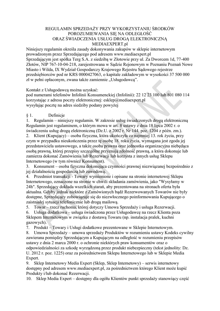 REGULAMIN SPRZEDAŻY PRZY WYKORZYSTANIU ŚRODKÓW POROZUMIEWANIA SIĘ NA ODLEGŁOŚĆ ORAZ ŚWIADCZENIA USŁUG DROGĄ ELEKTRONICZNĄ MEDIAEXPERT.pl Niniejszy regulamin określa zasady dokonywania zakupów w sklepie internetowym prowadzonym przez Sprzedającego pod adresem www.mediaexpert.pl Sprzedającym jest spółka Terg S.A. z siedzibą w Złotowie przy ul. Za Dworcem 1d, 77-400 Złotów, NIP 767-10-04-218, zarejestrowana w Sądzie Rejonowym w Poznaniu Poznań Nowe Miasto i Wilda, IX Wydział Gospodarczy Krajowego Rejestru Sądowego rejestrze przedsiębiorców pod nr KRS 0000427063, o kapitale zakładowym w wysokości 37 500 000 zł w pełni opłaconym, zwana także zamiennie „Usługodawcą”. Kontakt z Usługodawcą można uzyskać: pod numerami telefonów Infolinii Konsumenckiej (Infolinii): 22 12 23 100 lub 801 080 114 korzystając z adresu poczty elektronicznej: [email protected] wysyłając pocztę na adres siedziby podany powyżej § 1. Definicje 1. Regulamin – niniejszy regulamin. W zakresie usług świadczonych drogą elektroniczną Regulamin jest regulaminem, o którym mowa w art. 8 ustawy z dnia 18 lipca 2002 r. o świadczeniu usług drogą elektroniczną (Dz.U. z 2002 r. Nr 144, poz. 1204 z późn. zm.). 2. Klient (Kupujący) – osoba fizyczna, która ukończyła co najmniej 13. rok życia, przy czym w przypadku nieukończenia przez tę osobę 18. roku życia, wymagana jest zgoda jej przedstawiciela ustawowego, a także osoba prawna oraz jednostka organizacyjna niebędąca osobą prawną, której przepisy szczególne przyznają zdolność prawną, a która dokonuje lub zamierza dokonać Zamówienia lub Rezerwacji lub korzysta z innych usług Sklepu Internetowego (w tym również Konsument). 3. Konsument – osoba fizyczna dokonująca czynności prawnej niezwiązanej bezpośrednio z jej działalnością gospodarczą lub zawodową. 4. Przedmiot transakcji - Towary wymienione i opisane na stronie internetowej Sklepu Internetowego, oznaczone na stronie w chwili składania zamówienia, jako "Wysyłamy w 24h". Sprzedający dokłada wszelkich starań, aby prezentowana na stronach oferta była aktualna. Gdyby jednak niektóre z Zamówionych bądź Rezerwowanych Towarów nie były dostępne, Sprzedający zobowiązuje się do niezwłocznego poinformowania Kupującego o zaistniałej sytuacji telefonicznie lub drogą mailową. 5. Towar – rzecz ruchoma, której dotyczy Umowa Sprzedaży i usługa Rezerwacji. 6. Usługa dodatkowa – usługa świadczona przez Usługodawcę na rzecz Klienta poza Sklepem Internetowym w związku z dostawą Towaru (np. instalacja pralek, kuchni gazowych). 7. Produkt – Towary i Usługi dodatkowe prezentowane w Sklepie Internetowym. 8. Umowa Sprzedaży – umowa sprzedaży Produktów w rozumieniu ustawy Kodeks cywilny zawierana pomiędzy Sprzedającym a Kupującym na odległość w rozumieniu przepisów ustawy z dnia 2 marca 2000 r. o ochronie niektórych praw konsumentów oraz o odpowiedzialności za szkodę wyrządzoną przez produkt niebezpieczny (tekst jednolity: Dz. U. 2012 r. poz. 1225) oraz za pośrednictwem Sklepu Internetowego lub w Sklepie Media Expert. 9. Sklep Internetowy Media Expert (Sklep, Sklep Internetowy) – serwis internetowy dostępny pod adresem www.mediaexpert.pl, za pośrednictwem którego Klient może kupić Produkty i/lub dokonać Rezerwacji. 10. Sklep Media Expert – dostępny dla ogółu Klientów punkt sprzedaży stanowiący część znajdującej się na terytorium Rzeczypospolitej Polskiej sieci handlowej działającej pod marką Media Expert. 11. Strona – Usługodawca i Klient. 12. Strona Sklepu – każda strona bądź podstrona WWW znajdująca się pod adresem www.mediaexpert.pl 13. Rezerwacja – usługa rezerwacji Produktów dokonywana przez Klienta za pośrednictwem Sklepu Internetowego, które mogą zostać zakupione w wybranym przez Klienta Sklepie Media Expert. 14. Zamówienie – oświadczenie woli Klienta określające jednoznacznie rodzaj i ilość Produktów, zmierzające bezpośrednio do zawarcia Umowy Sprzedaży na odległość za pośrednictwem Sklepu Internetowego. 15. Odbiór w sklepie – Zamówienie zgodnie z definicją powyżej, z określonym miejscem odbioru w jednym z punktów wskazanych na Stronie Sklepu 16. Dystrybutor Regionalny – Astral spółka z o.o. z siedzibą w Rzeszowie przy ul. Baczyńskiego 6, 35-210 Rzeszów wpisana do Rejestru Przedsiębiorców prowadzonego przez Sąd Rejonowy w Rzeszowie XII Wydział Gospodarczy Krajowego Rejestru Sądowego pod numerem KRS 0000108761, NIP: 813-21-99-474, kapitał zakładowy: 50 040 zł 17. CZOK – Centrum Zdalnej Obsługi Klienta, zwane także Infolinią, czynne w dniach i godzinach podanych na Stronie Sklepu. § 2. Zasady ogólne 1. Warunkiem złożenia Zamówienia w Sklepie Internetowym przez Kupującego jest zapoznanie się z Regulaminem i akceptacja jego postanowień przed zawarciem umowy sprzedaży lub umowy o świadczenie usług drogą elektroniczną. 2. W celu korzystania z usług świadczonych na podstawie niniejszego Regulaminu Klient powinien posiadać: Przeglądarkę internetową: Internet Explorer w wersji nie starszej niż 8.0 lub Mozilla FireFox w wersji nie starszej niż 3.0 lub Chrome w wersji nie starszej niż 16.0 lub Opera w wersji nie starszej niż 10.0 lub Safari w wersji nie starszej niż 5.0, włączoną obsługę Java Script, aktywny adres e-mail, a rozdzielczość ekranu preferowana na co najmniej 1024x768 pikseli. Użytkownik może wyrazić zgodę na włączenie obsługi plików Cookies. Szczegółowe informacje o celu przechowywania i uzyskiwania dostępu do informacji za pomocą plików Cookies, a także możliwości określenia przez Użytkownika warunków przechowywania lub uzyskiwania dostępu do informacji zawartych w plikach Cookies, za pomocą ustawień oprogramowania zainstalowanego w wykorzystywanym przez Użytkownika telekomunikacyjnym urządzeniu końcowym lub konfiguracji usługi znajdują się w: http://ww